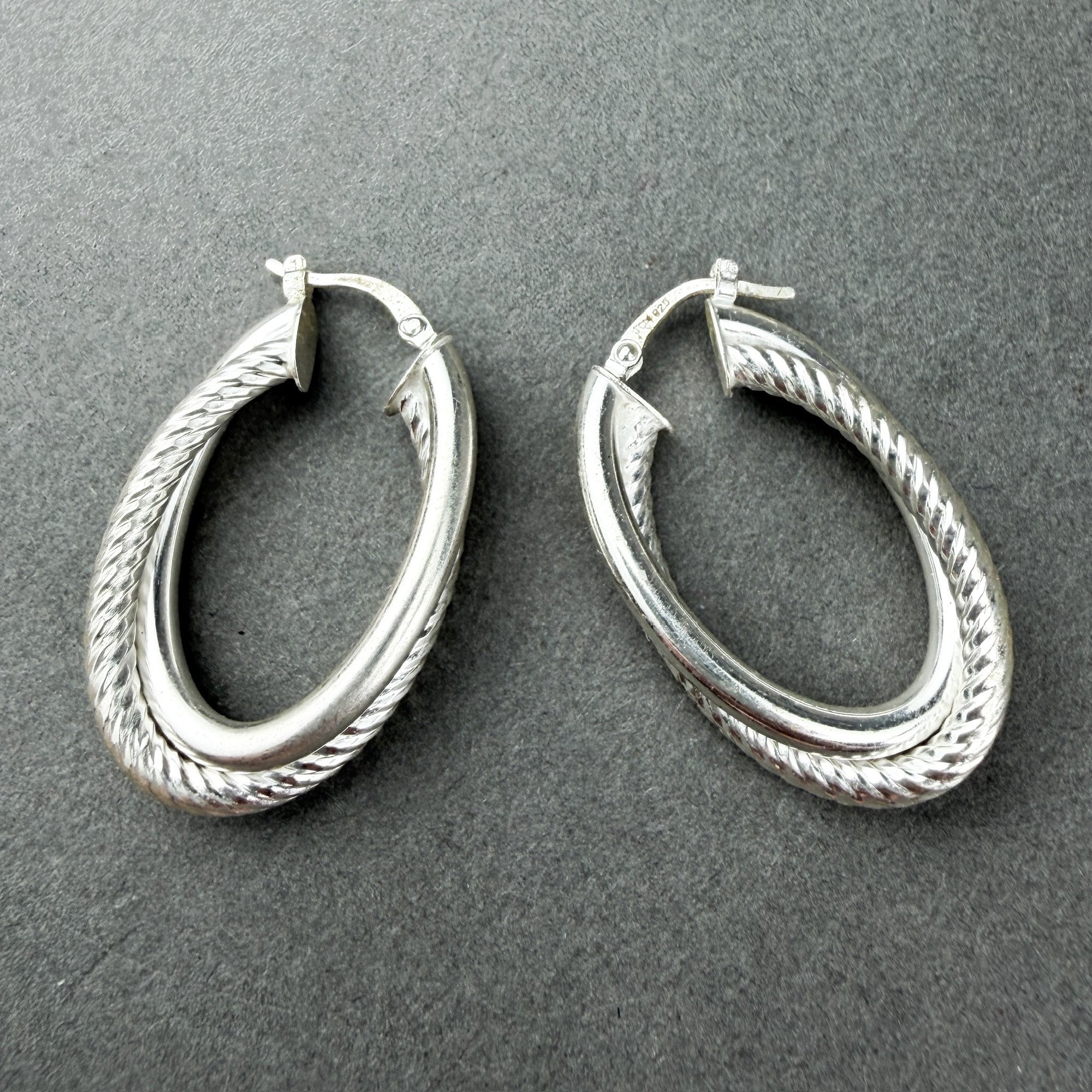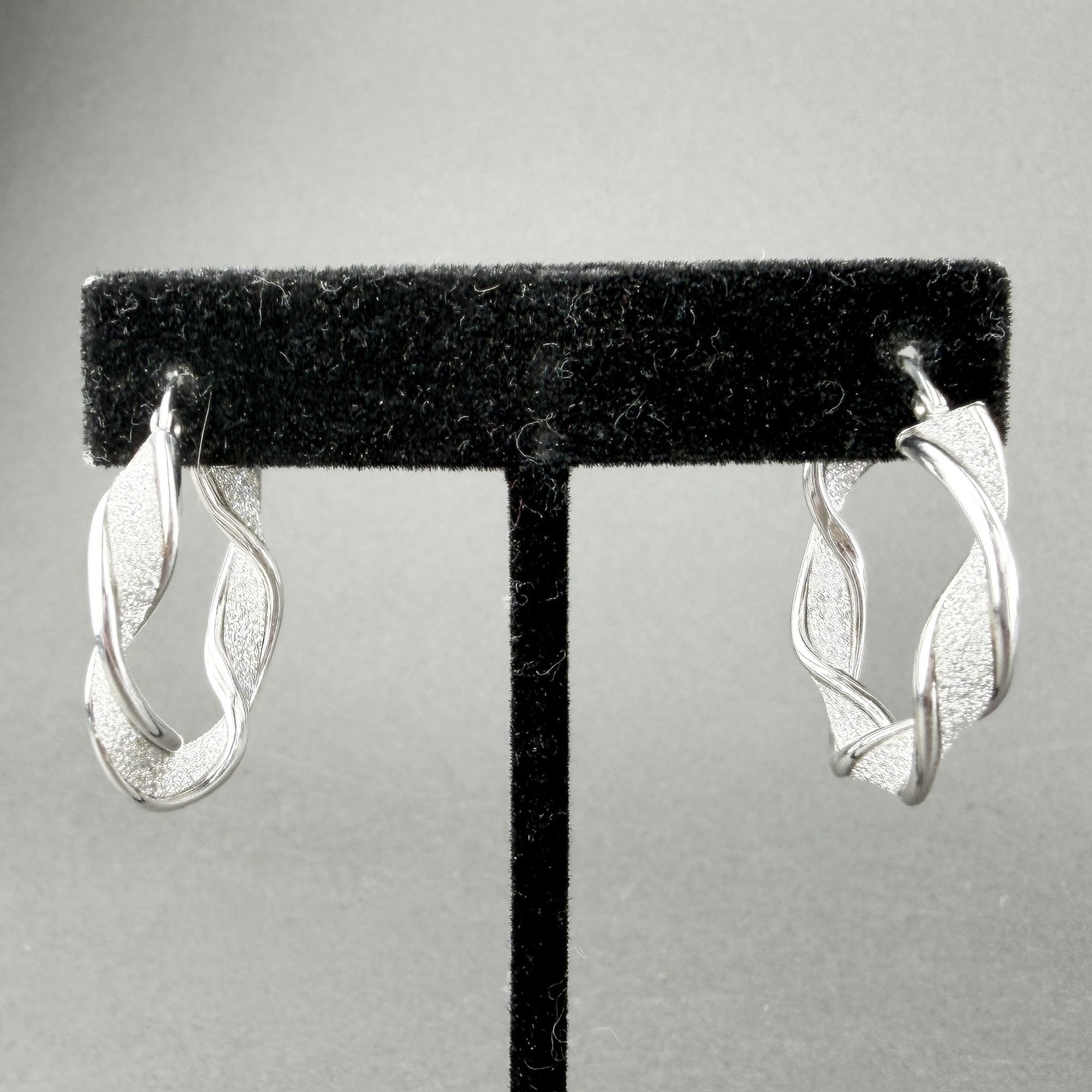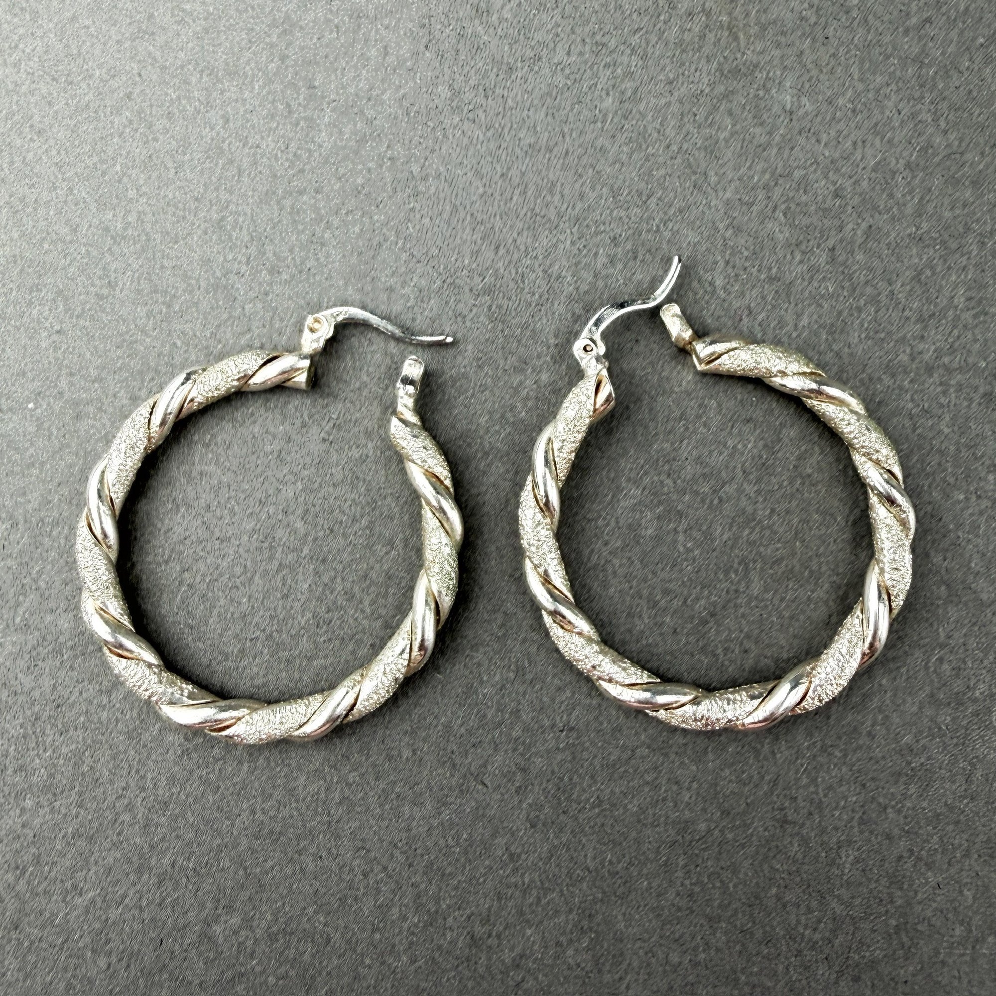 Two pair of textured twisted ribbon and cable with "glitter" finish Sterling Silver hoop earrings.
