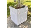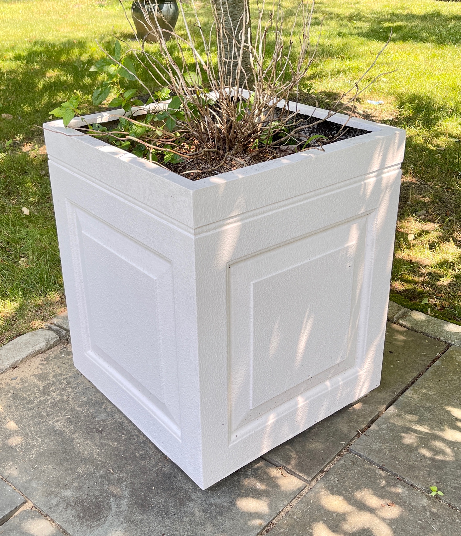 6 white classic resin patio planters. They are in very good shape. One has some cracking and another has some greening on the sides. Please see pictures.