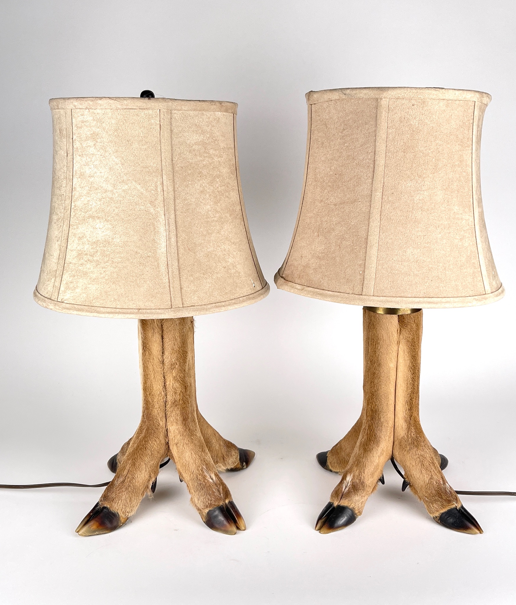 Pair of deer leg lamps with single bulb and shade. Each light has four deer legs.