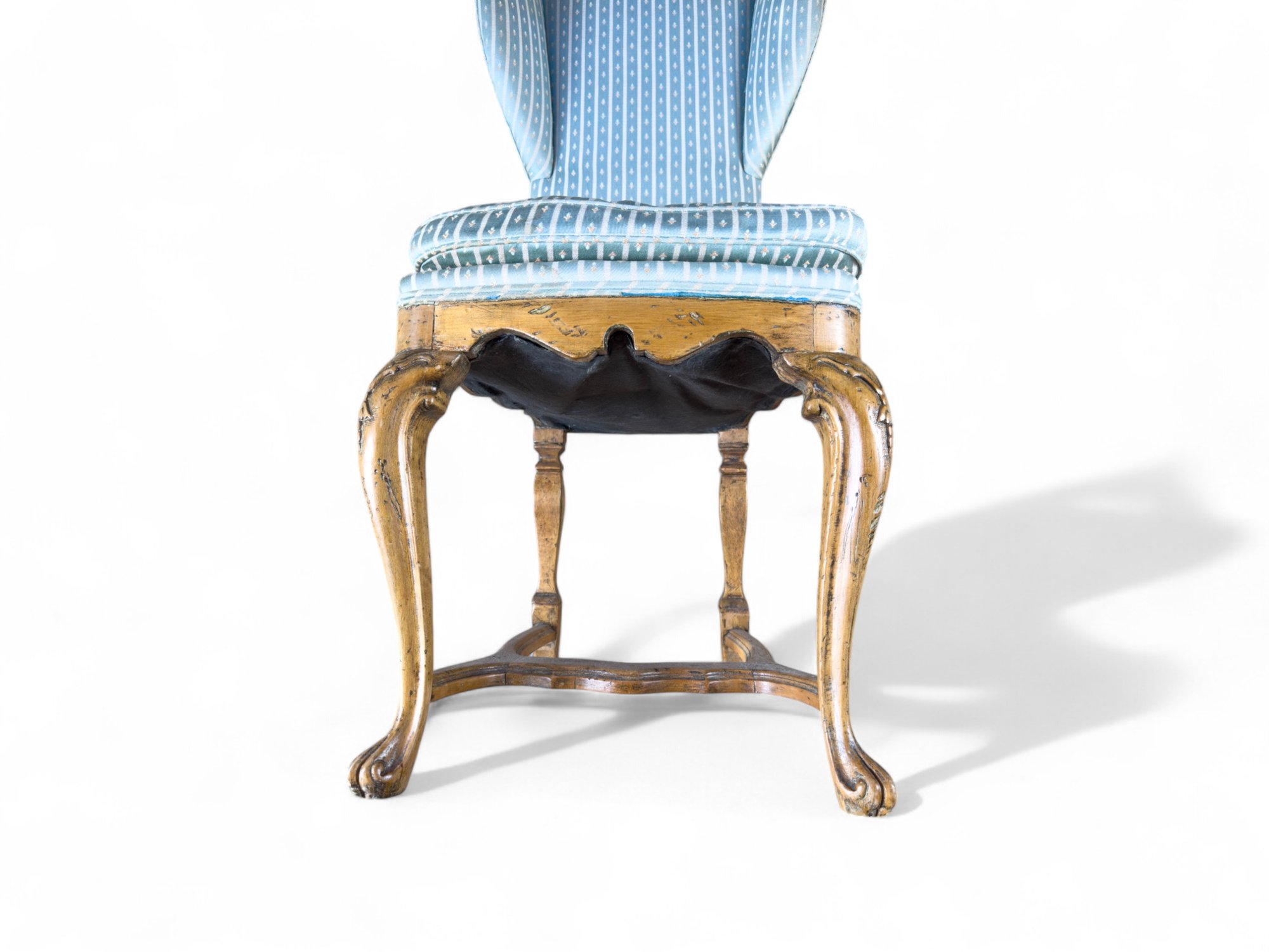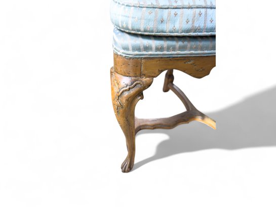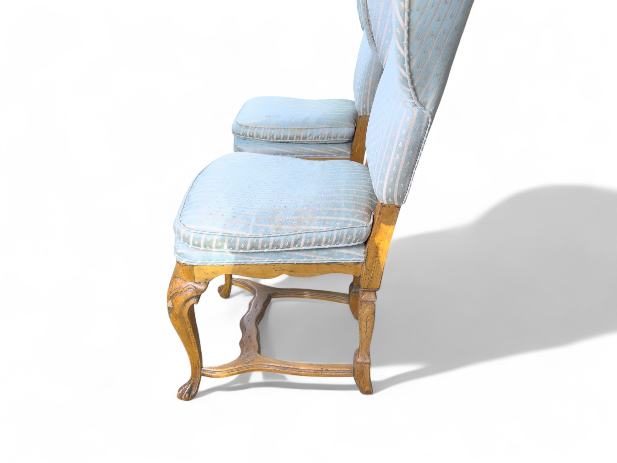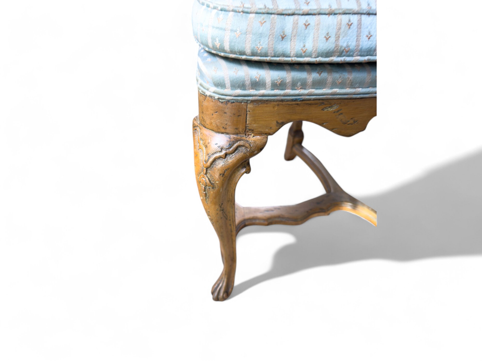 Antique French Provincial stryle upholstered fruitwood side chair with an arched winged back, raised on cabrile legs with carved knees and joined by stretchers.