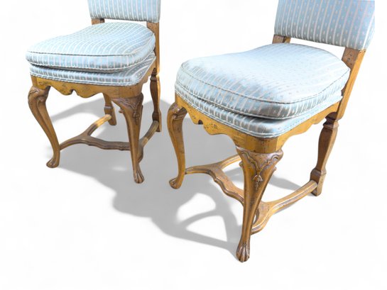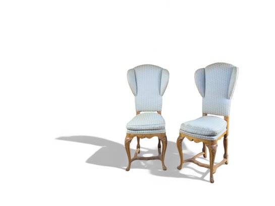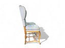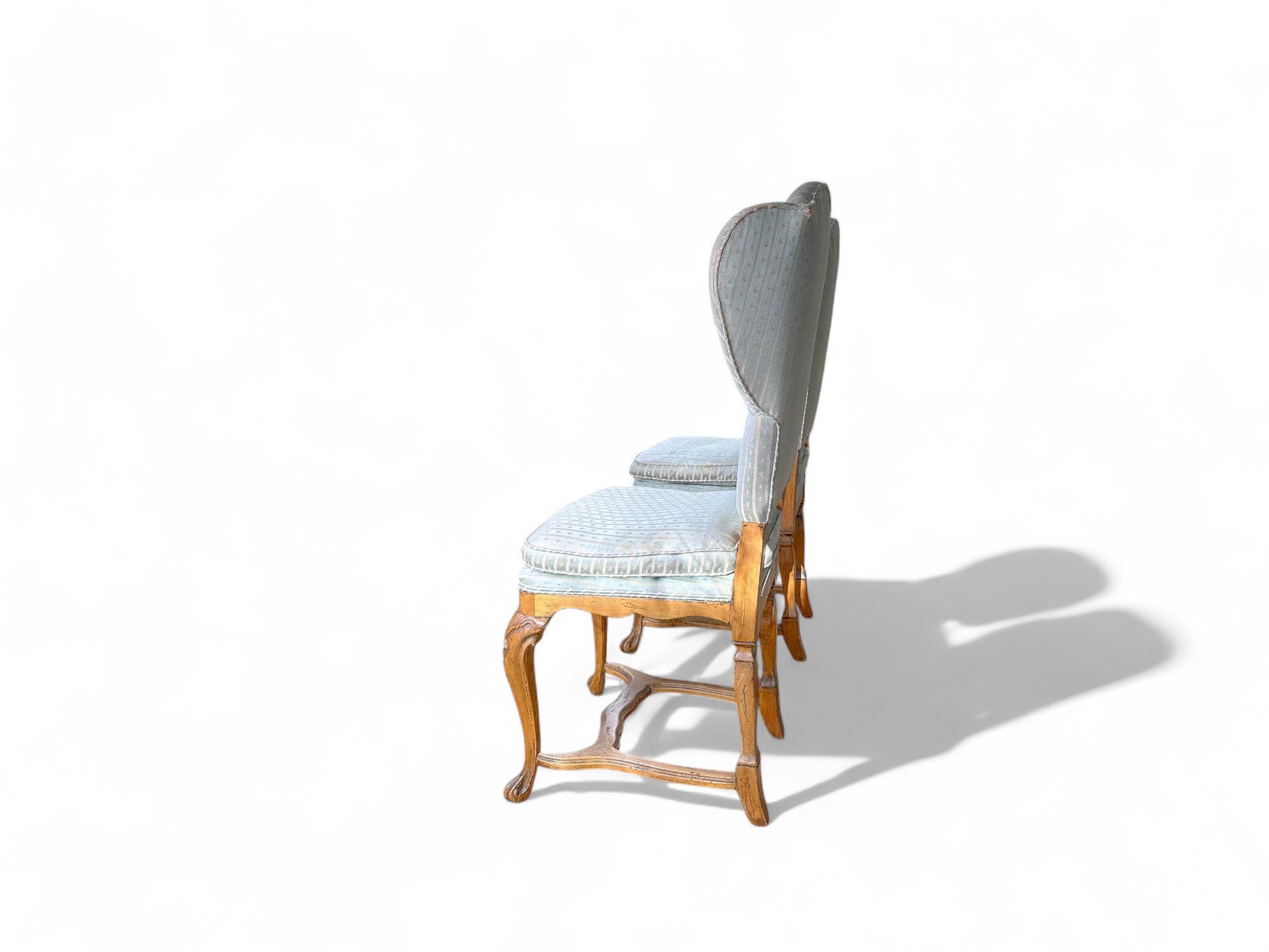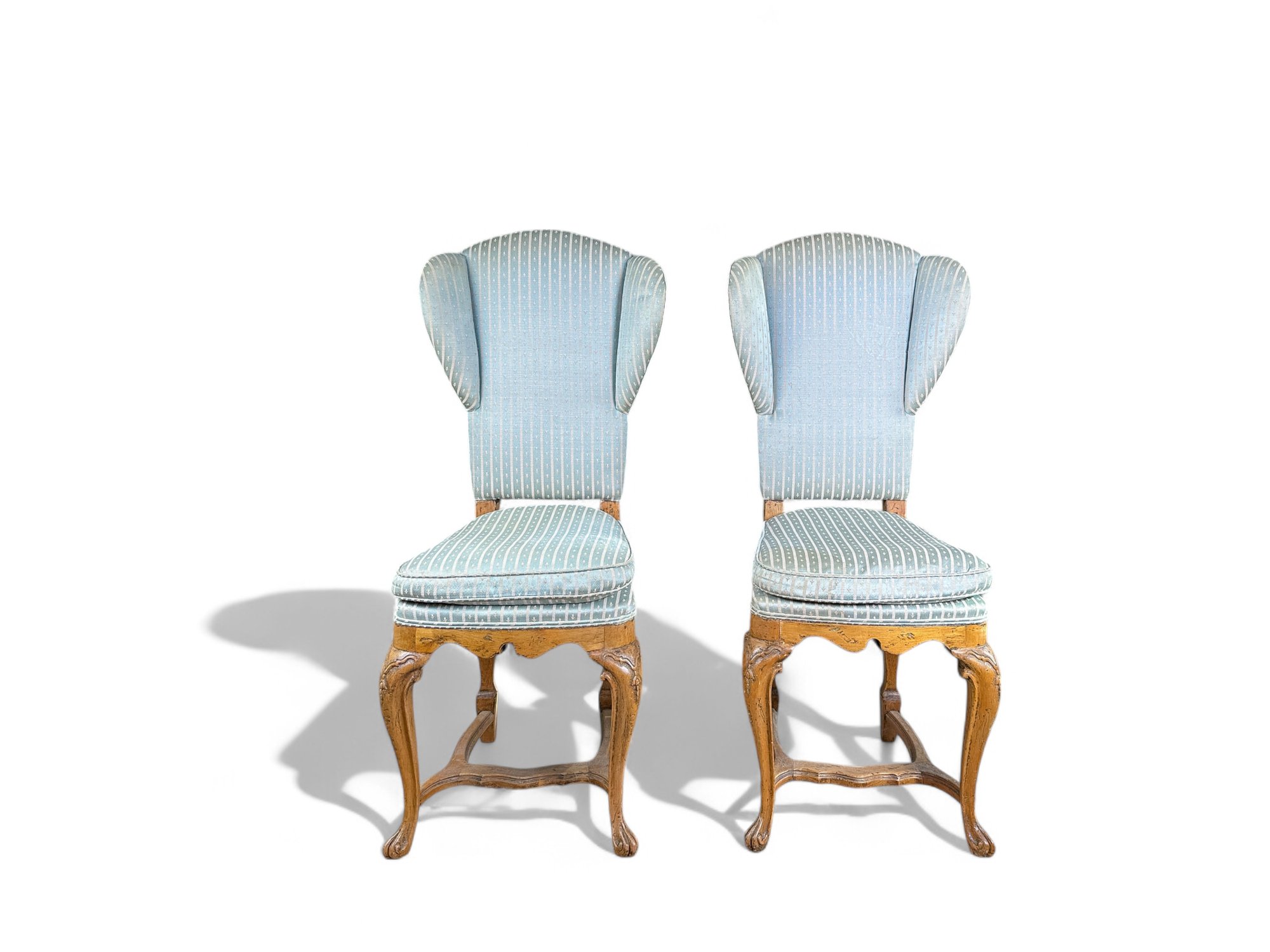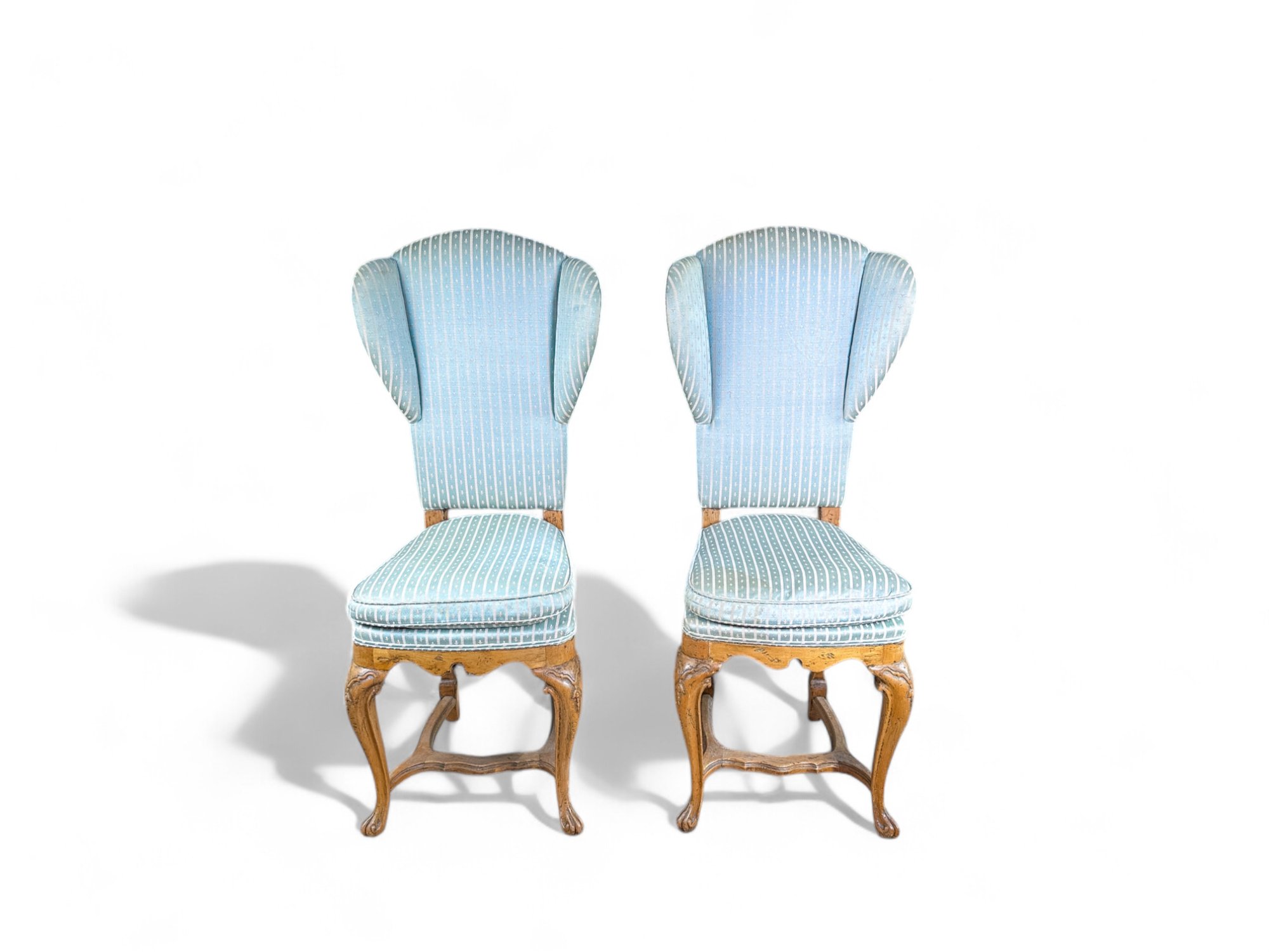 Antique French Provincial stryle upholstered fruitwood side chair with an arched winged back, raised on cabrile legs with carved knees and joined by stretchers.