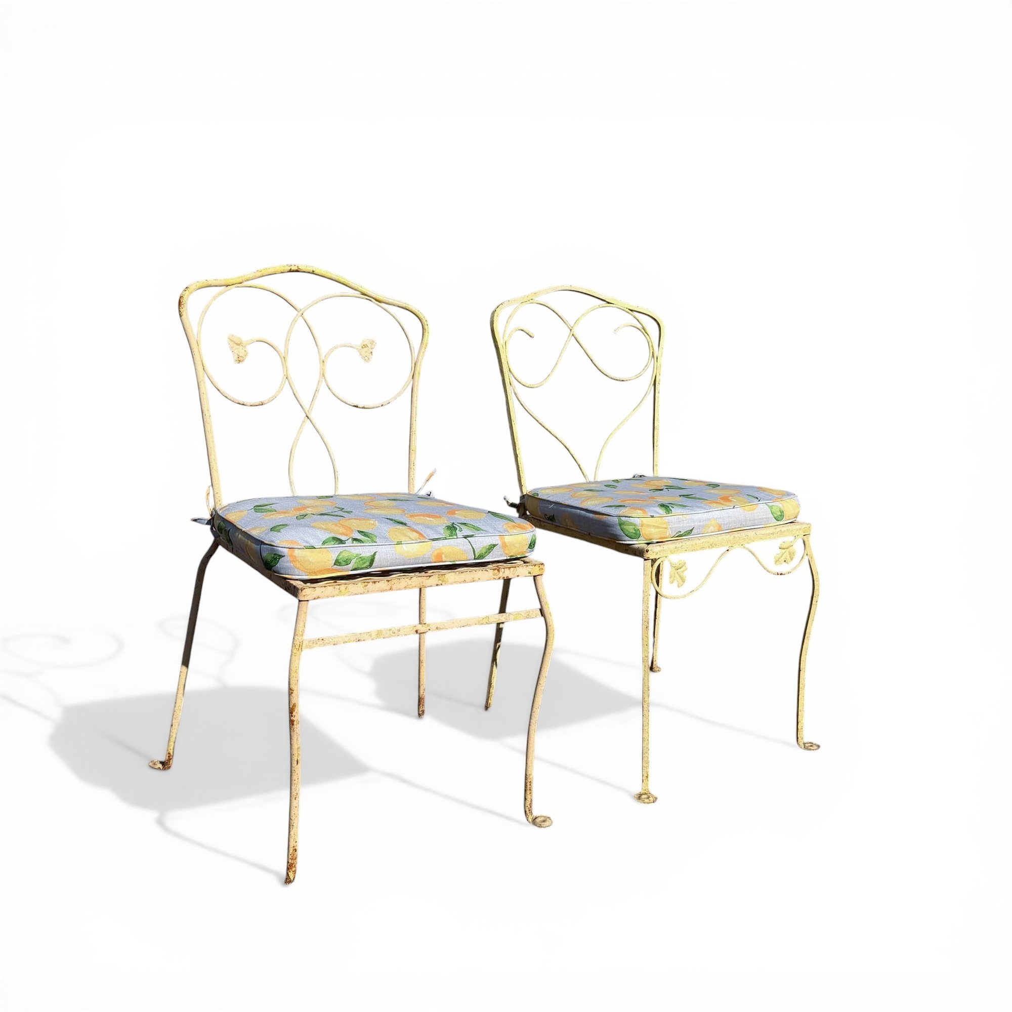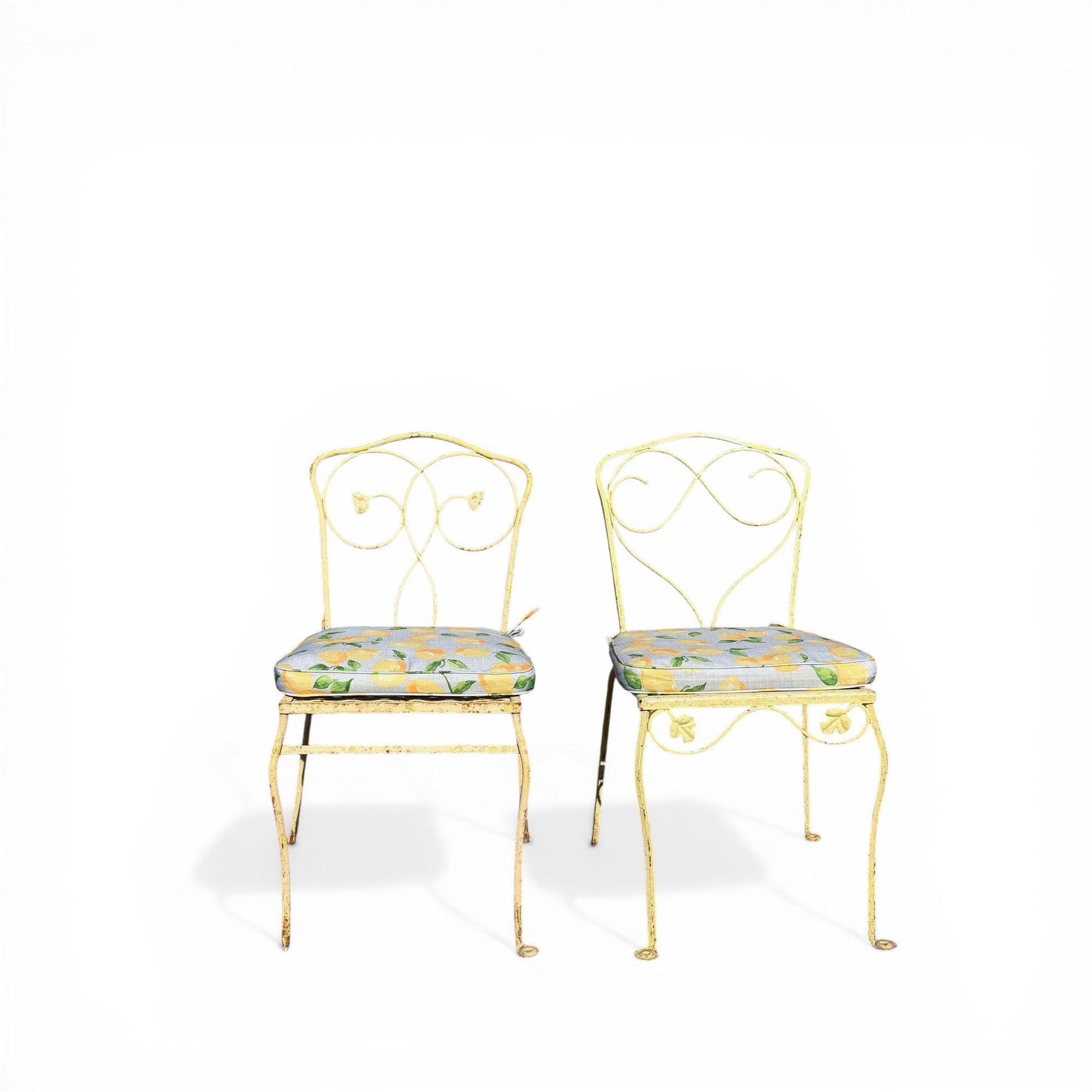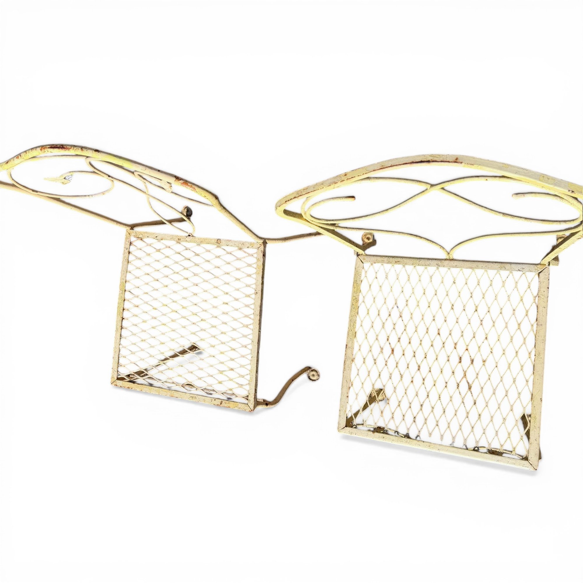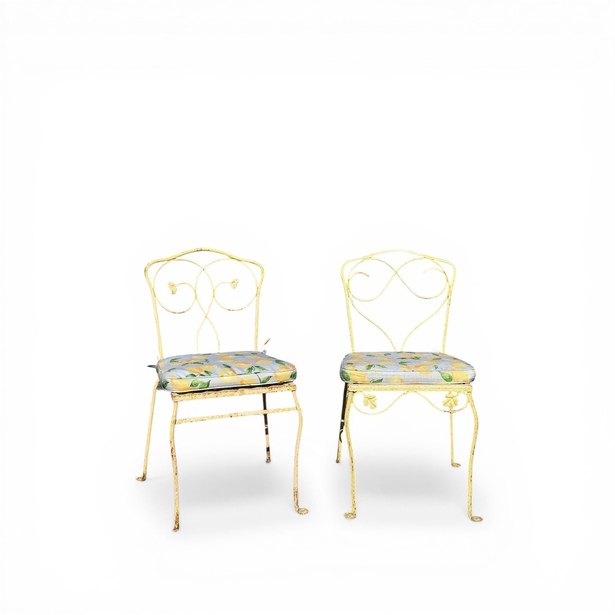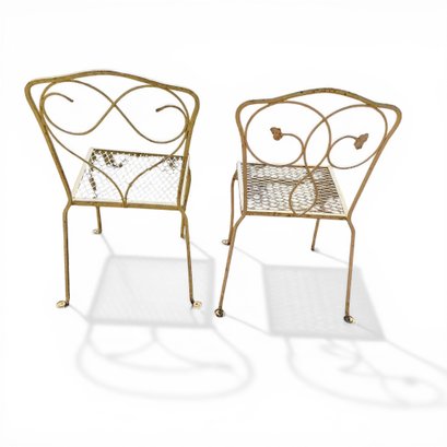 Pair, French Wrought Iron Garden Chairs In Distressed Yellow Paint