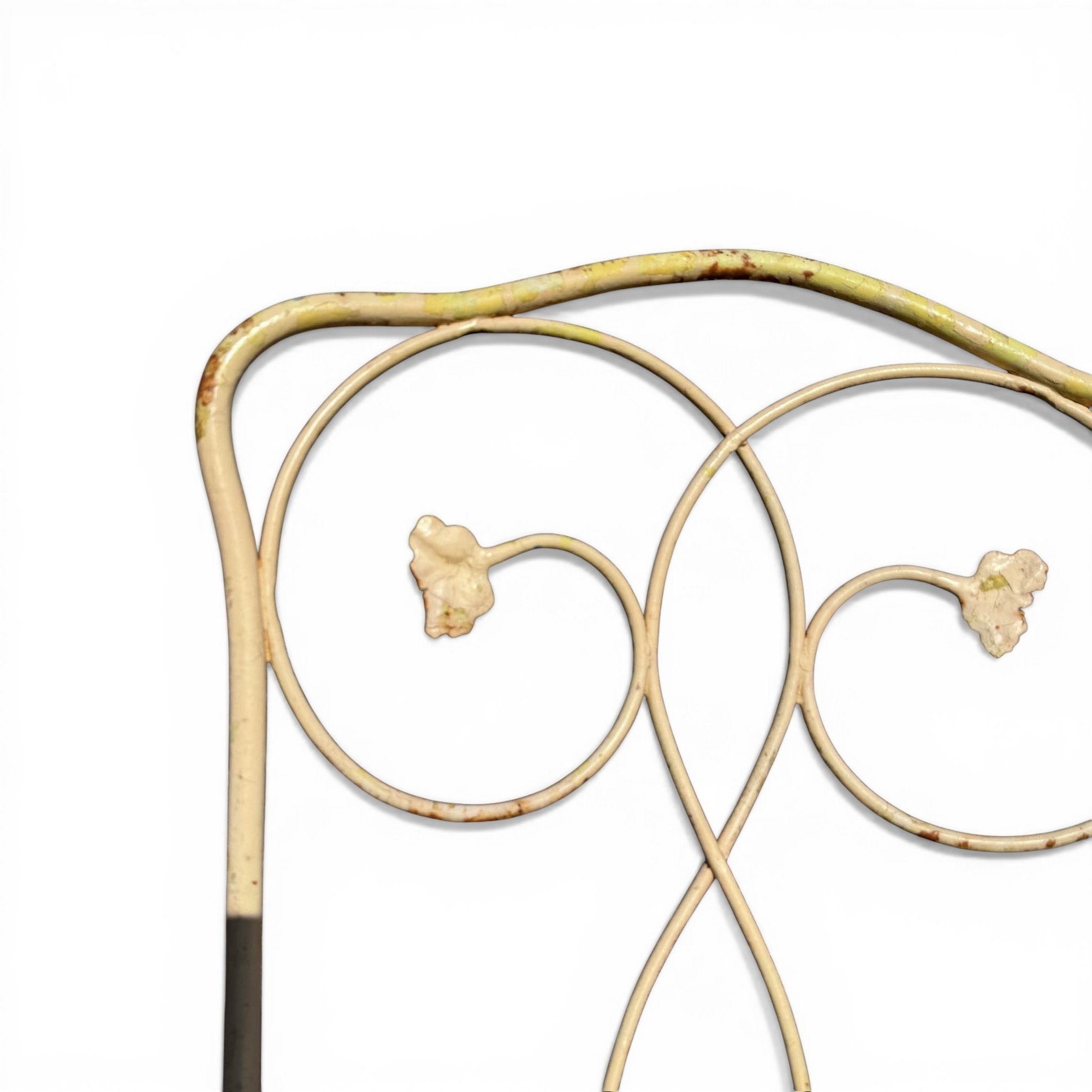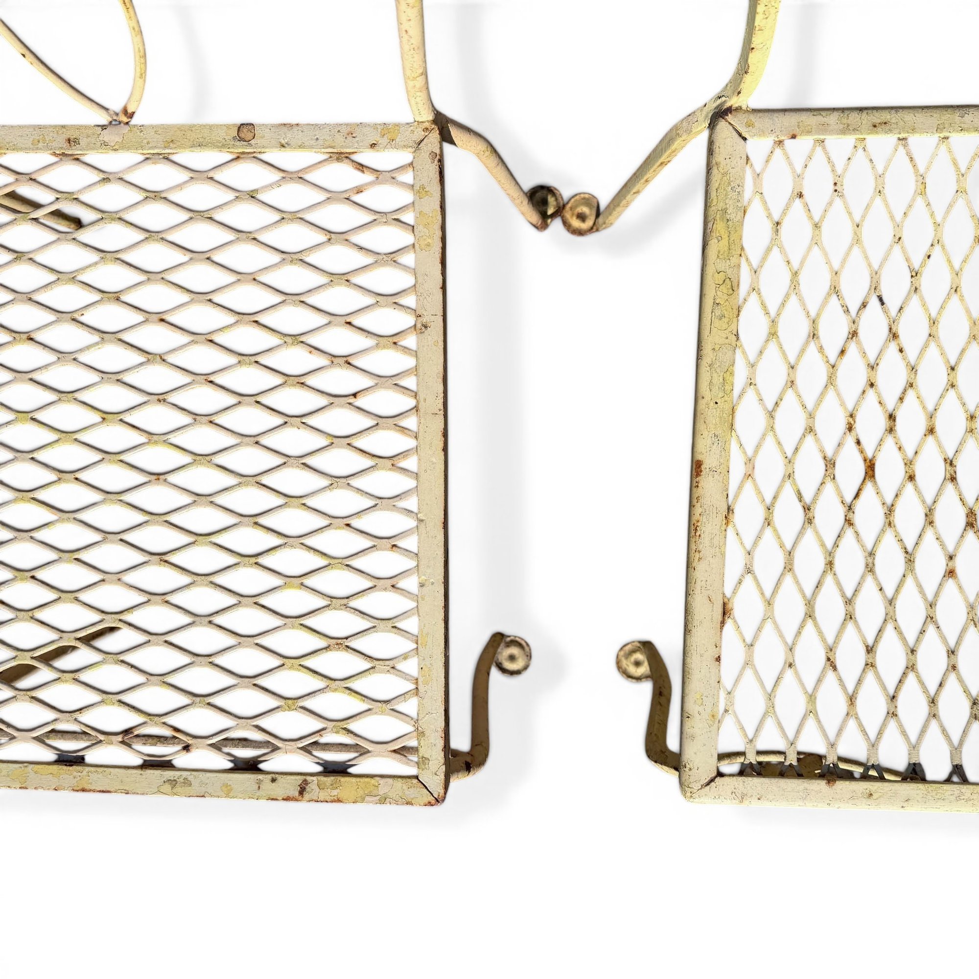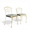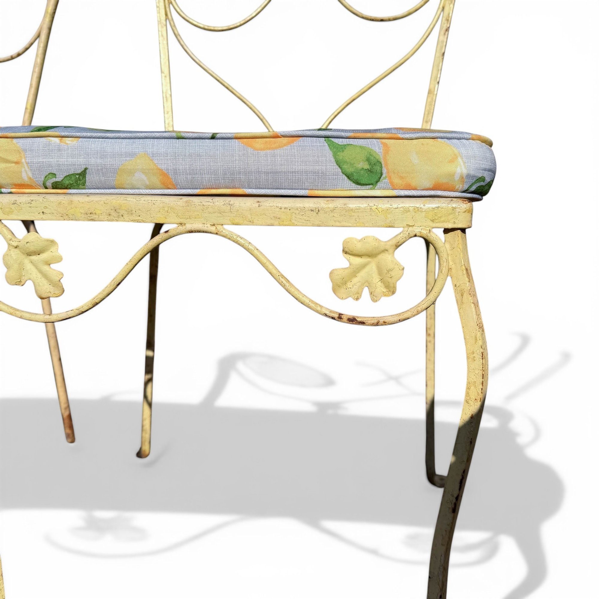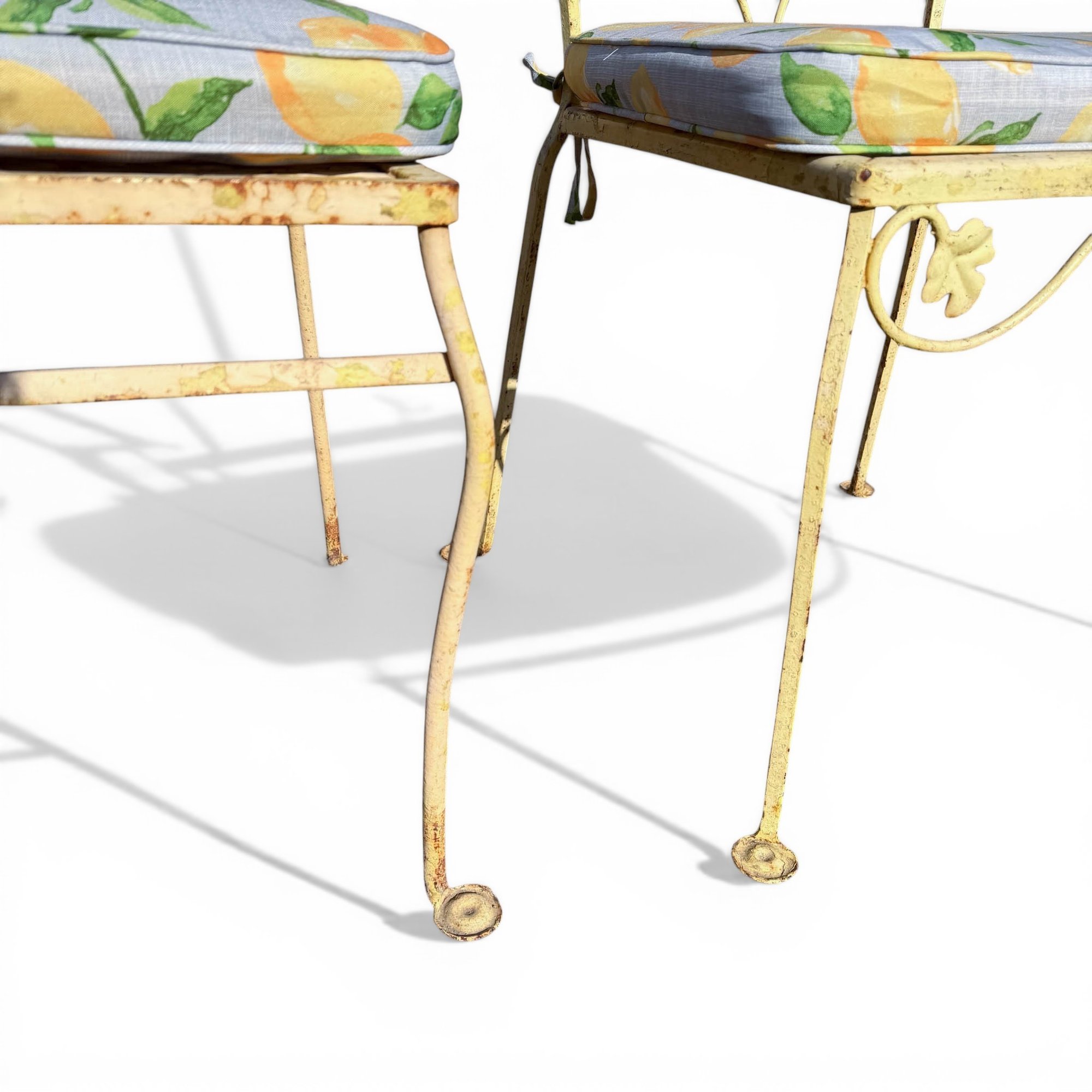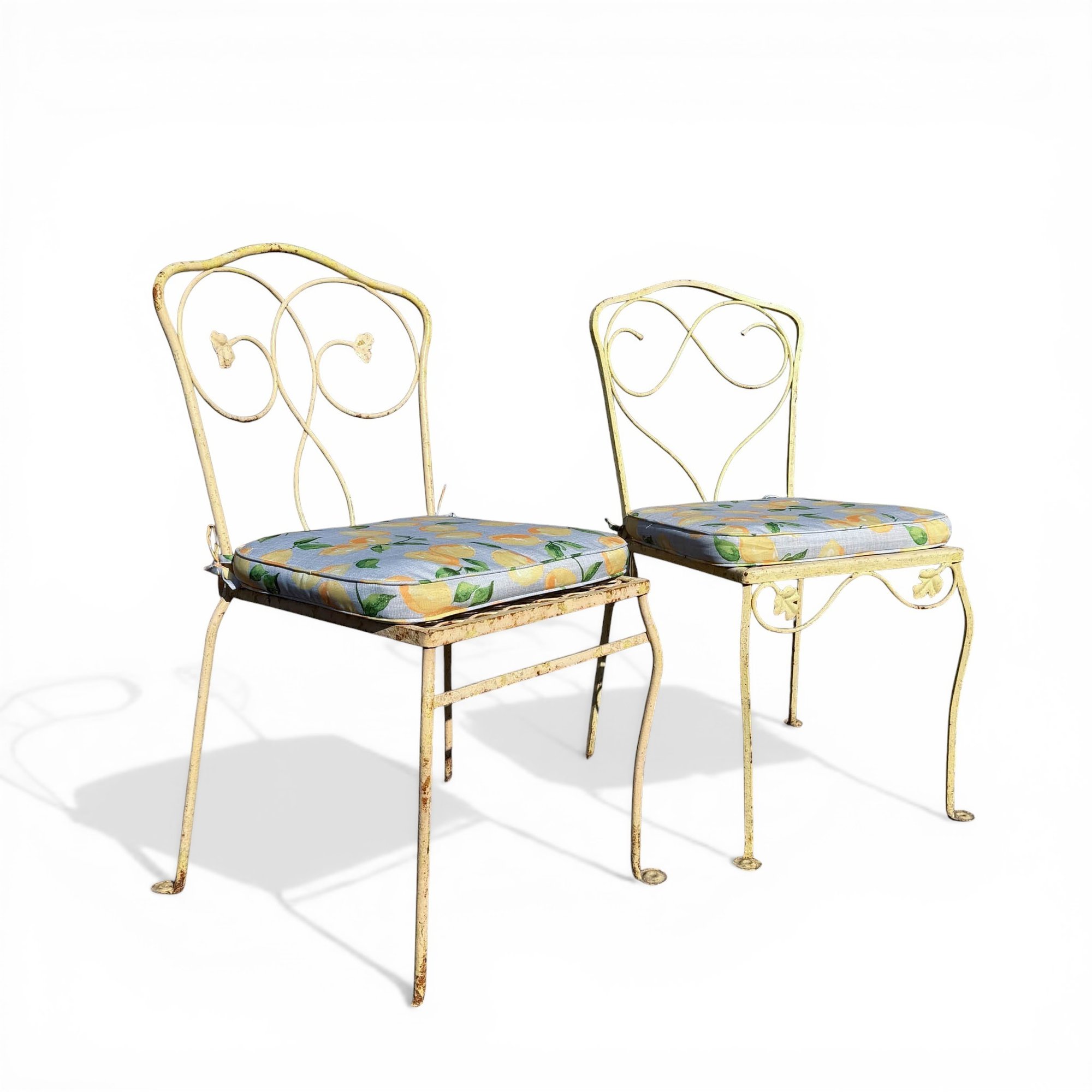 Pair, French Wrought Iron Garden Chairs In Distressed Yellow Paint