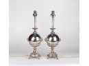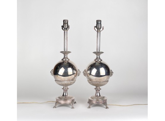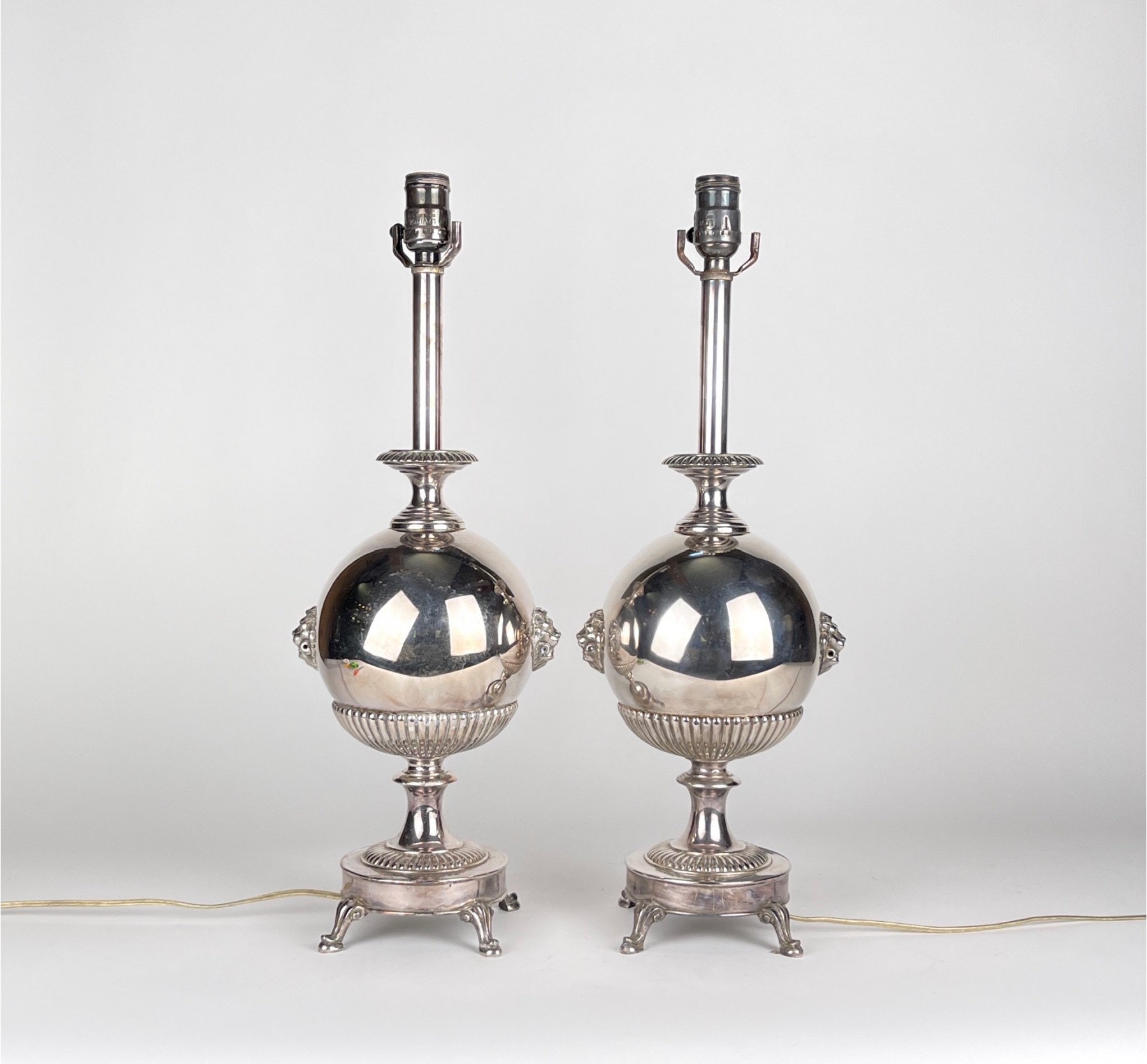 Fantastic antique silver plated bubble lamps with double lion head design on four footed base.