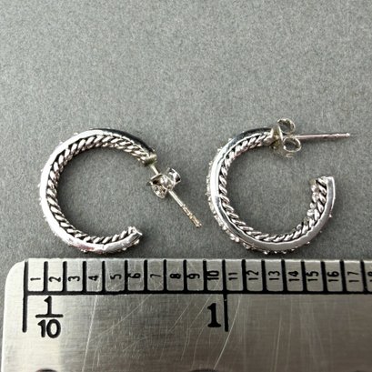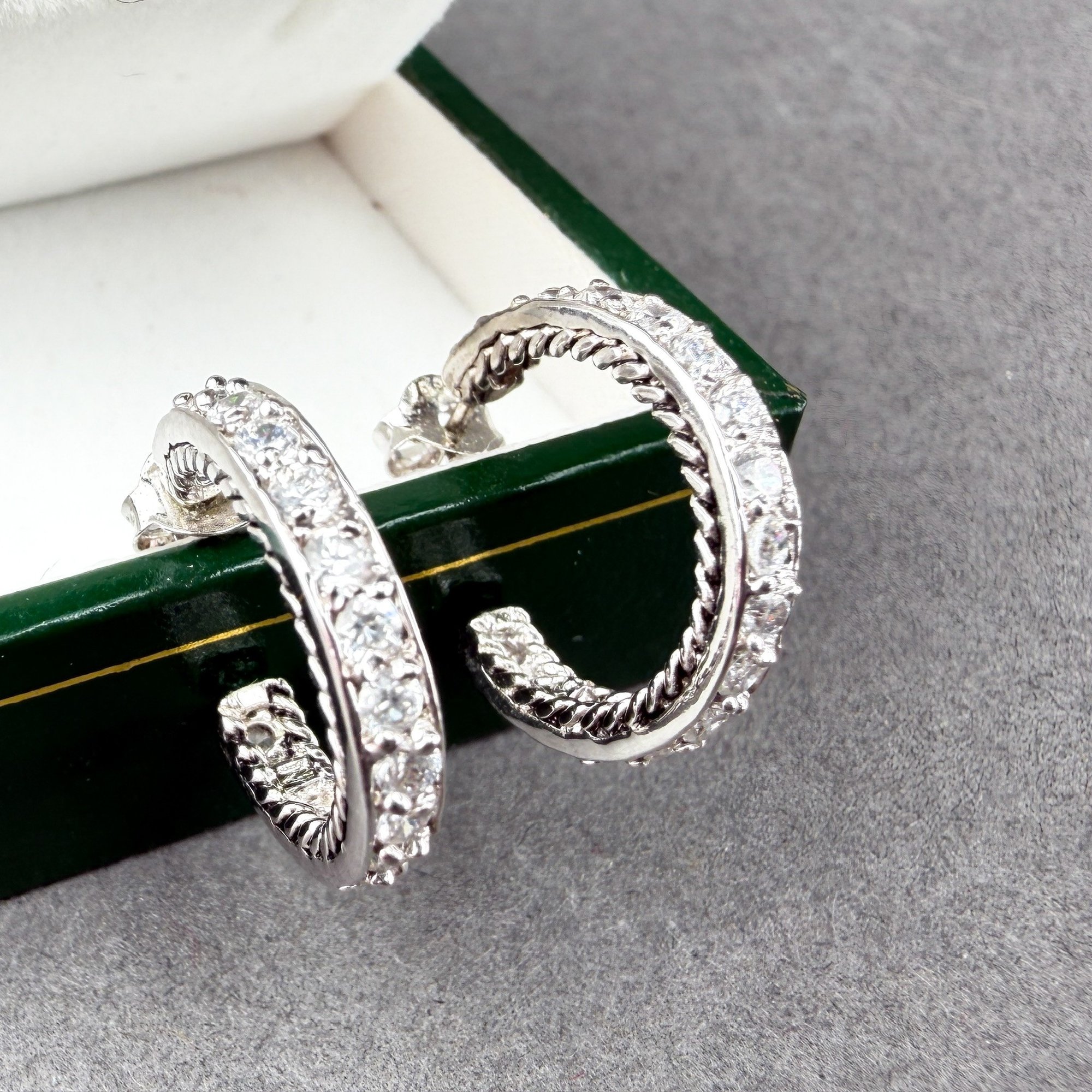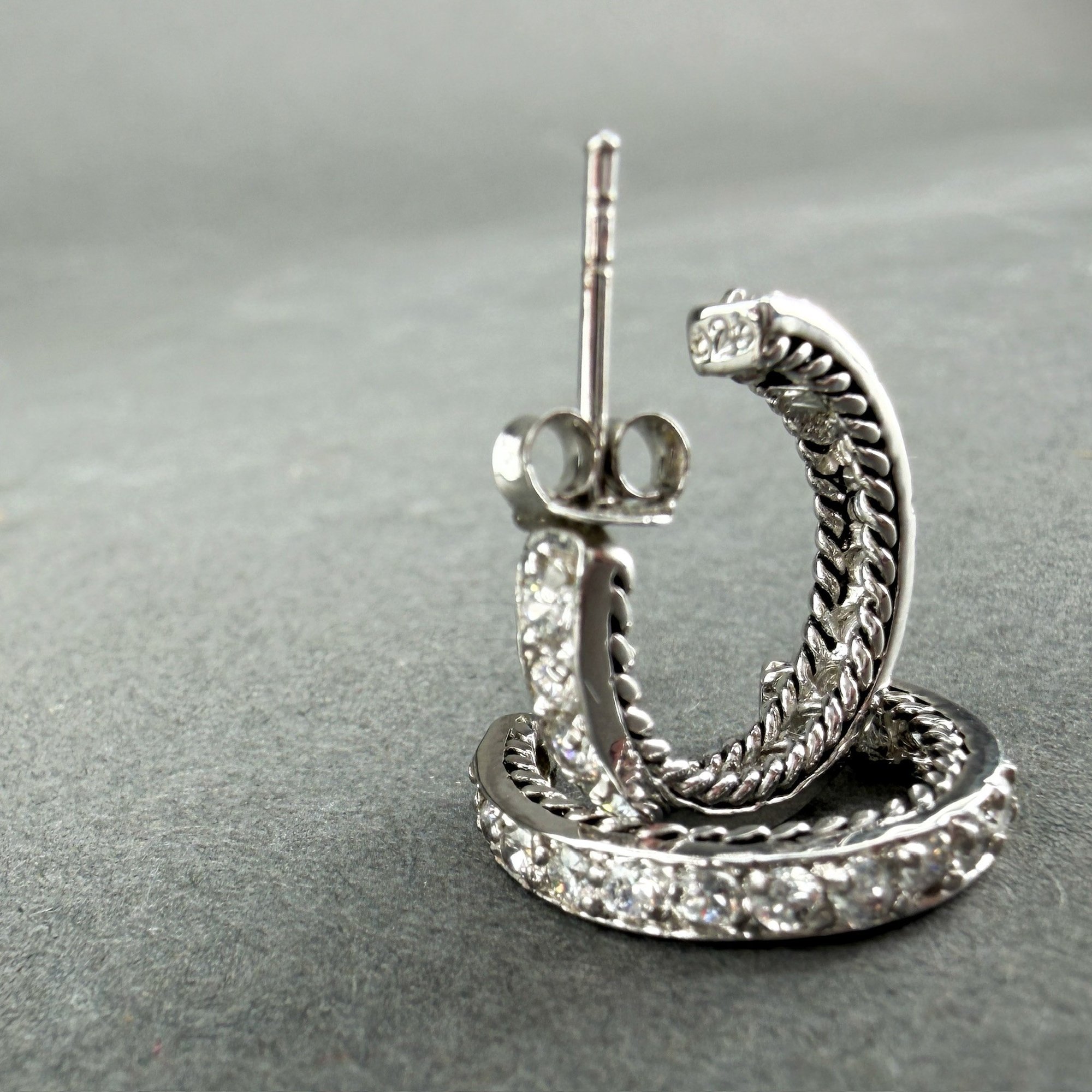 Pair of starling silver and single row of diamond, huggie hoop earrings.