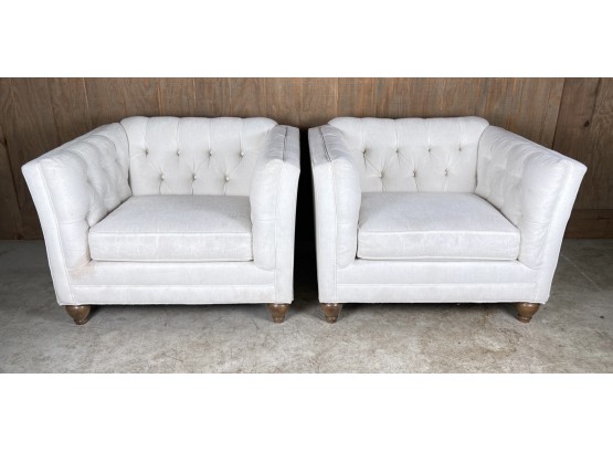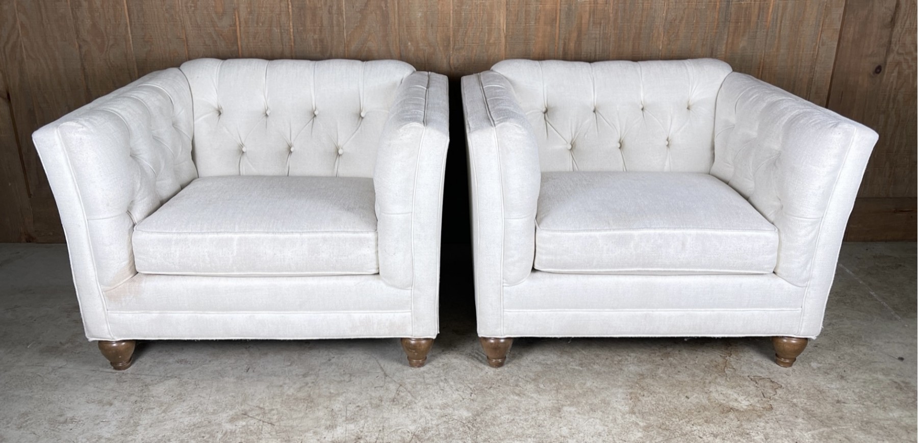 White Tufted interior side and back arm chairs with double tiered wooden ball feet.
