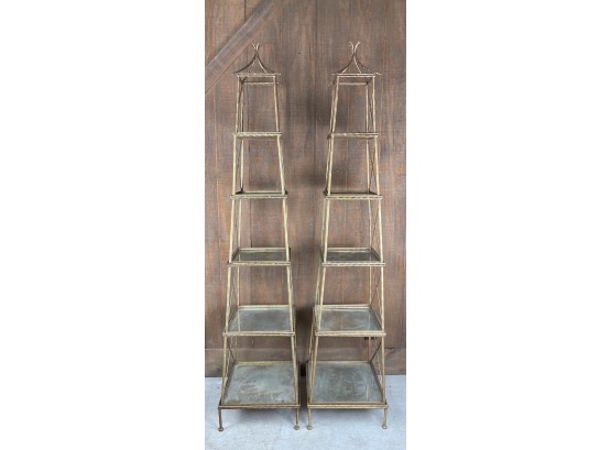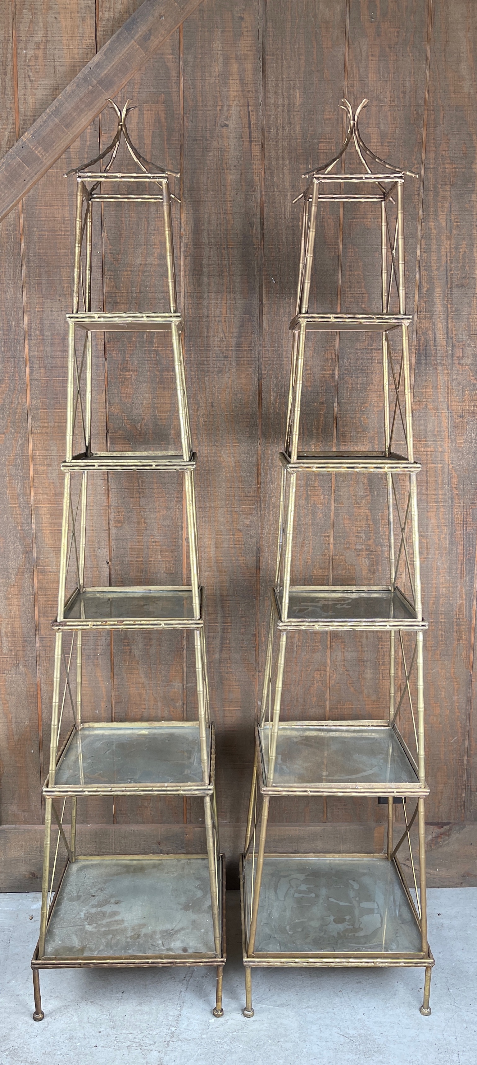 Hollywood regency style Gilt faux bamboo iron pagoda style Etagere. Five tier, graduating shelves with a gilded metal bottom with dark glass. Each shelf has an x form design on two sides and two open sides. Breaks into six pieces that allow it to be stacked lower or made into multiple smaller shelves.