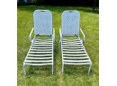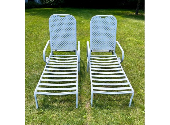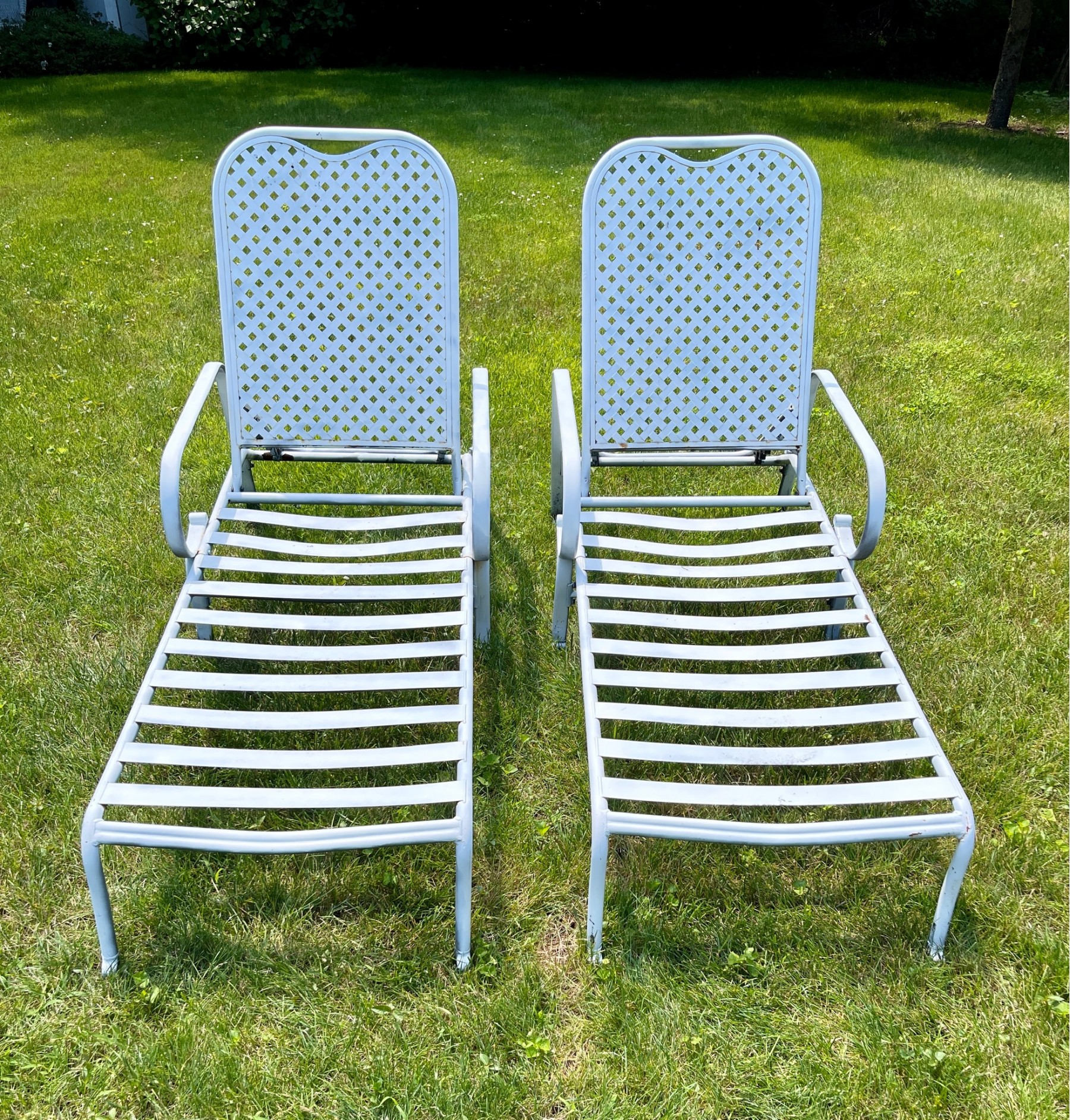 Pair of steel and perforated steel chaise lounges in the style of Matthieu Mategot. Adjustable back.