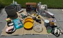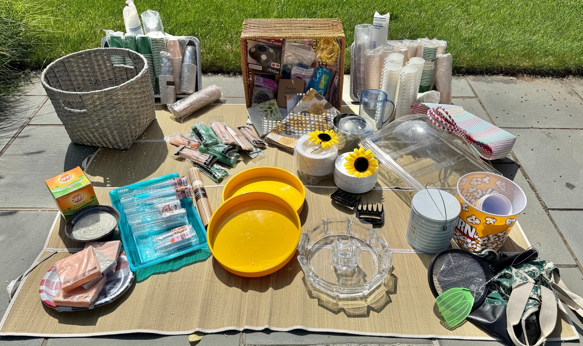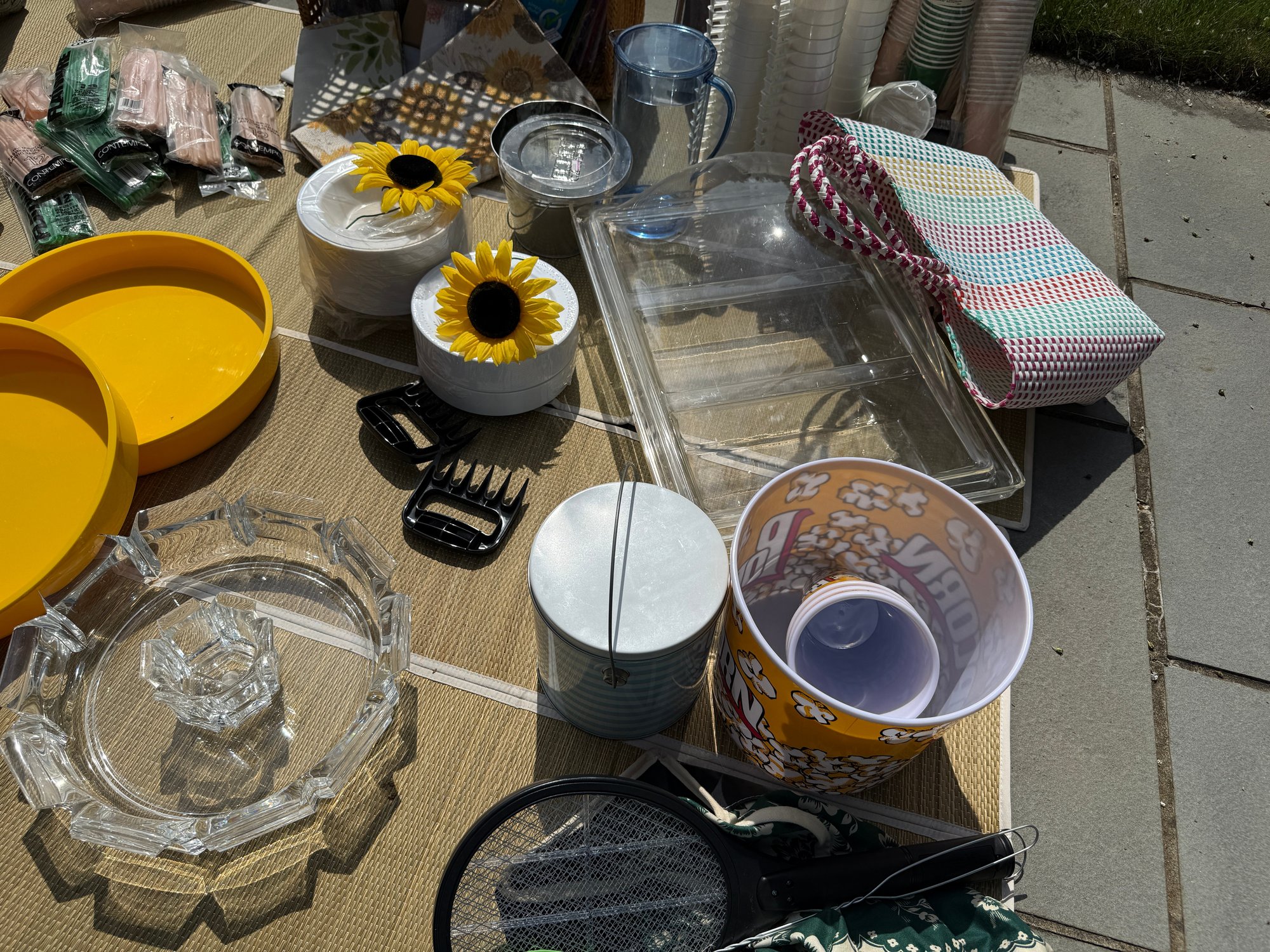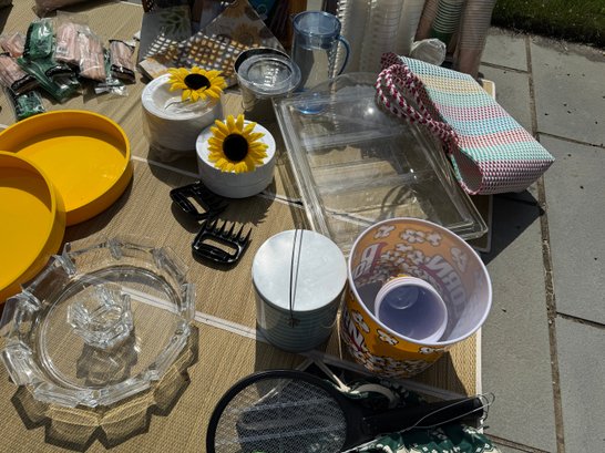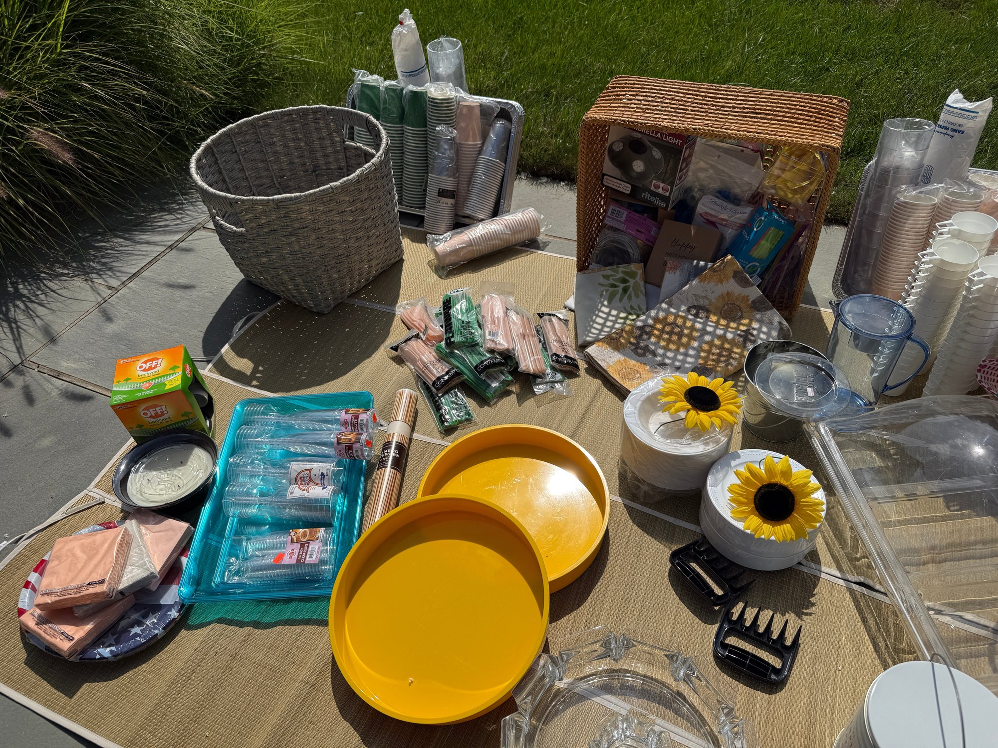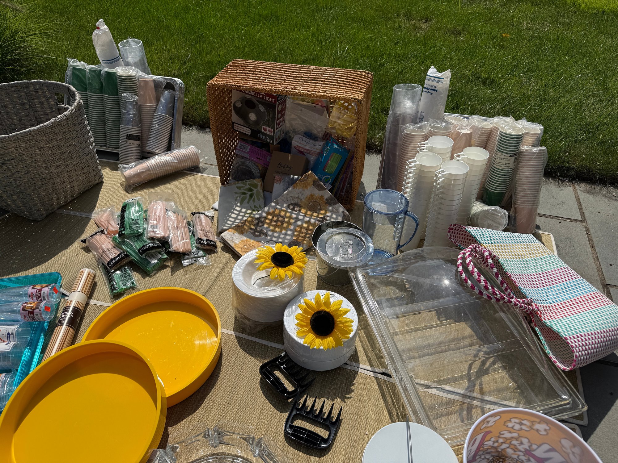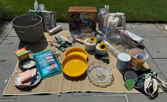 Baskets, Plastic and durable serve ware, cups, tableware, decor, serving platters, baskets, fly wateers, canvas and plastic woven tote bags...