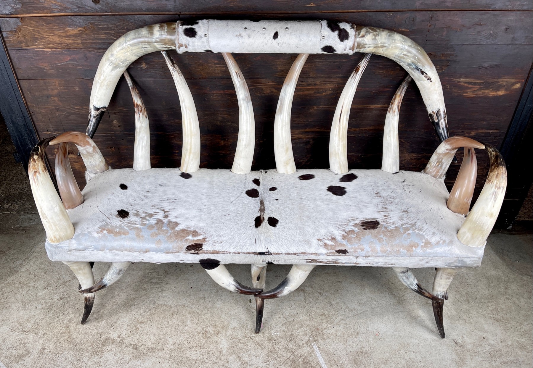 Fabulous cowhide upholstered Texas longhorn steer horn settee in good condition. The horns have been matched perfectly fir color and size. Solid, comfortable and perfect for the eclectic home. The upper right horn on the back has a small crack. please see pictures.