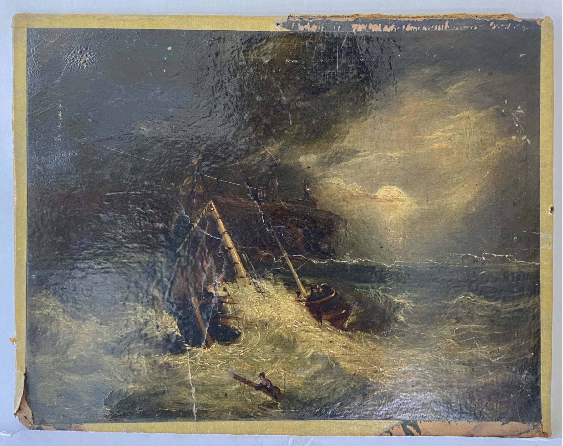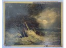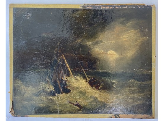 Oil on Masonite board antique painting ship in a squall. Unknown artist oil on board measures