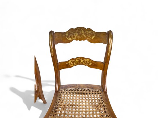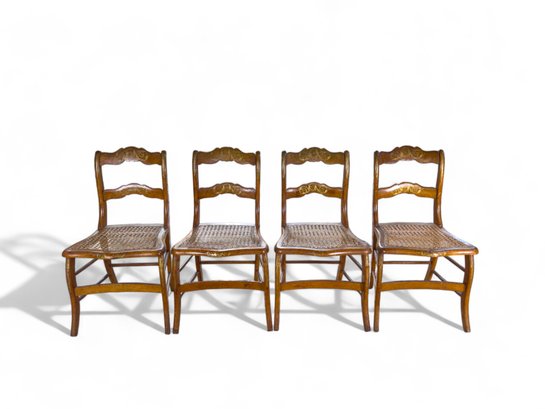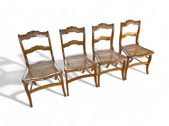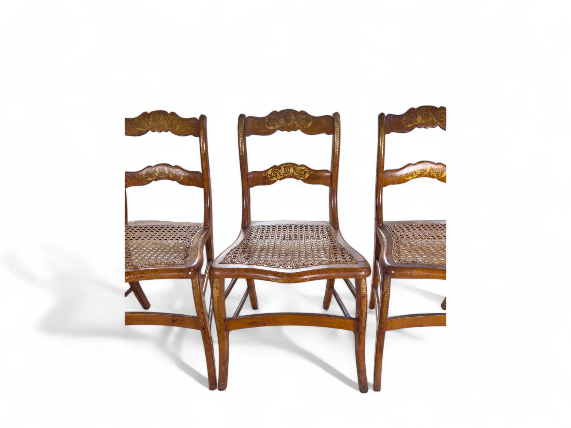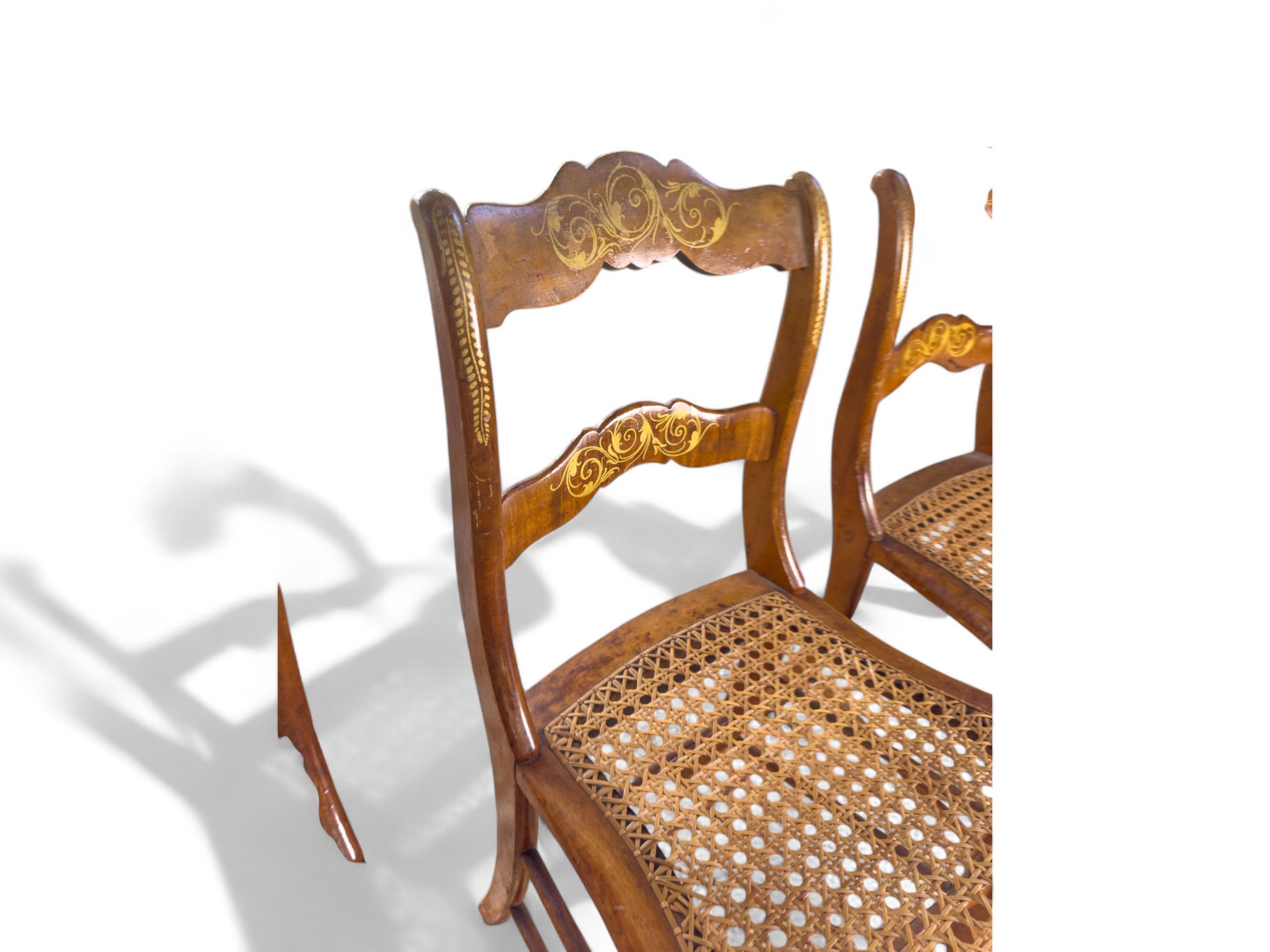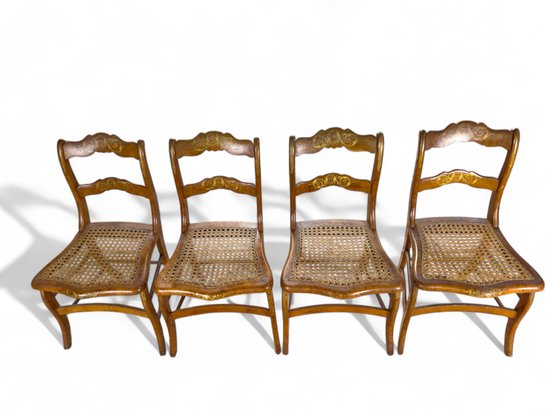 Set of Four maple with gilt stencil accent on back with two shaped arches and splat above a perfectly shaped caned seat raised on sabre legs joined by stretchers.