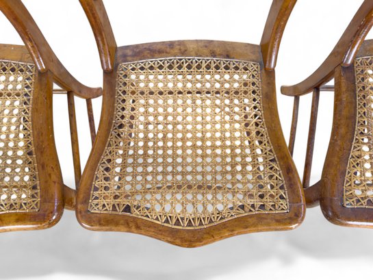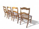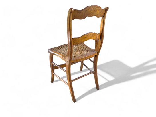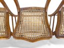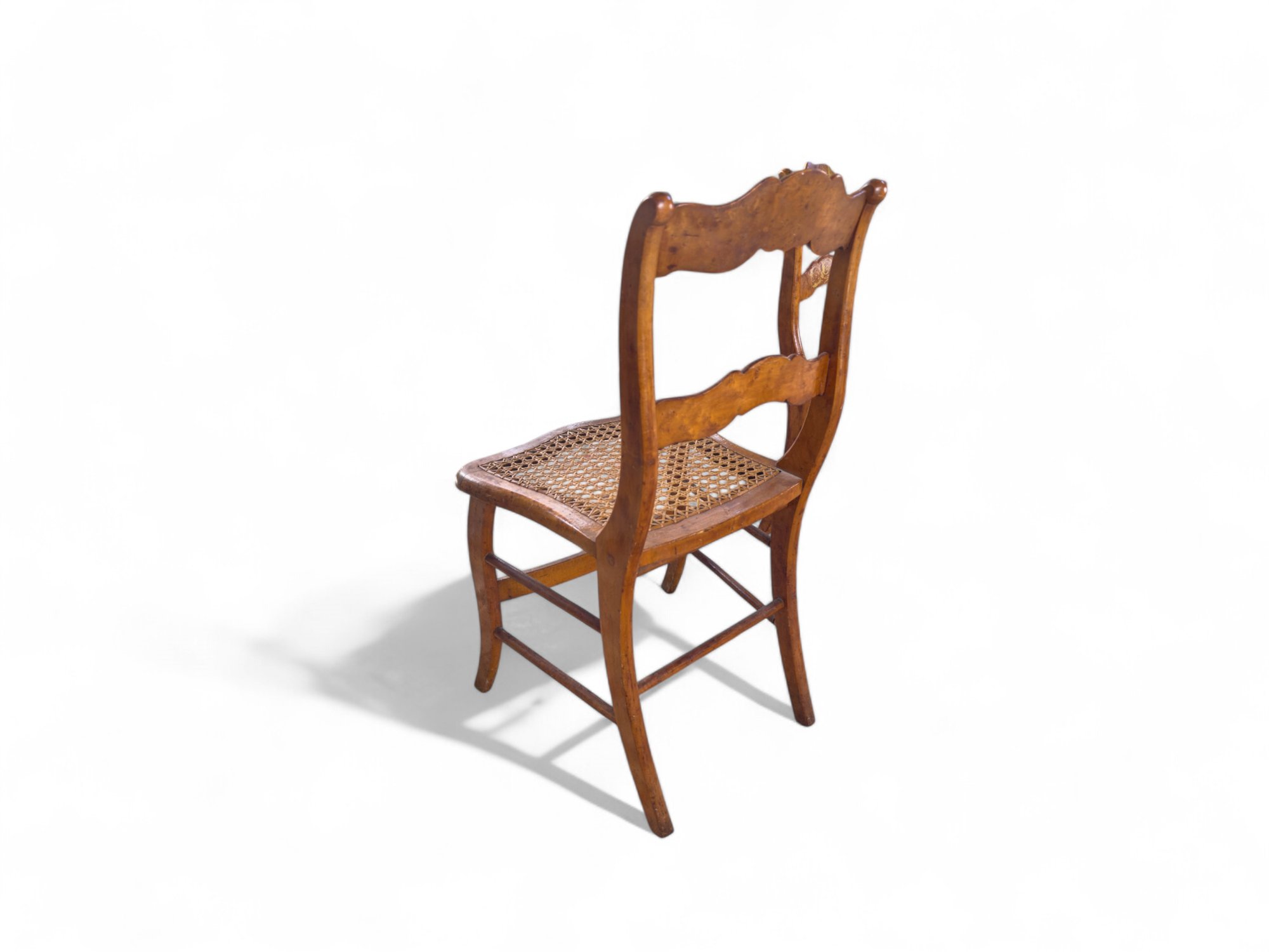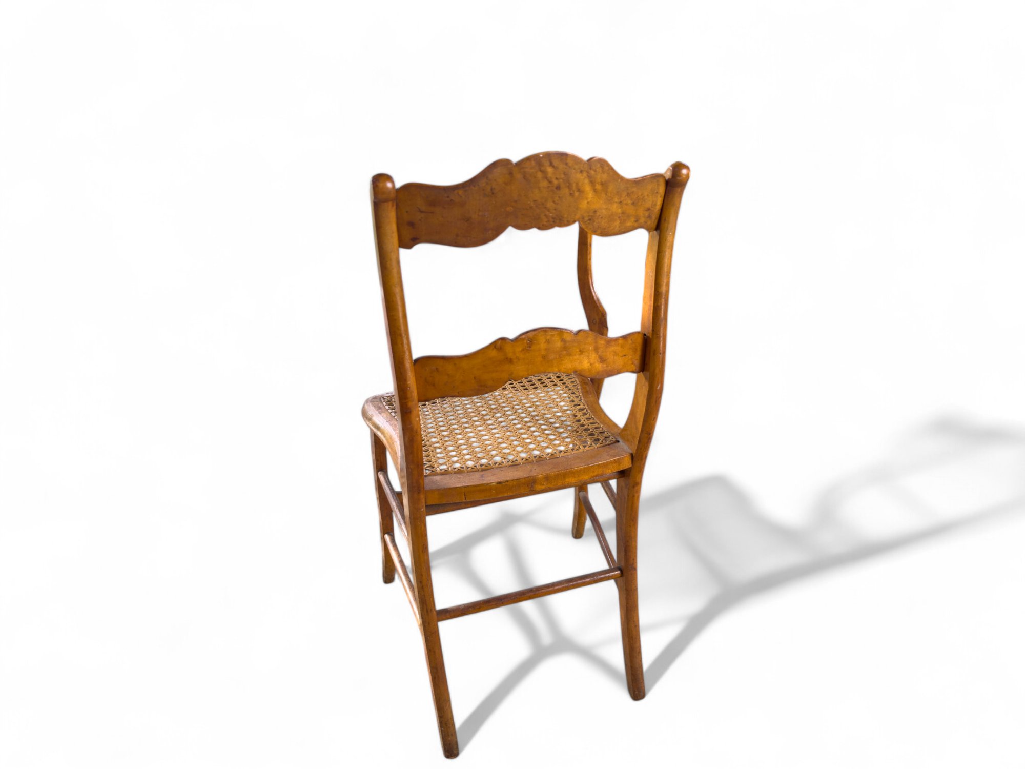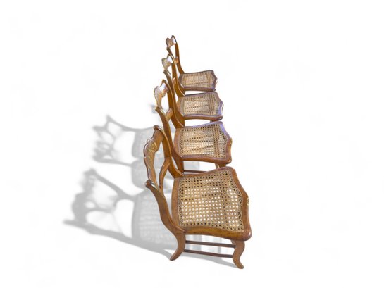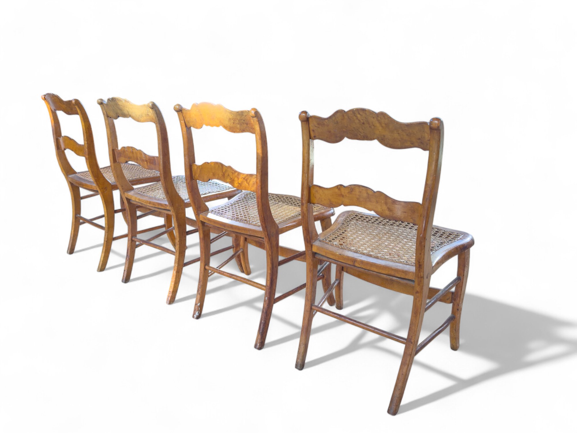 Set of Four maple with gilt stencil accent on back with two shaped arches and splat above a perfectly shaped caned seat raised on sabre legs joined by stretchers.