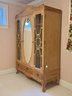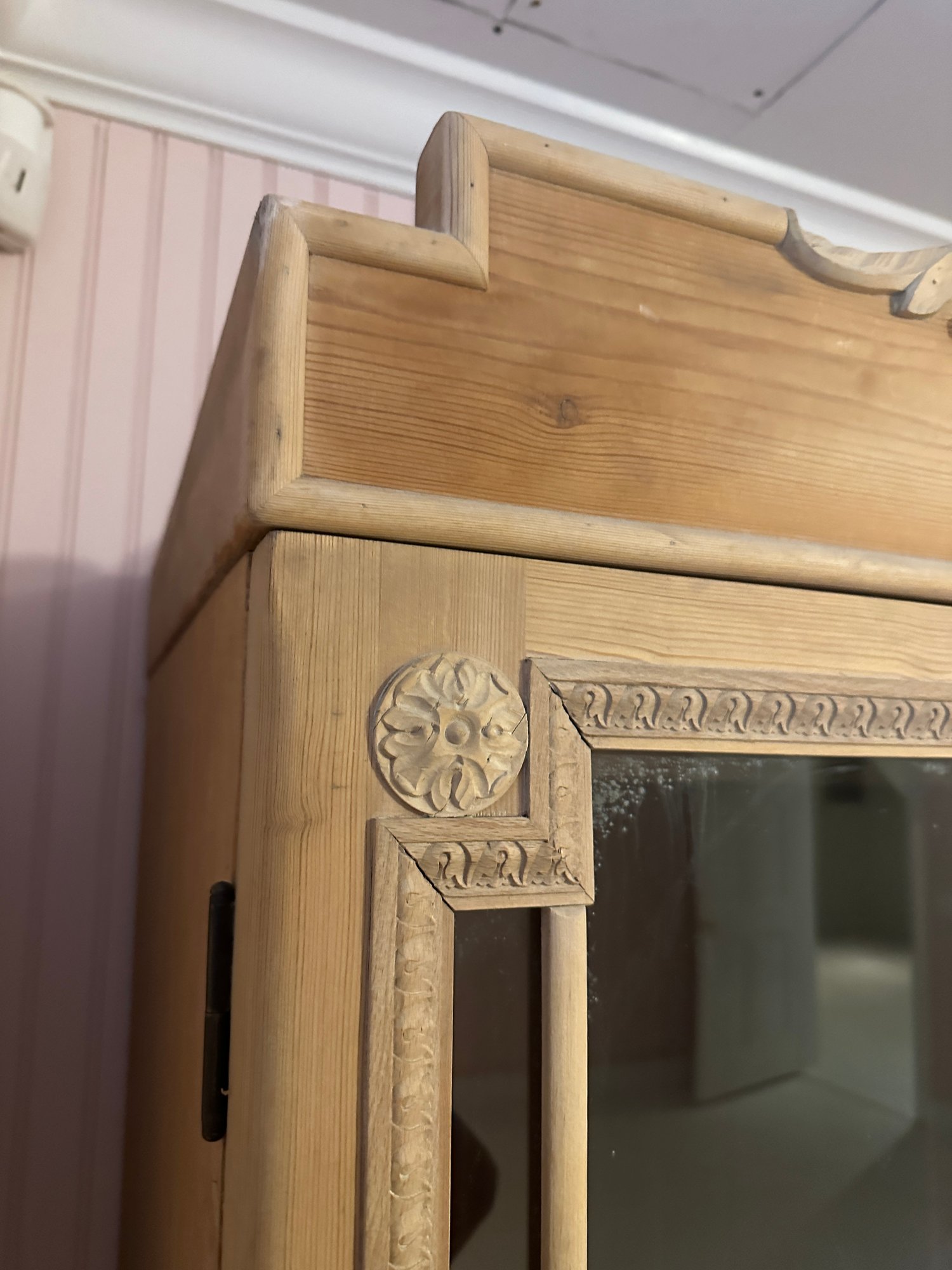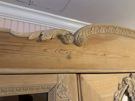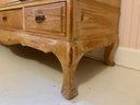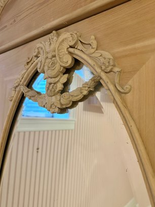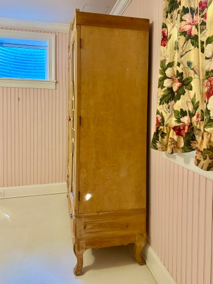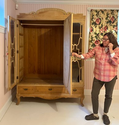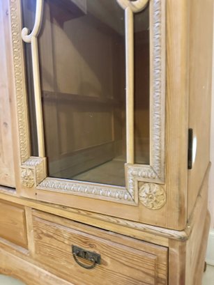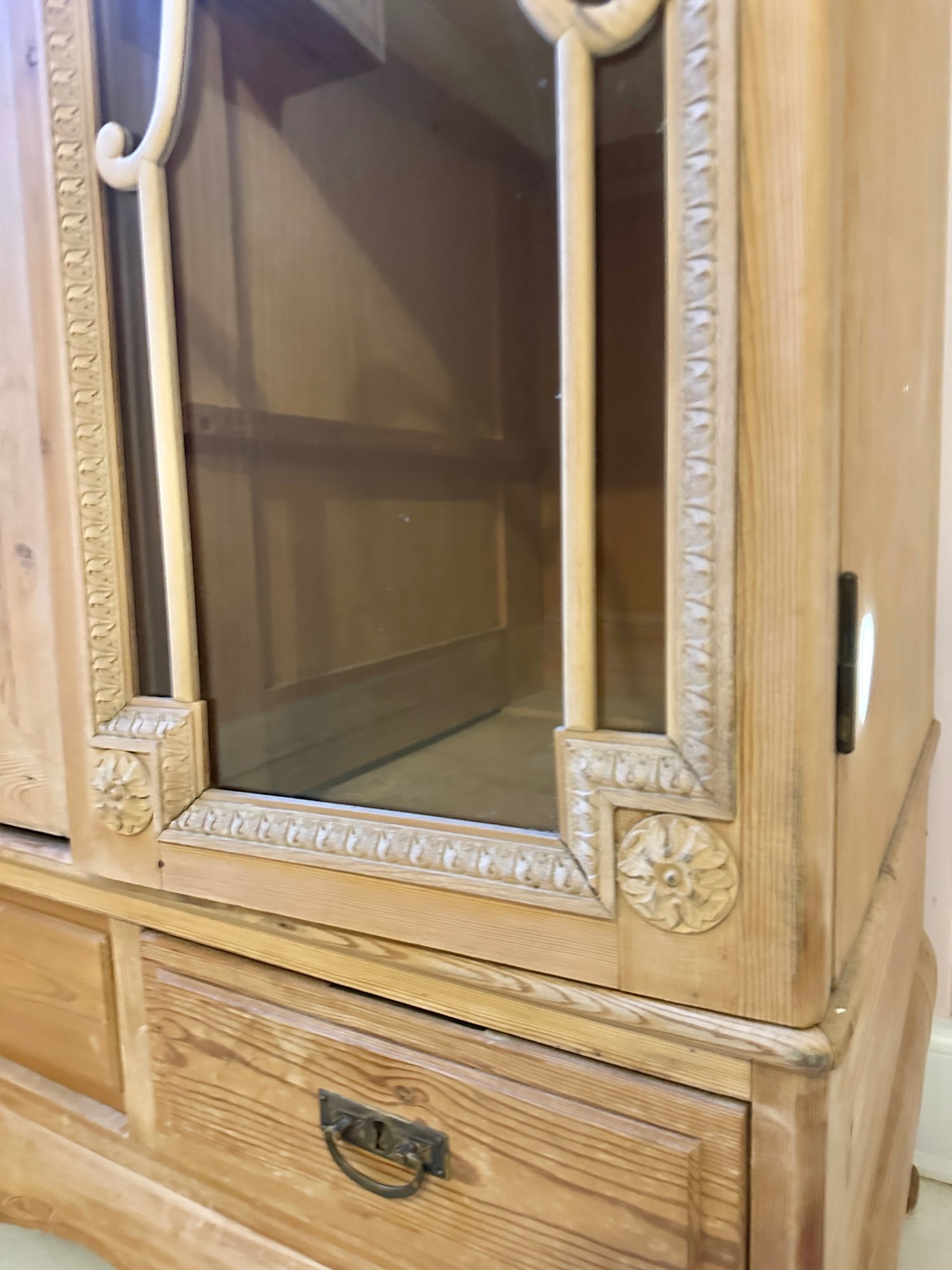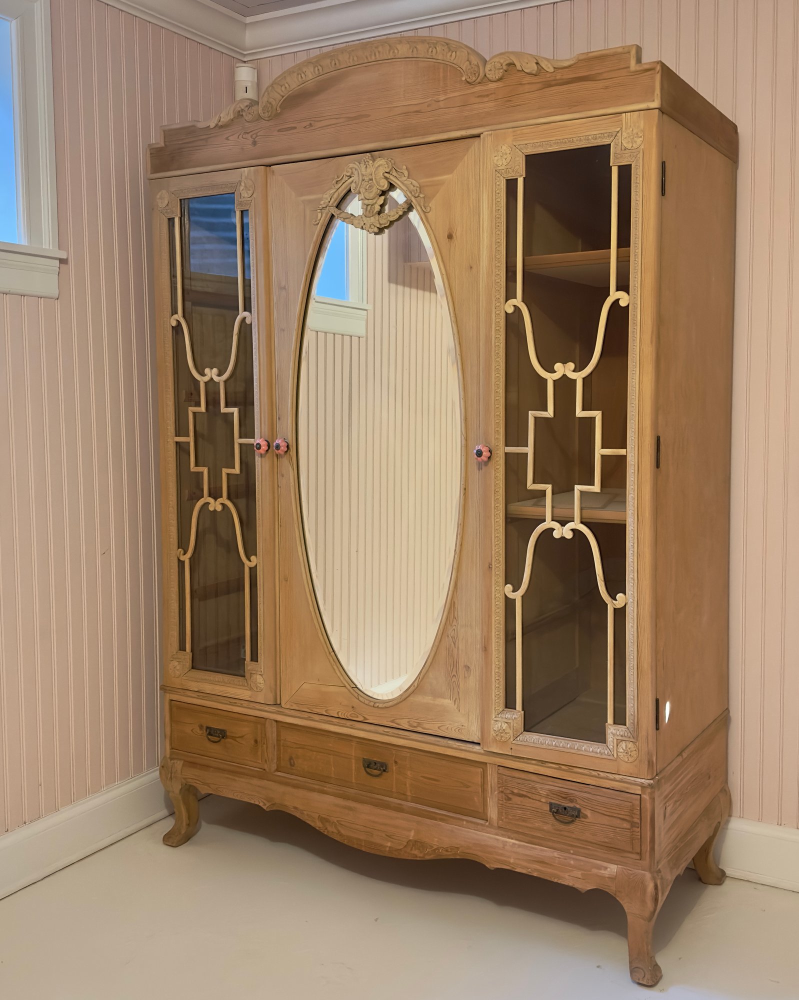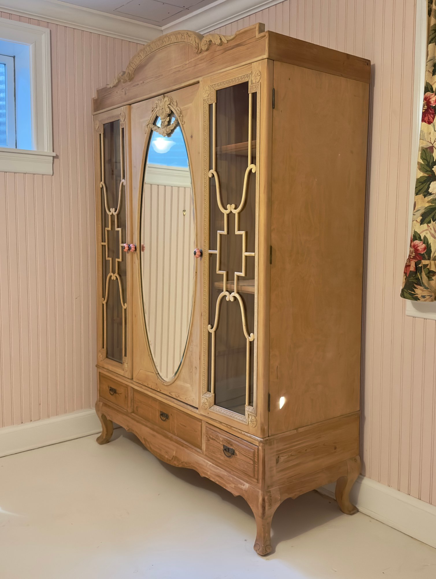 Central door fitted with beveled edge mirror, two glazed doors on either side with three drawers on cabrile legs Measures: