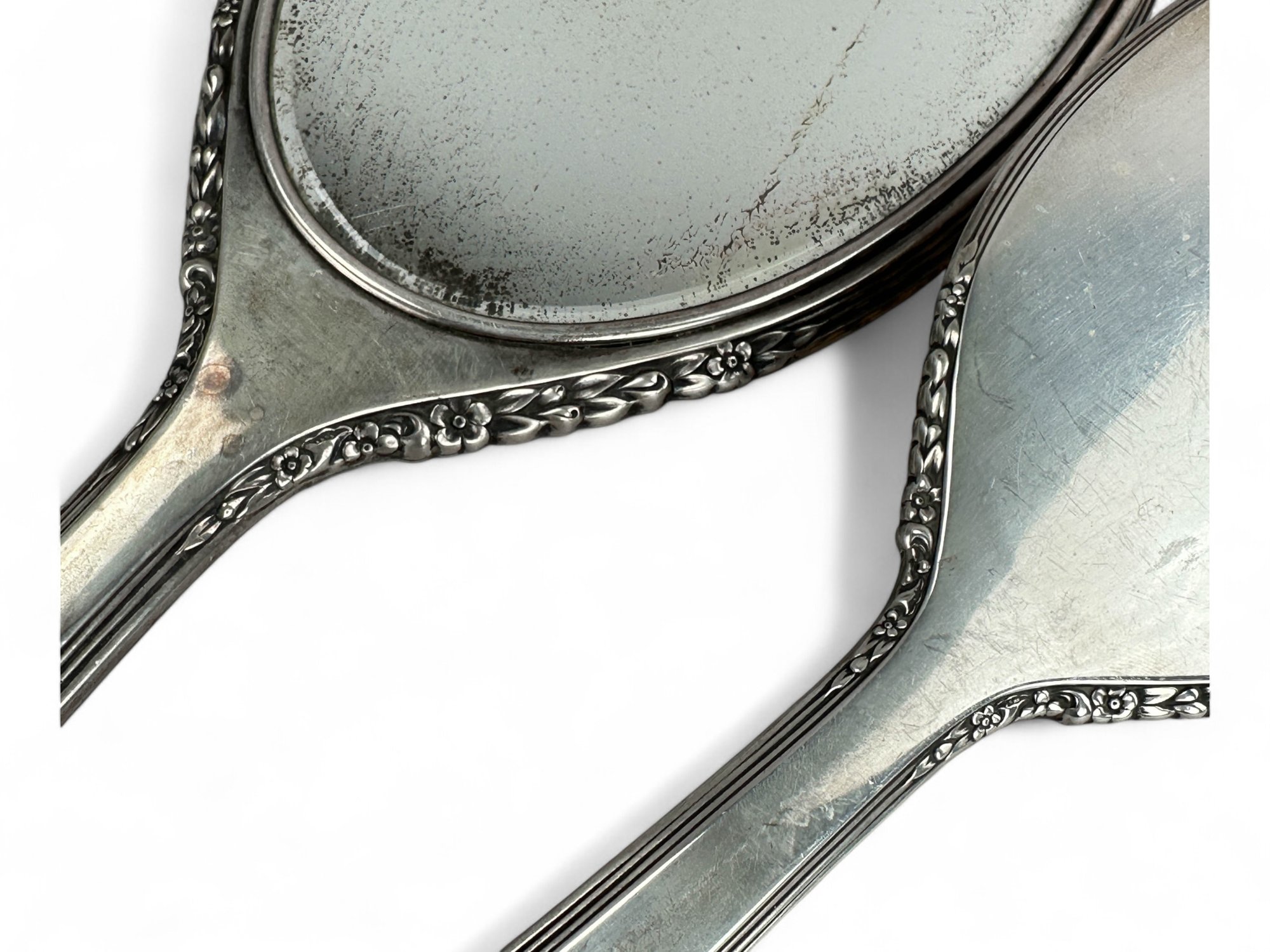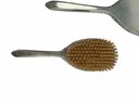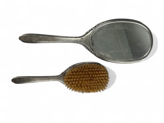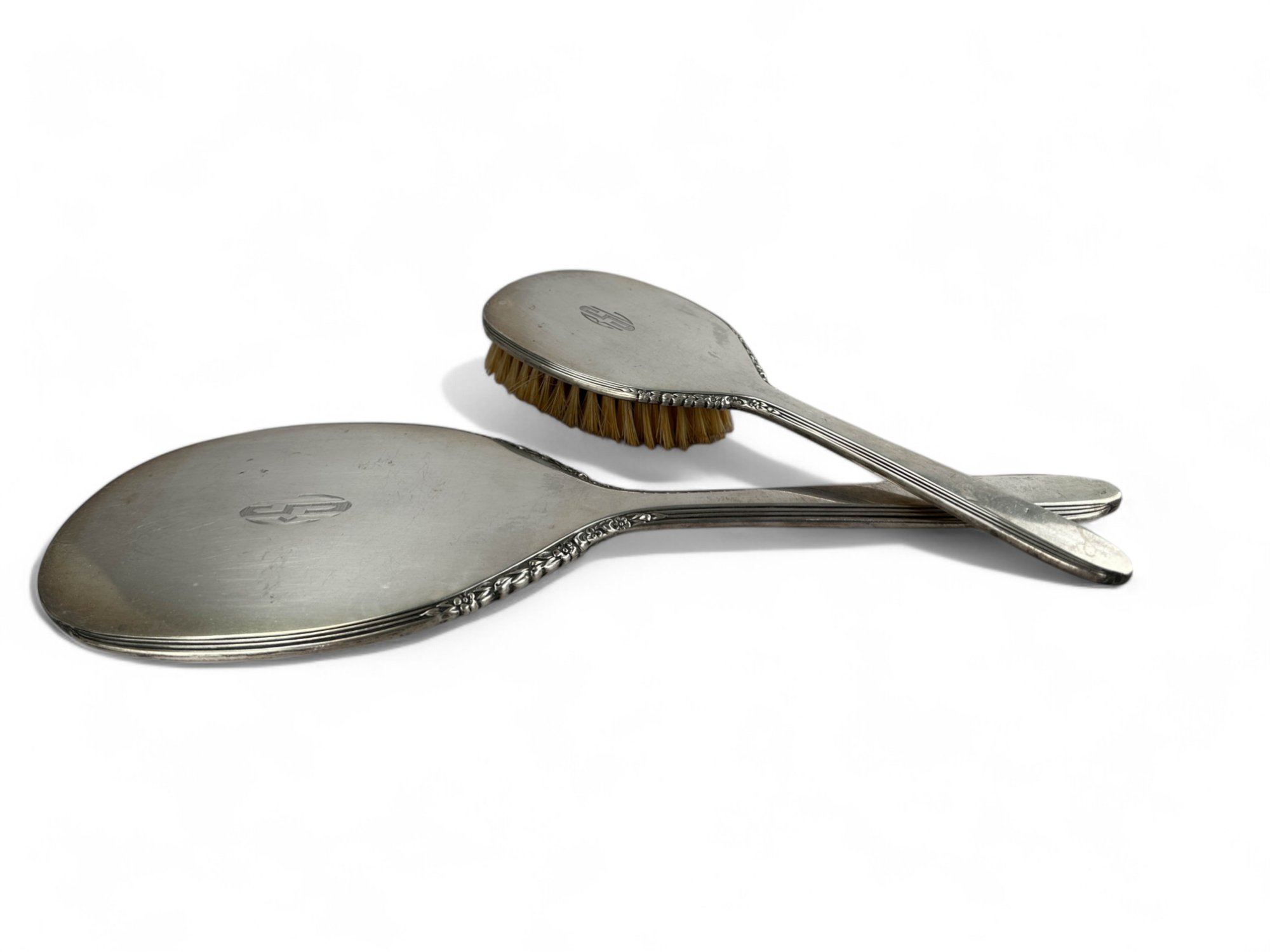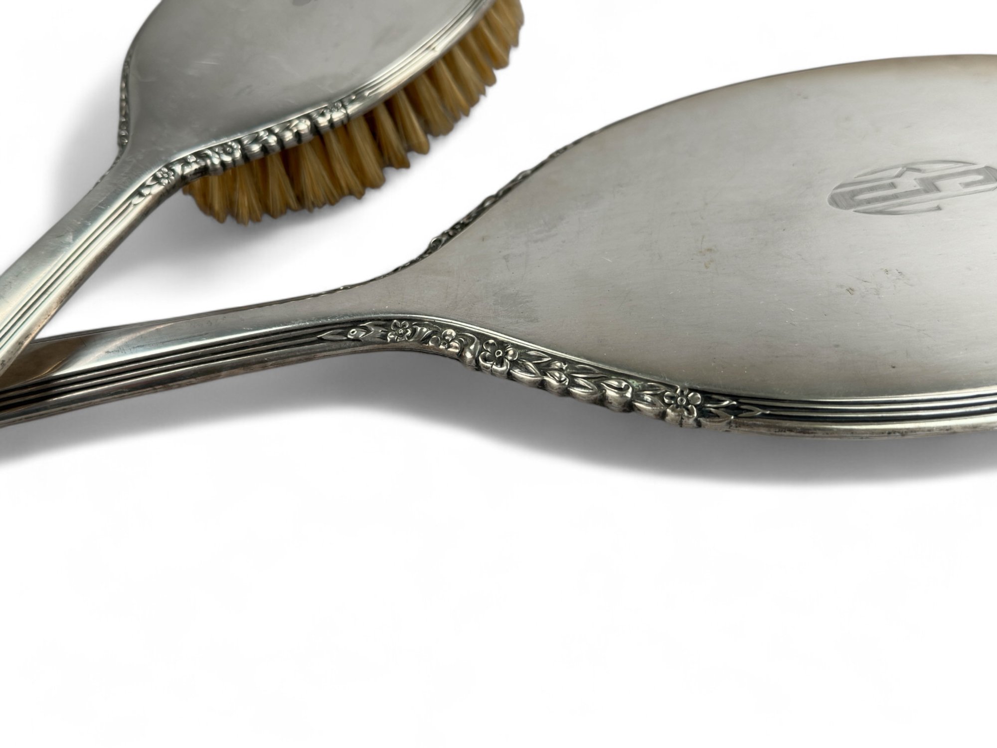 International silver, sterling silver brush and hand held mirror with floral repousse detailing on outer edging. Engraved with Initials.