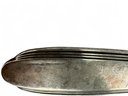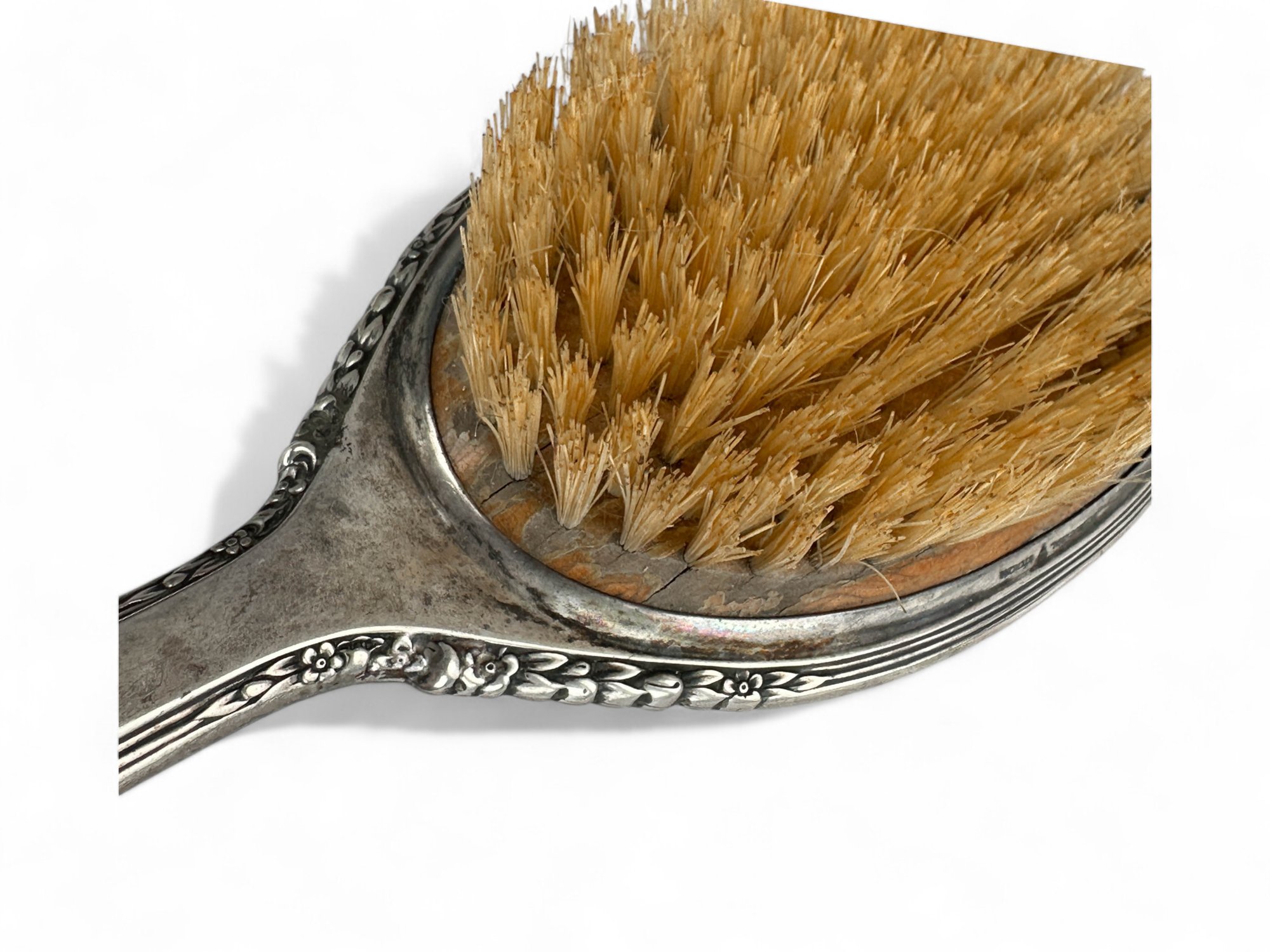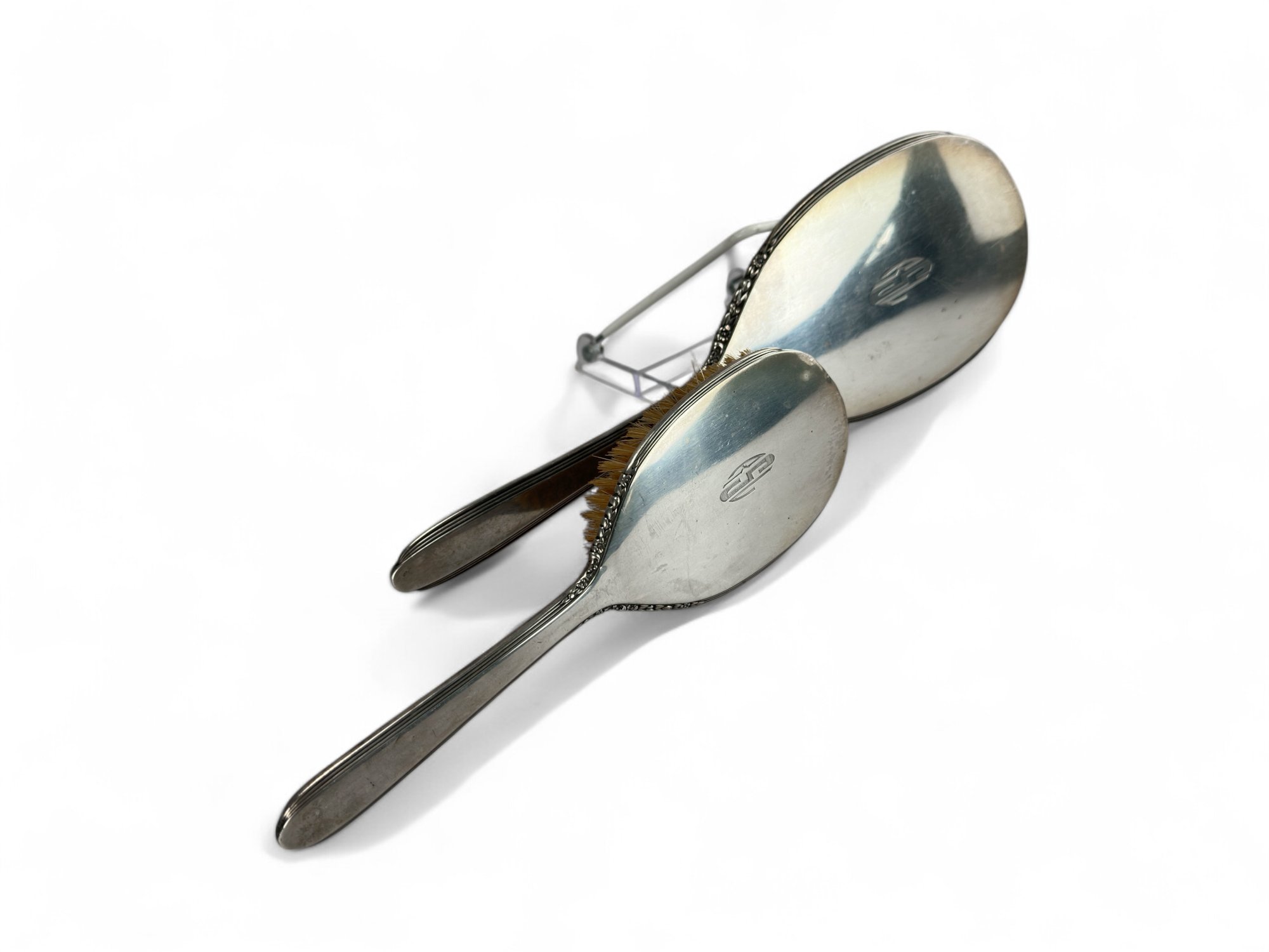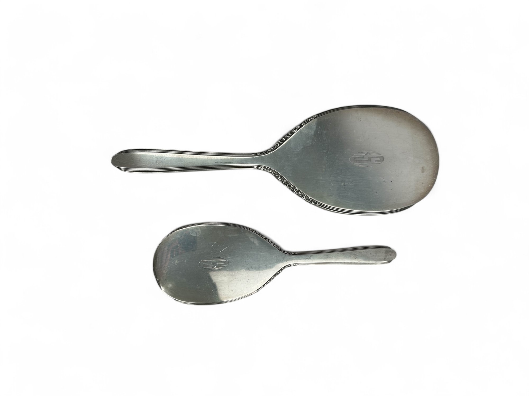 International silver, sterling silver brush and hand held mirror with floral repousse detailing on outer edging. Engraved with Initials.