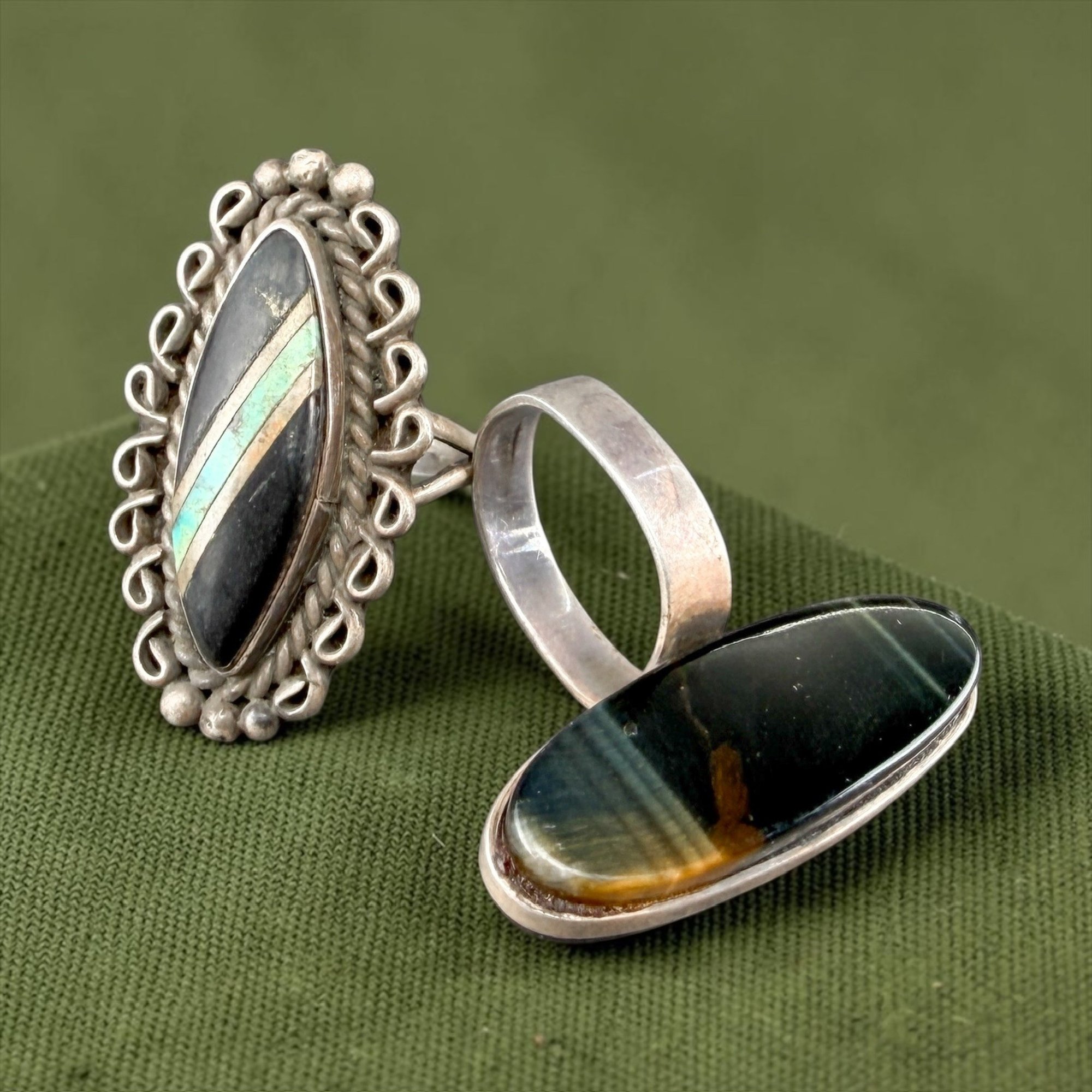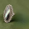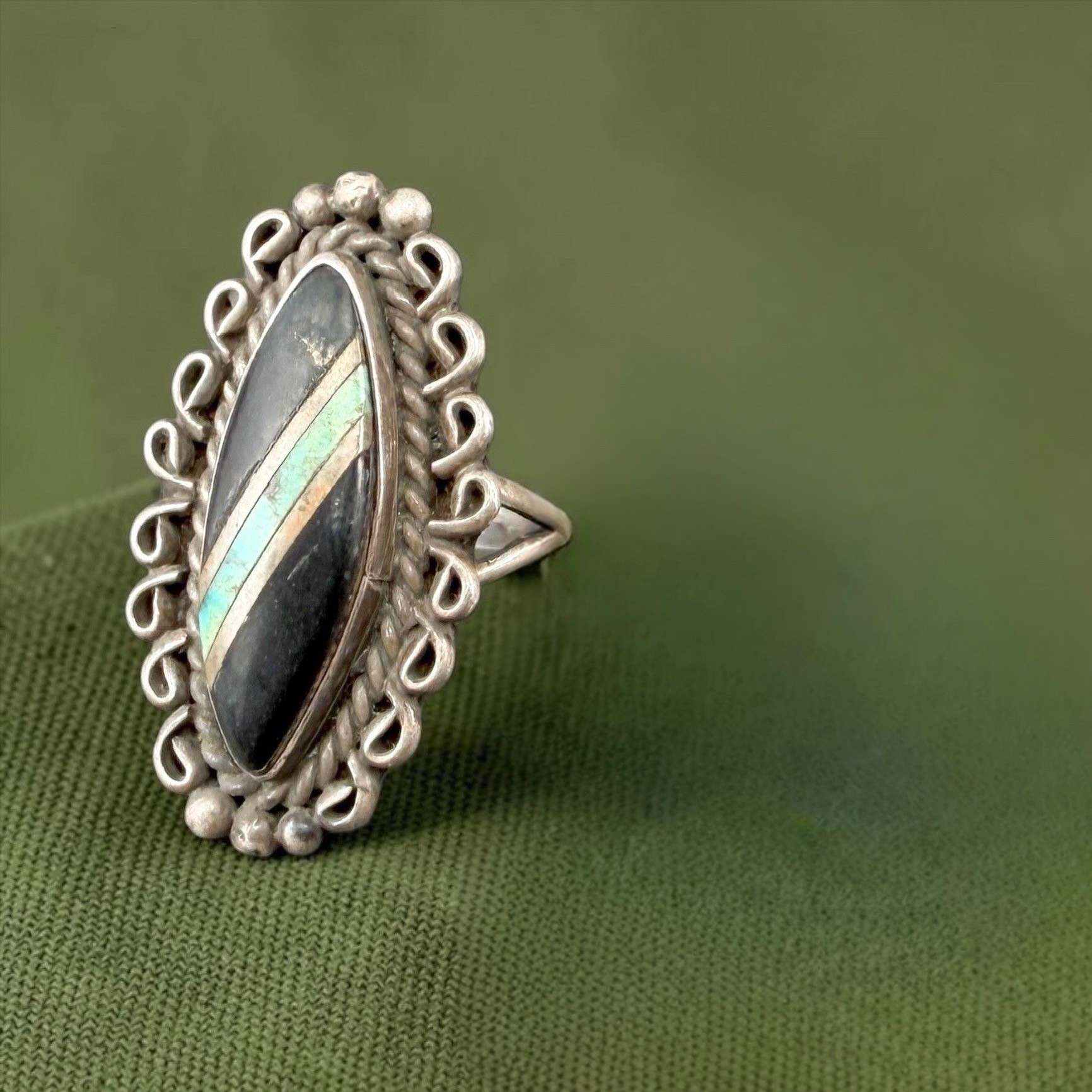 Navajo native american sterling silver ring with marquise shaped black onyx stone with diagonal inlay of turquoise and silver
