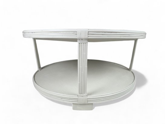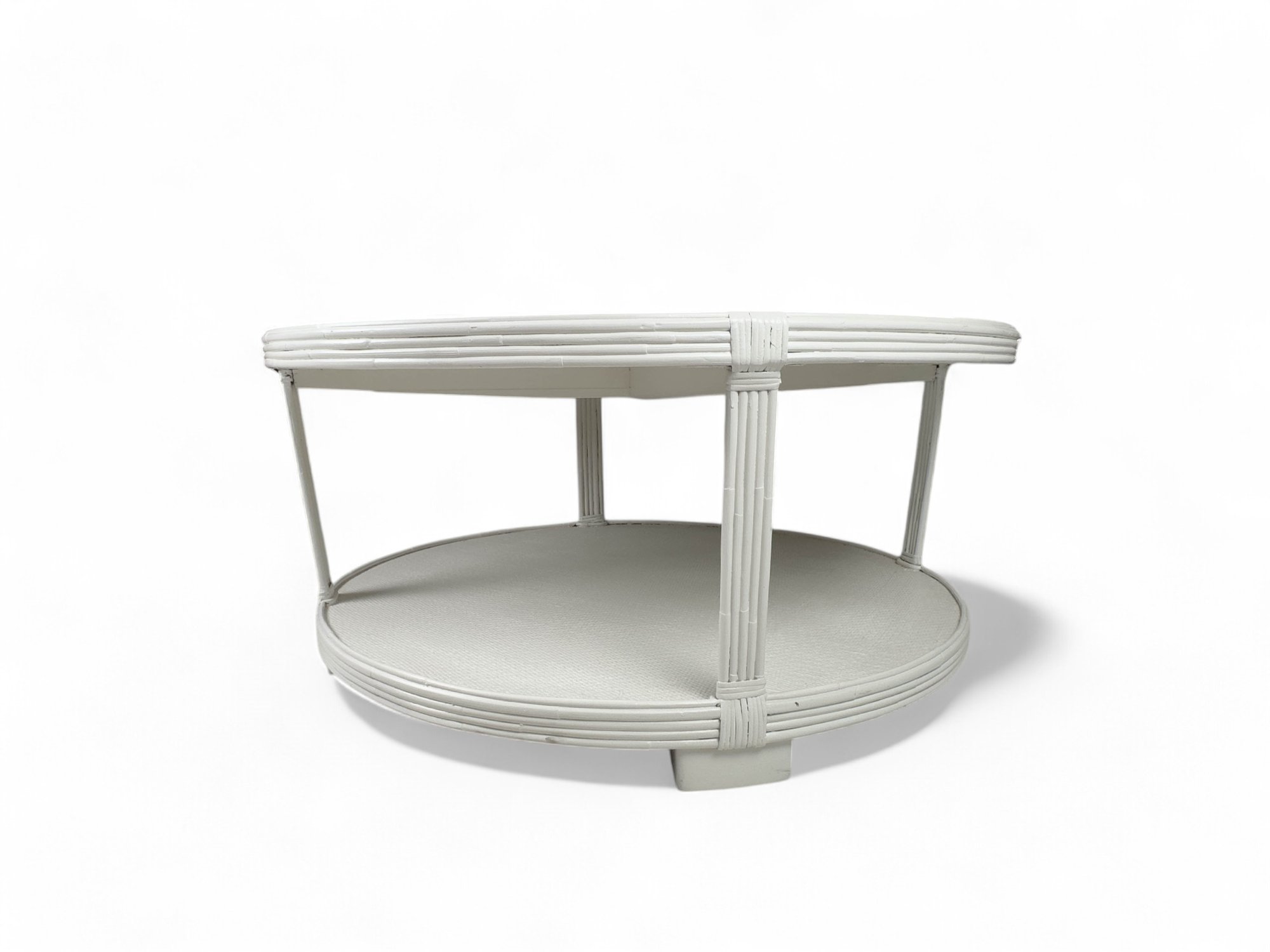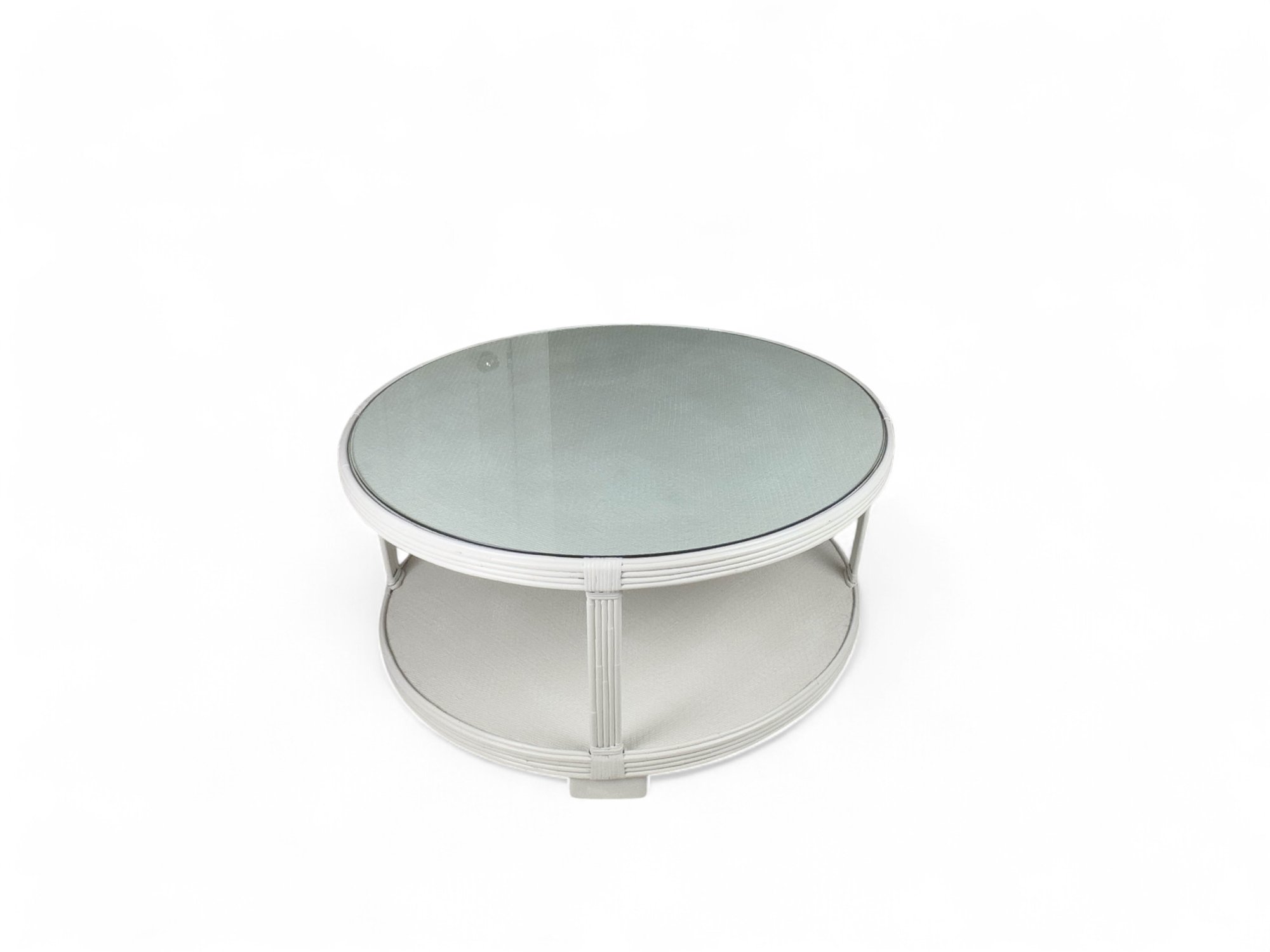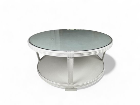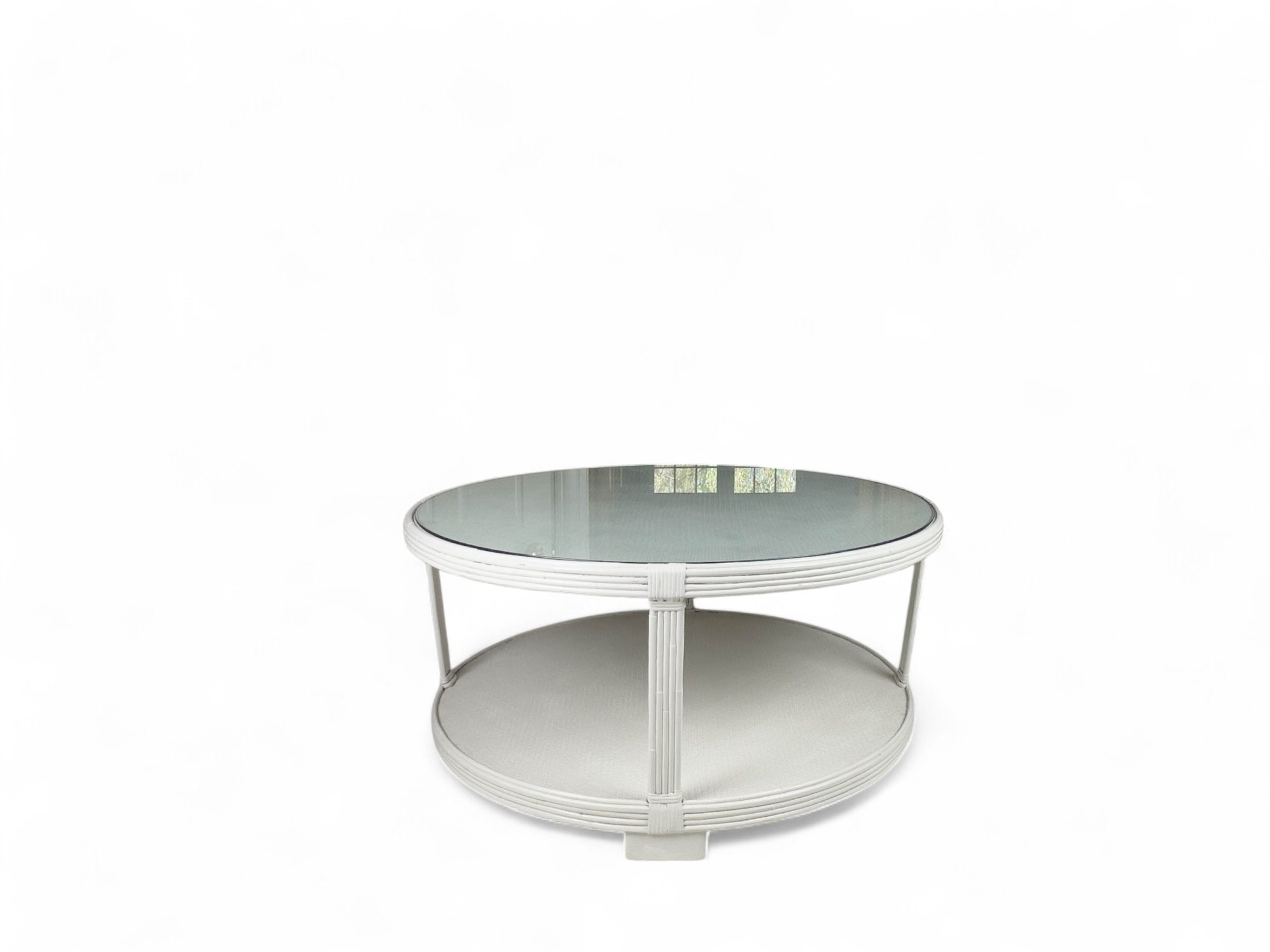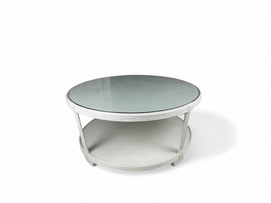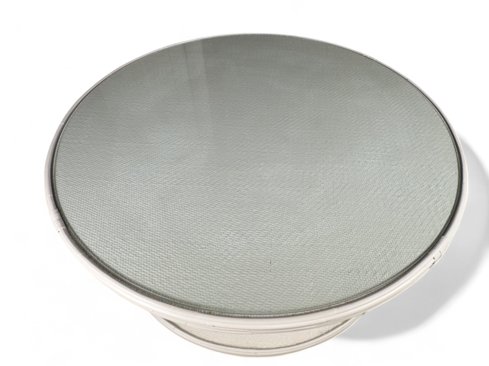 Phenomenal tapered top to base round center or coffee table with woven top covered by perfectly cut glass overlay.