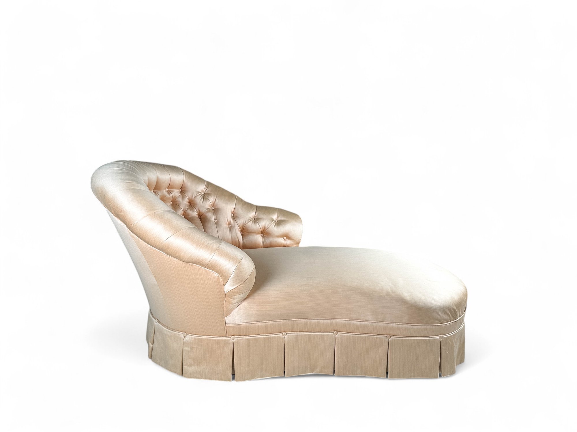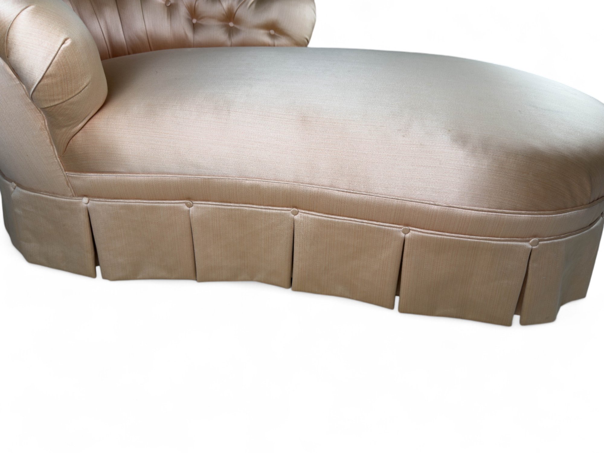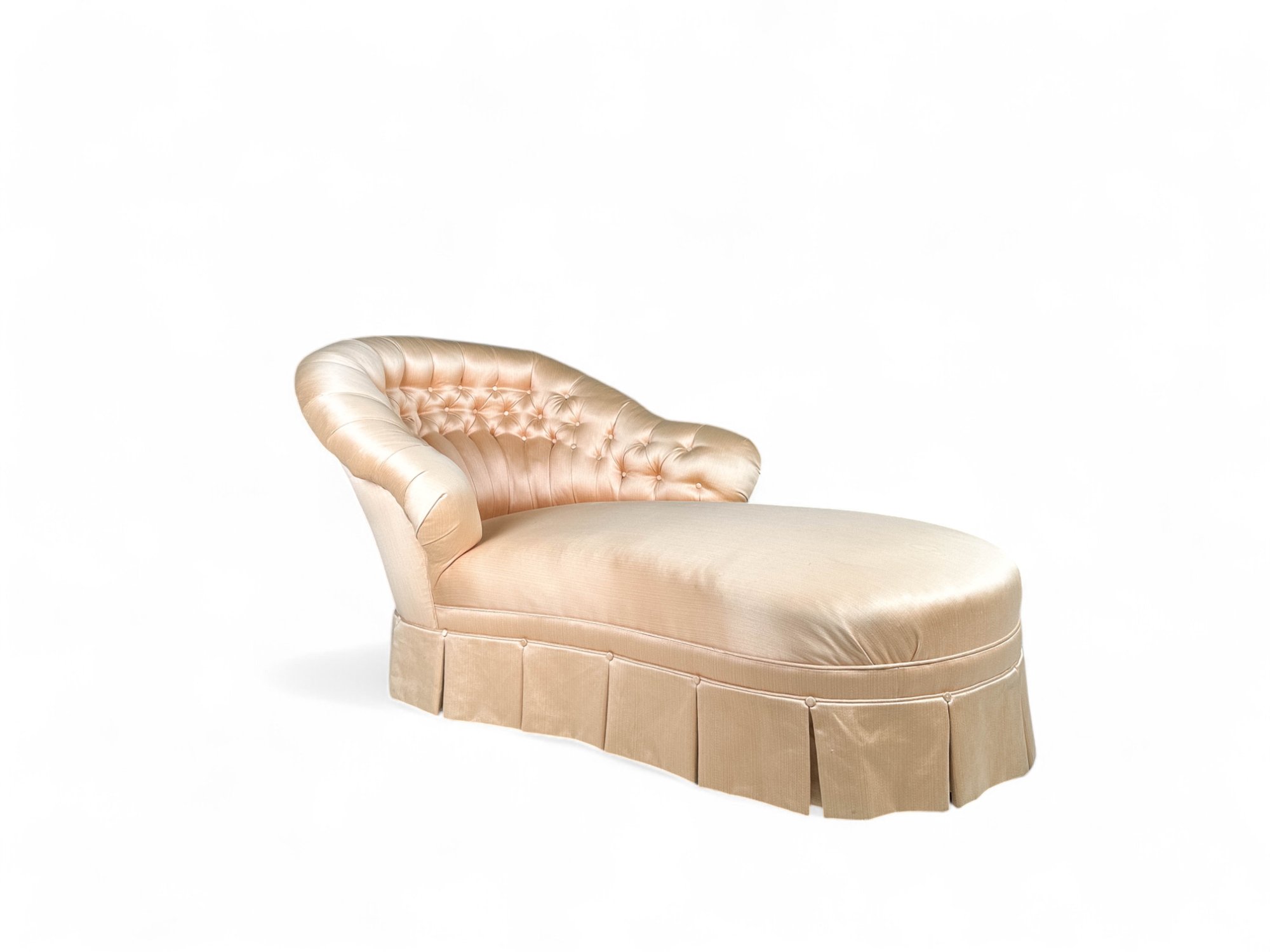 Napoleon II Style Chaise Lounge in an apricot satin with skirt and tufte back side. Purchase at Doyle & Doyle Auction house in New York CIty.