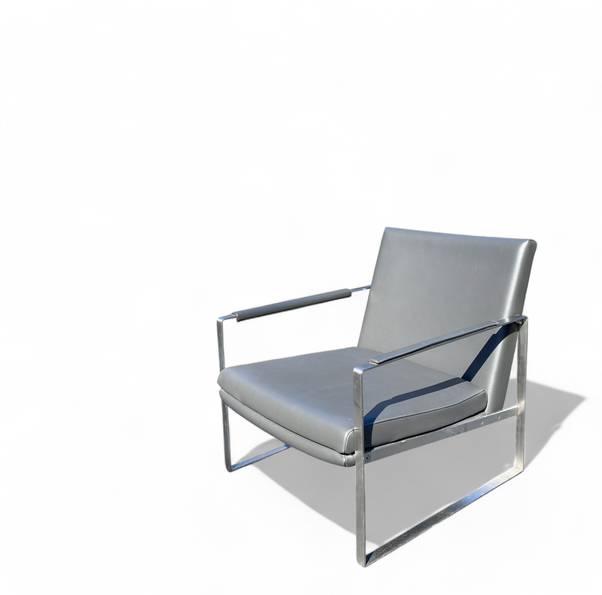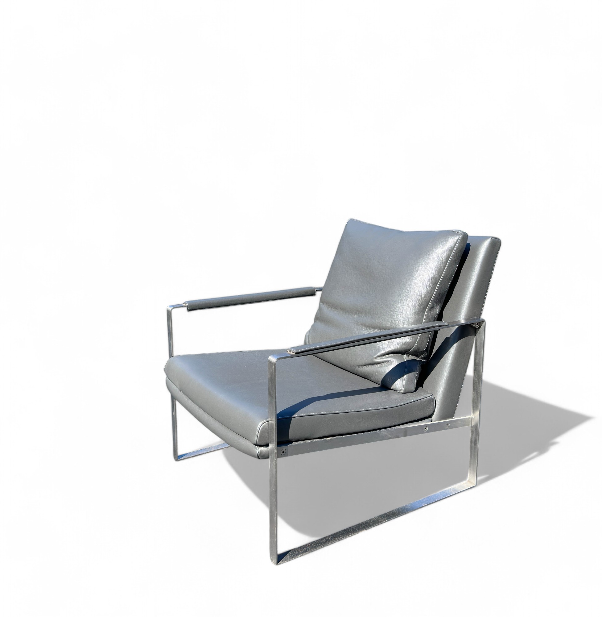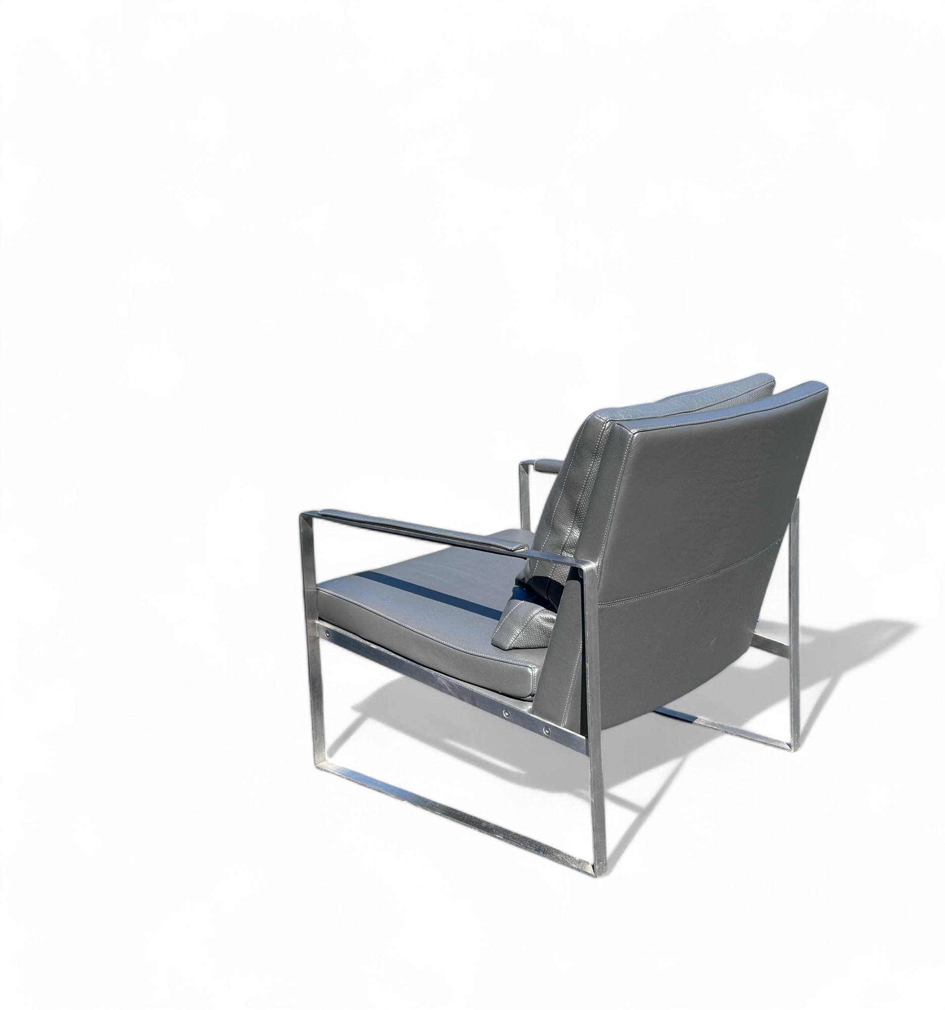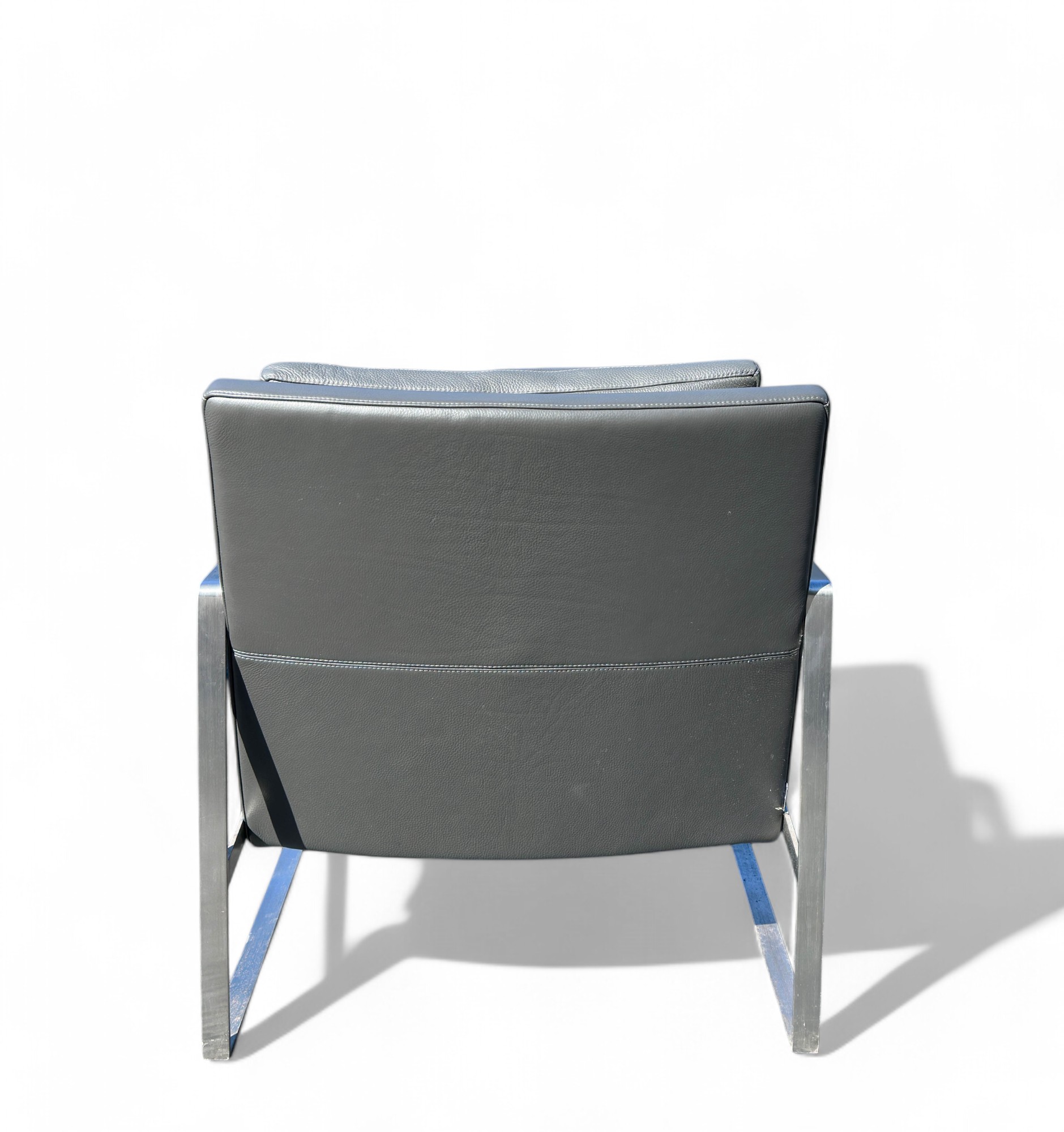 Heavy Brushed Nickel Base with Soft Grey leather Upholstery. Quality Designer Chair which is very comfortable.