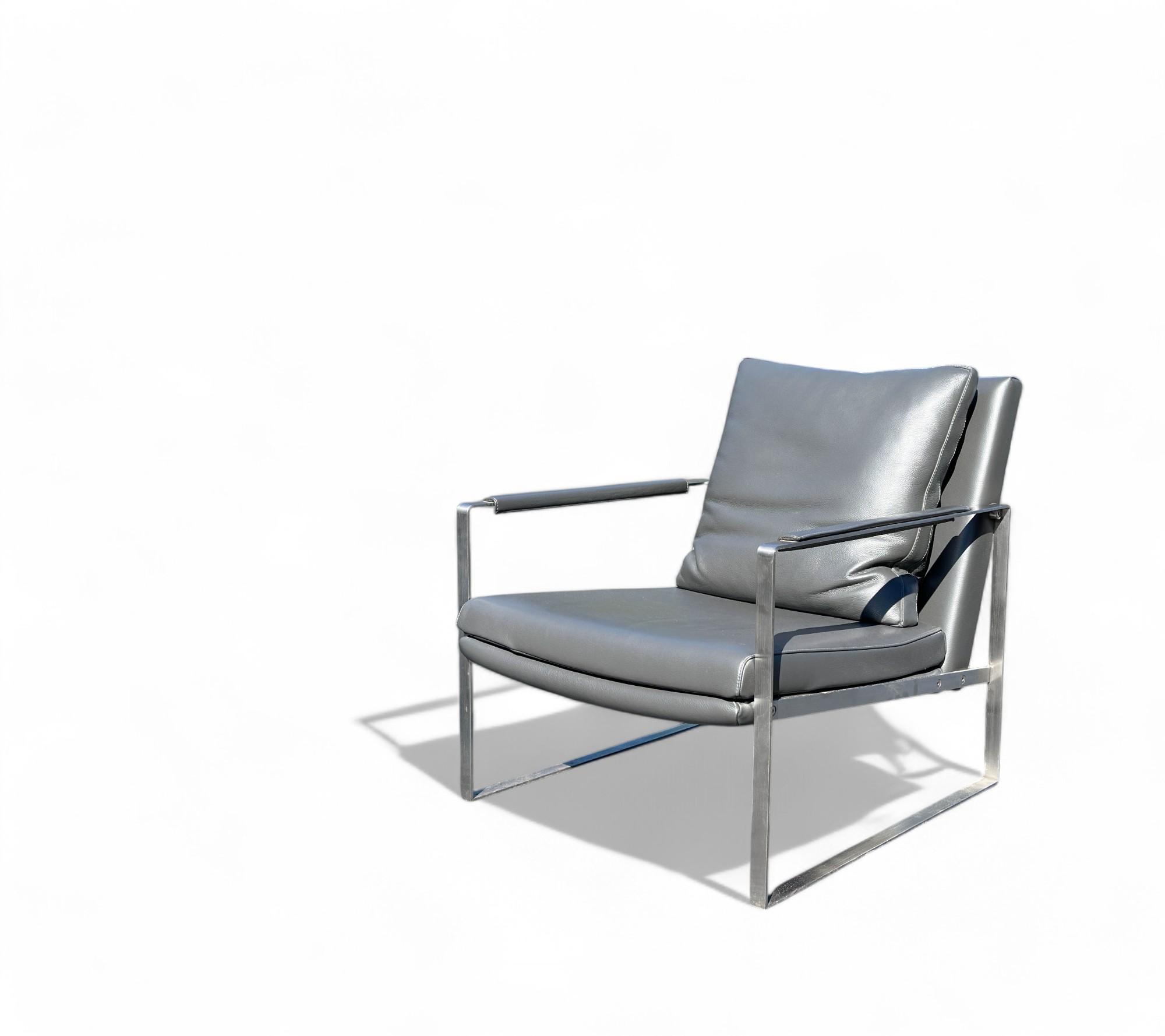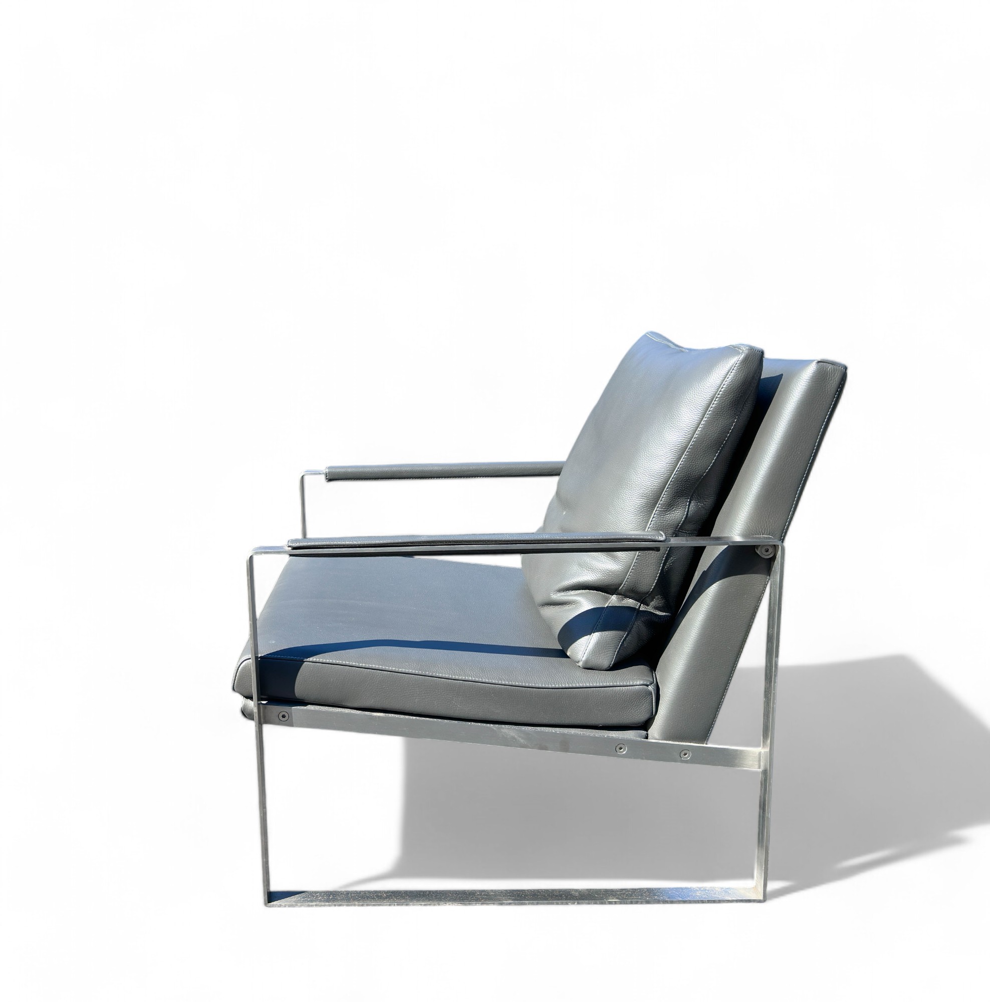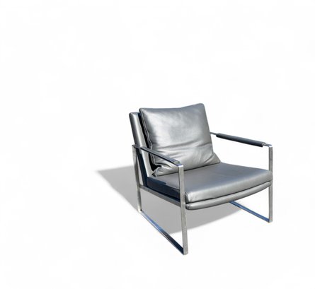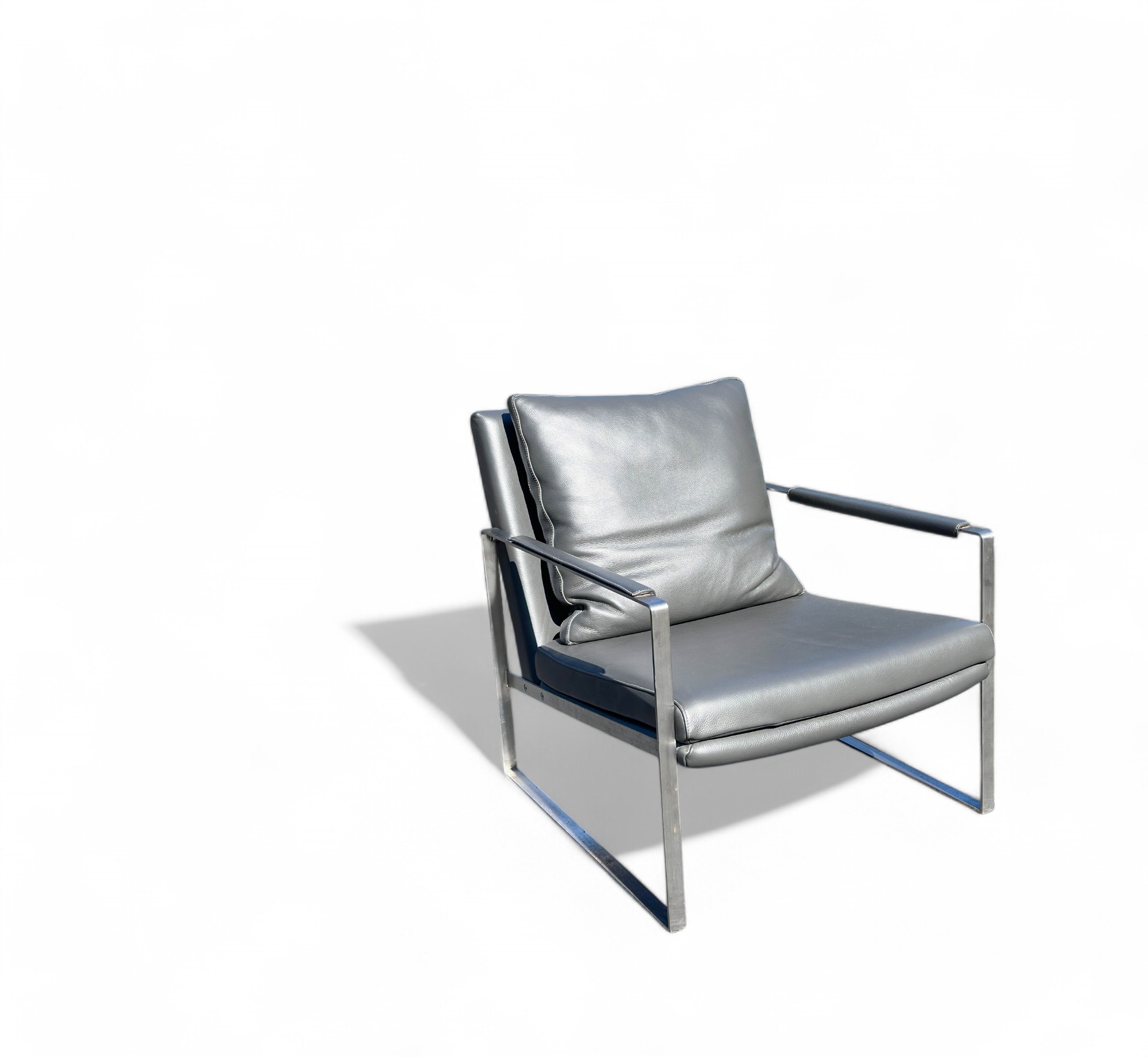 Heavy Brushed Nickel Base with Soft Grey leather Upholstery. Quality Designer Chair which is very comfortable.