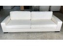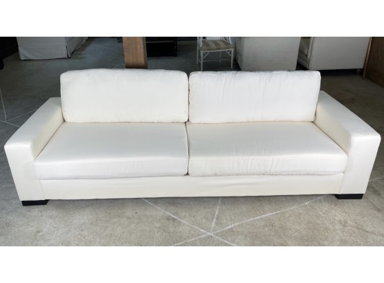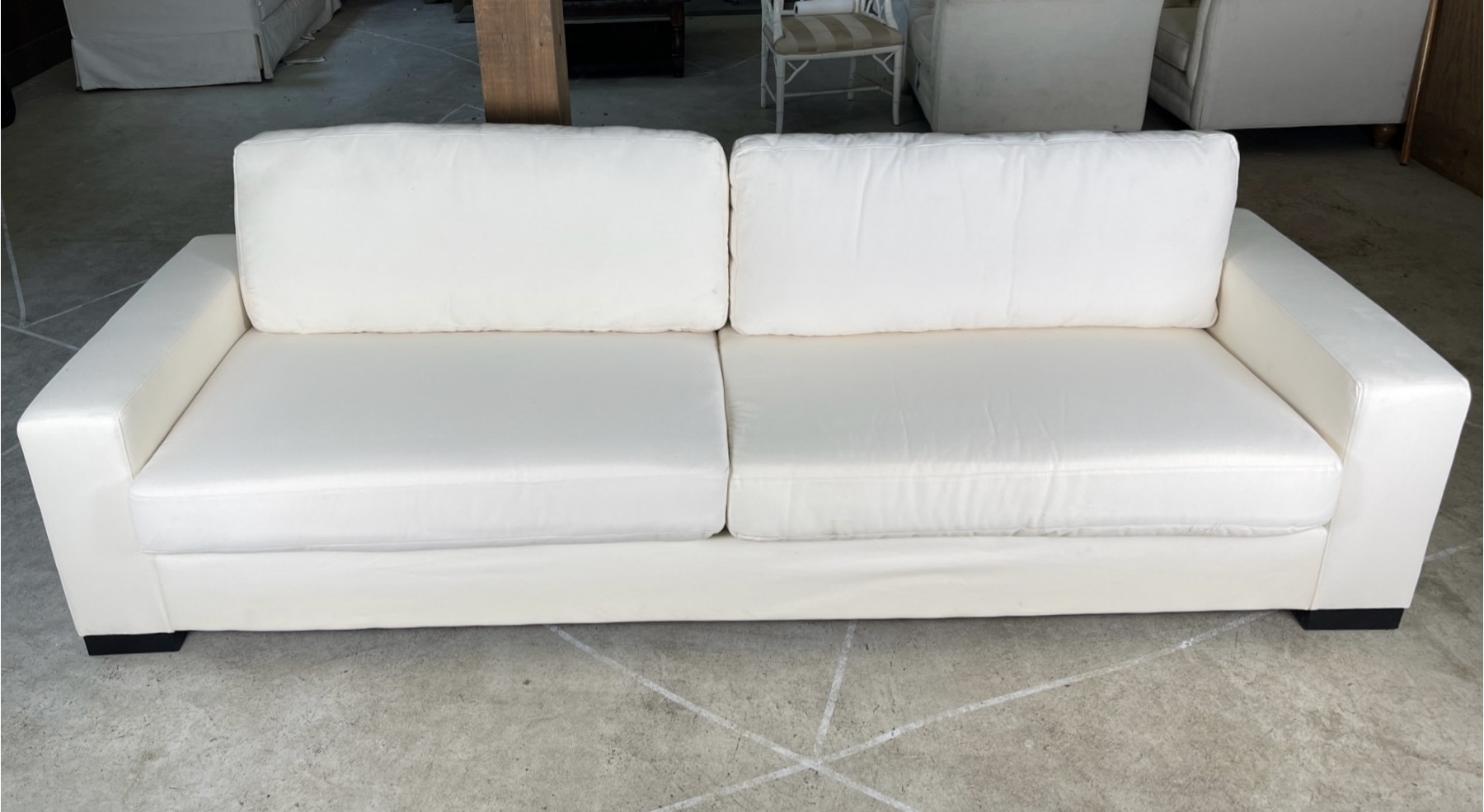 Two Cushion, removable back cushion, wide track arms and low, wooden stained black feet created ad sleek sofa with clean lines.