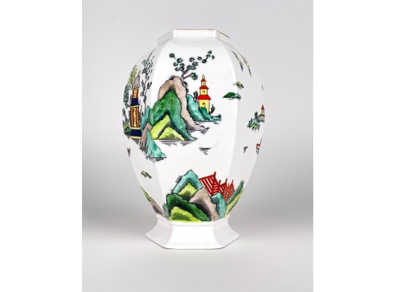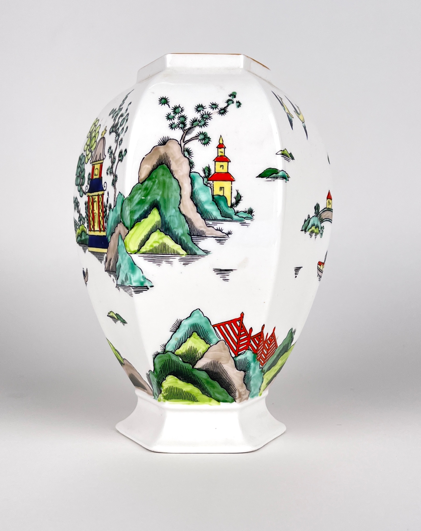 Fine bone china with hand painted Chinese detail like pagodas and landscaped.