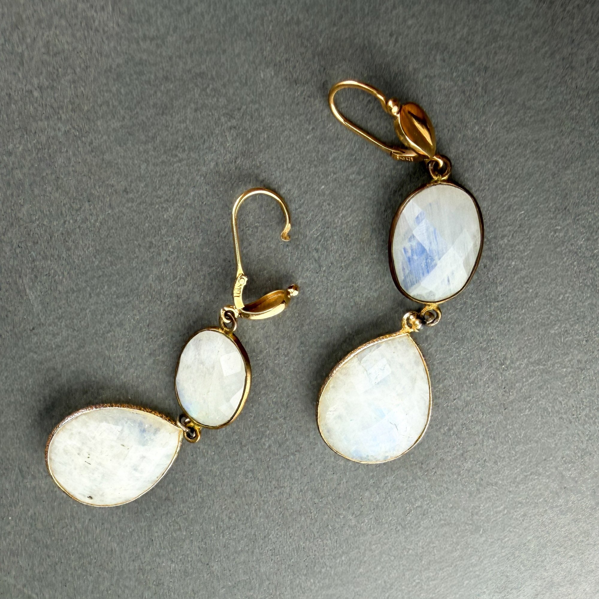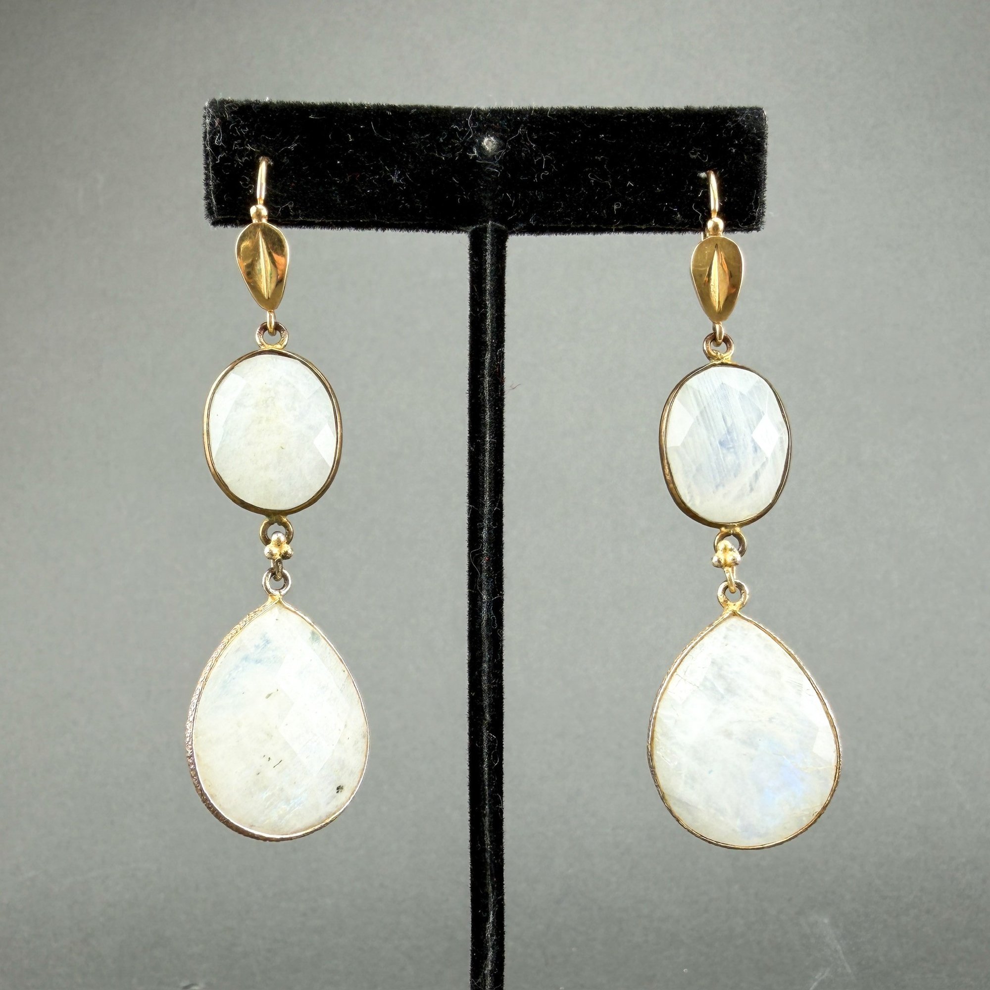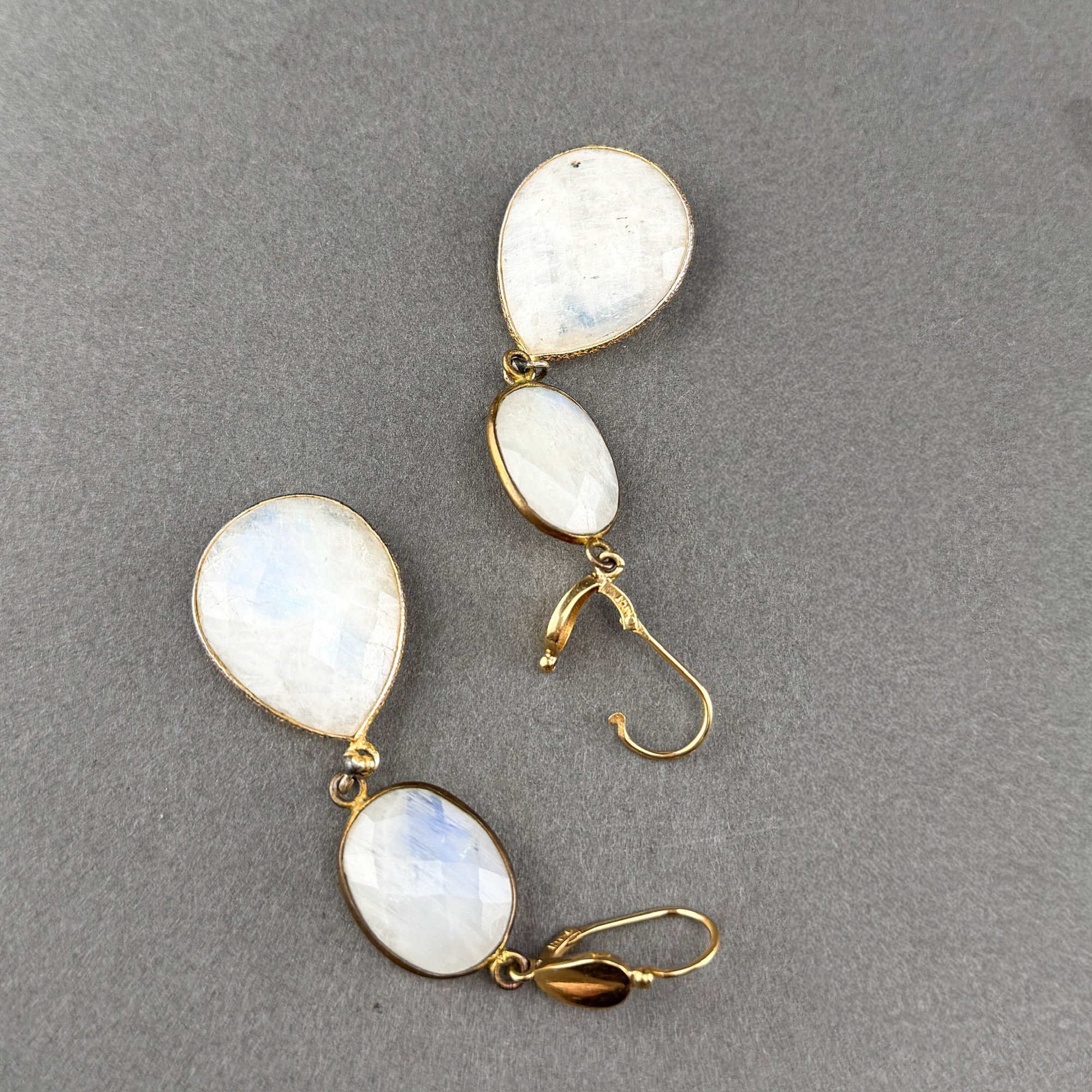 Vintage 18kt yellow gold settings with double oval drop, faceted moonstones. Ted Muehling Style accents.