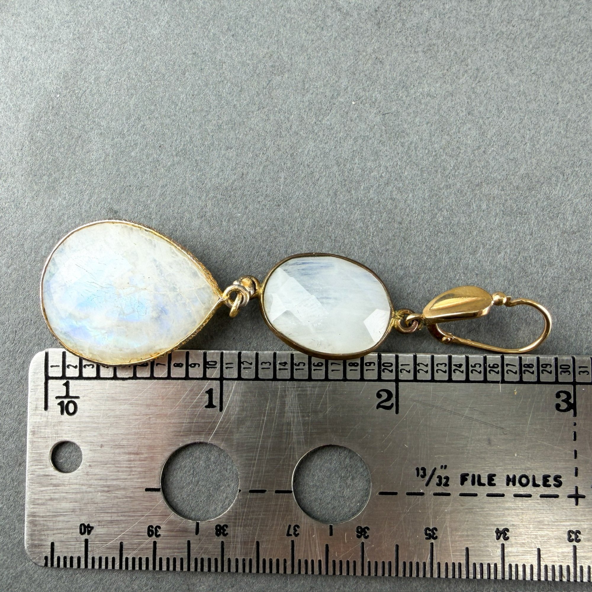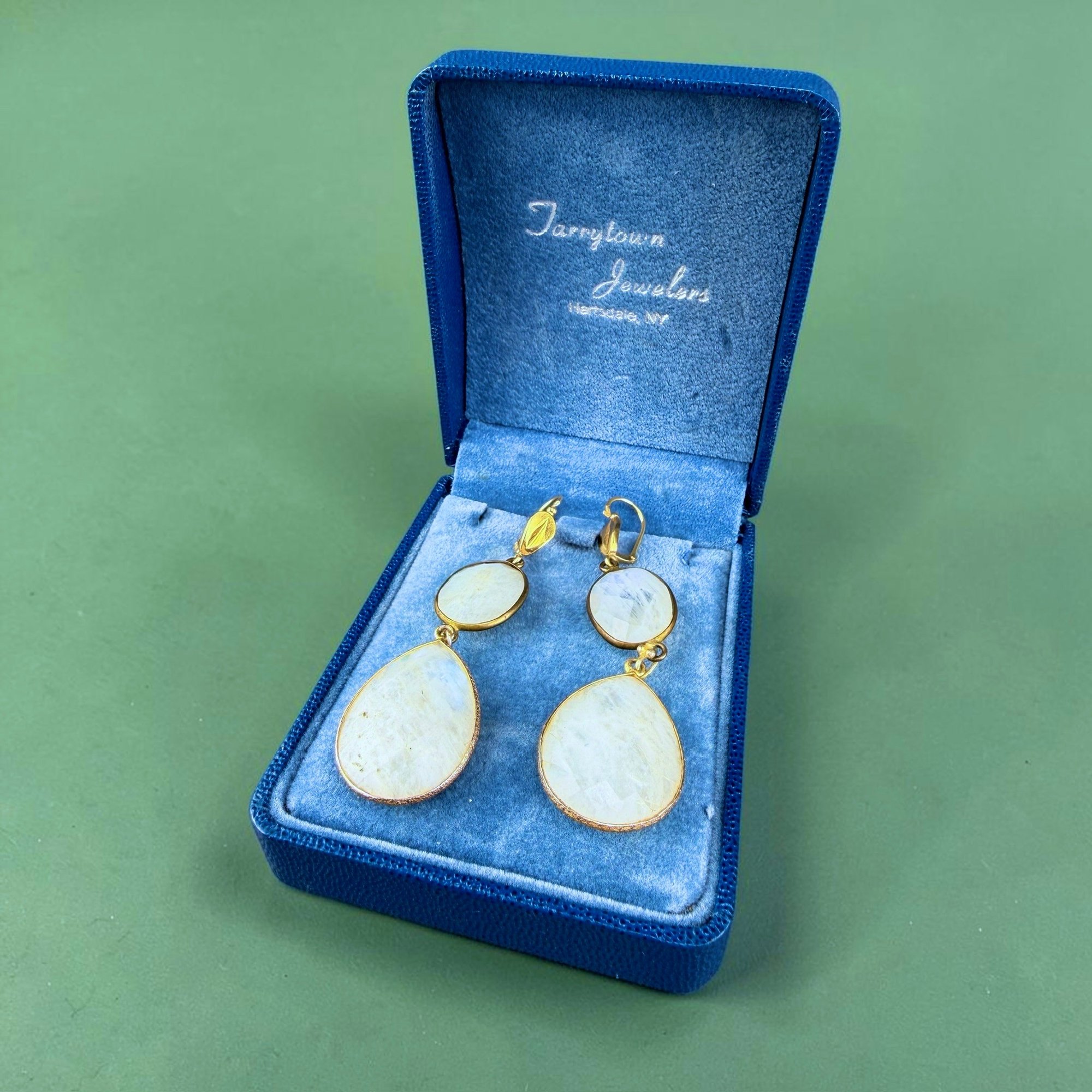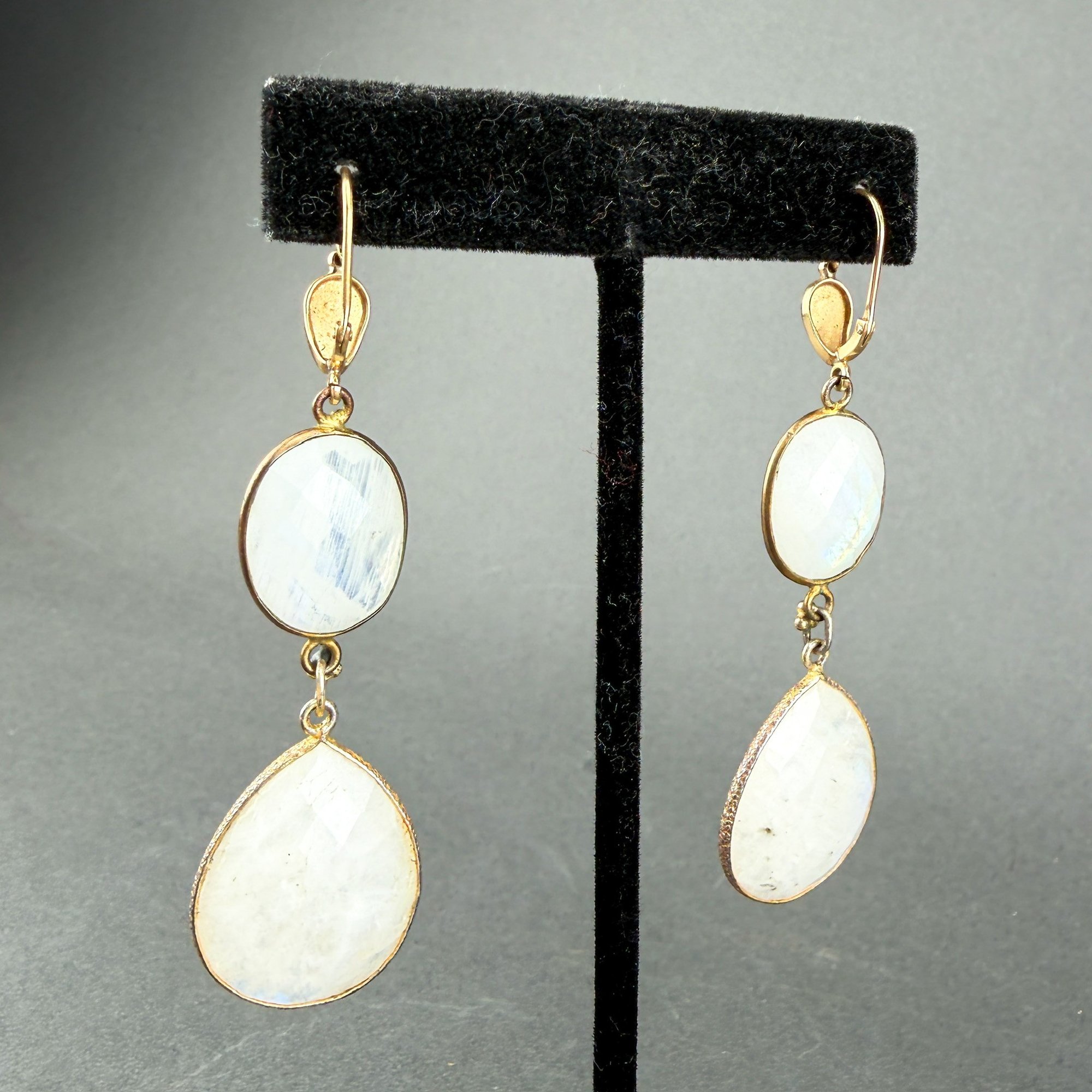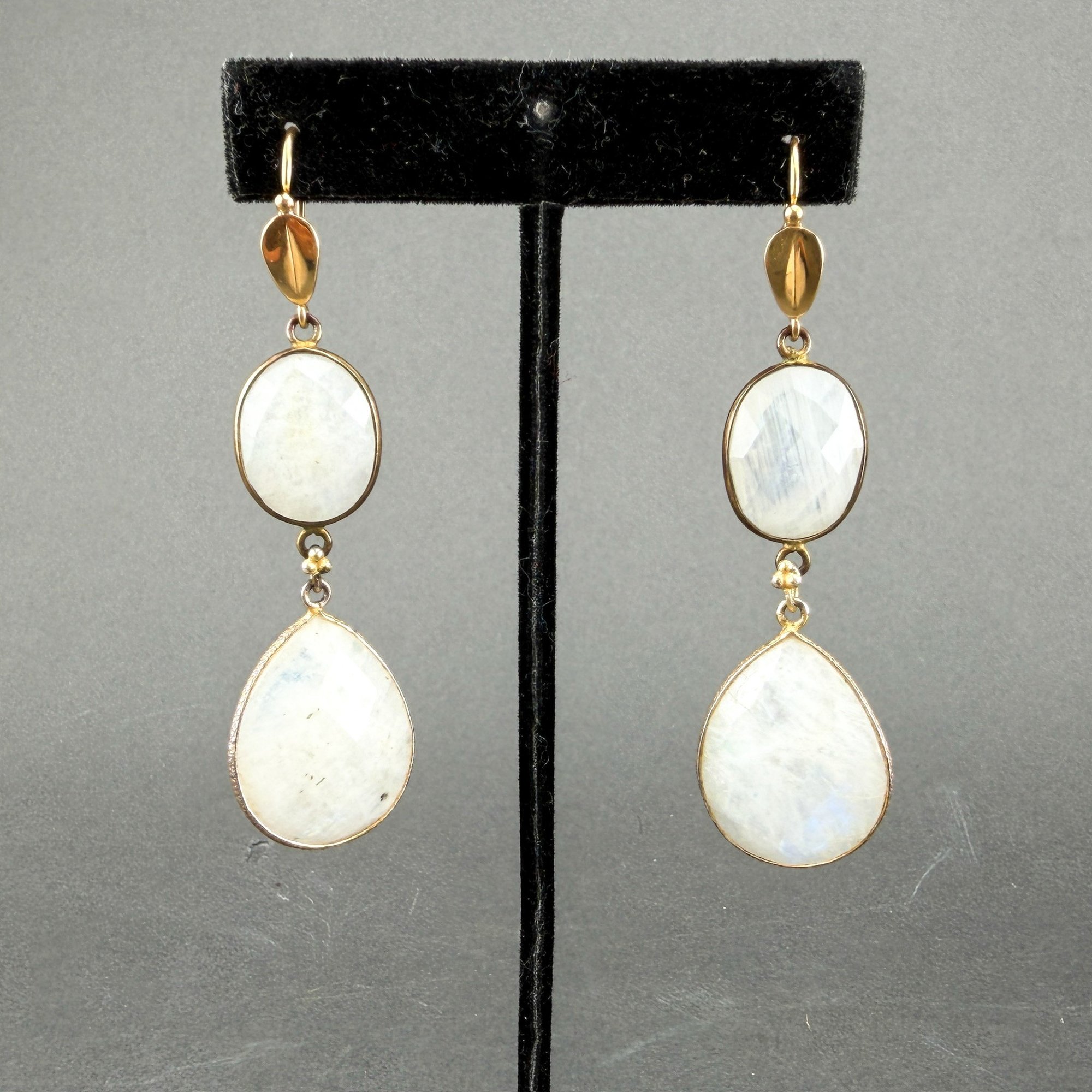 Vintage 18kt yellow gold settings with double oval drop, faceted moonstones. Ted Muehling Style accents.