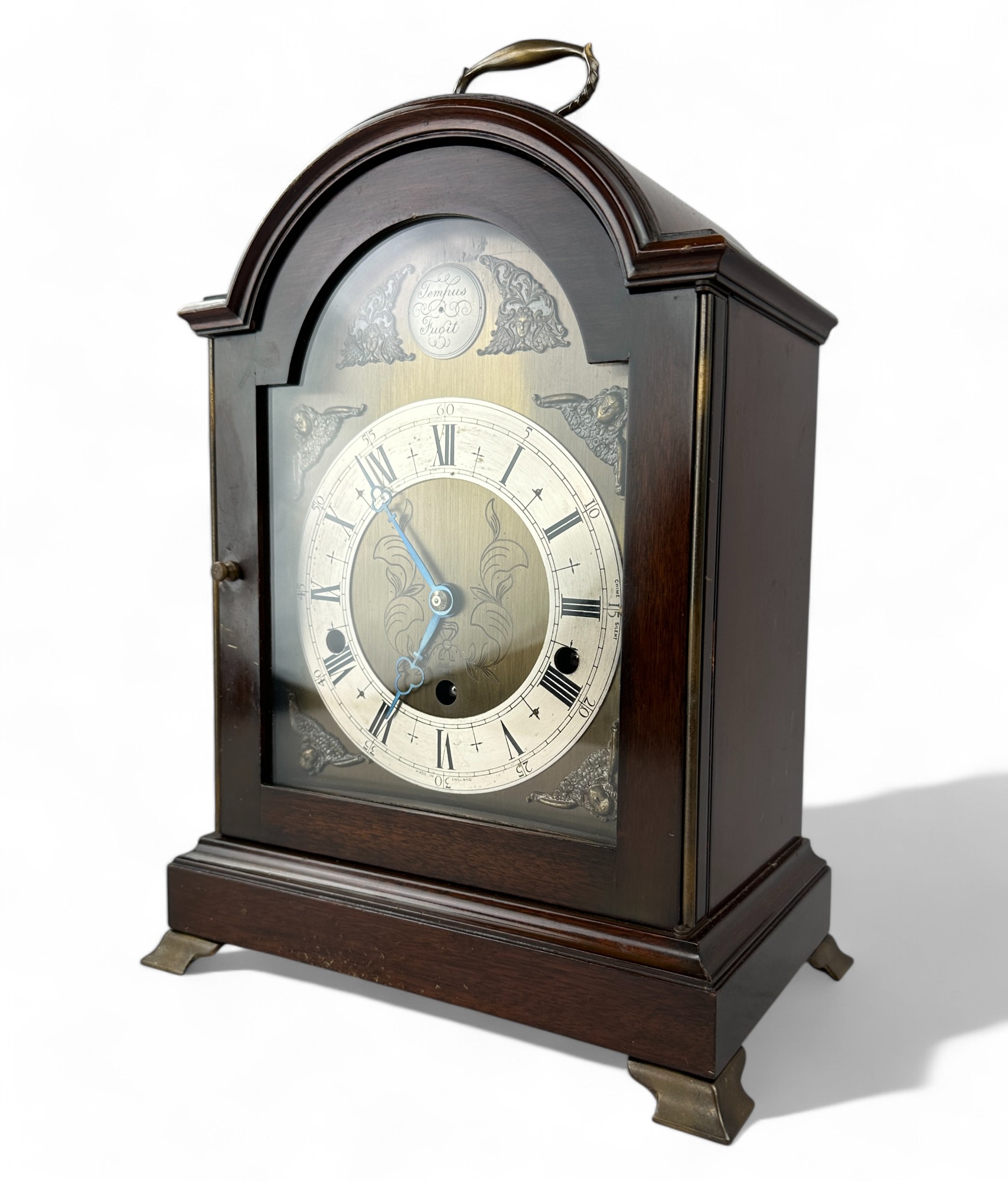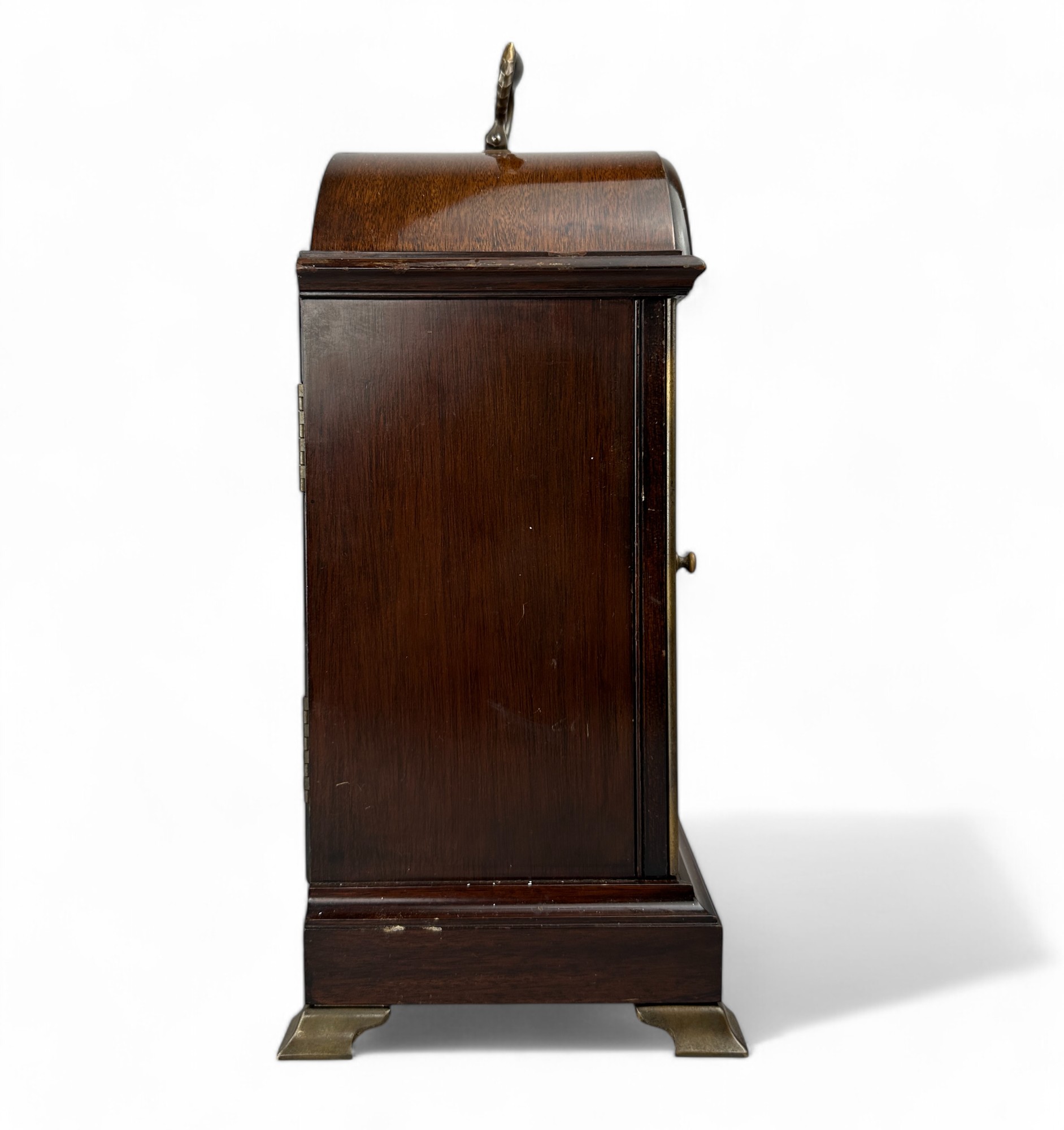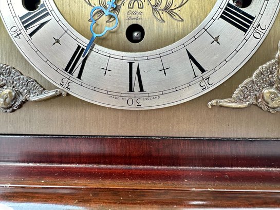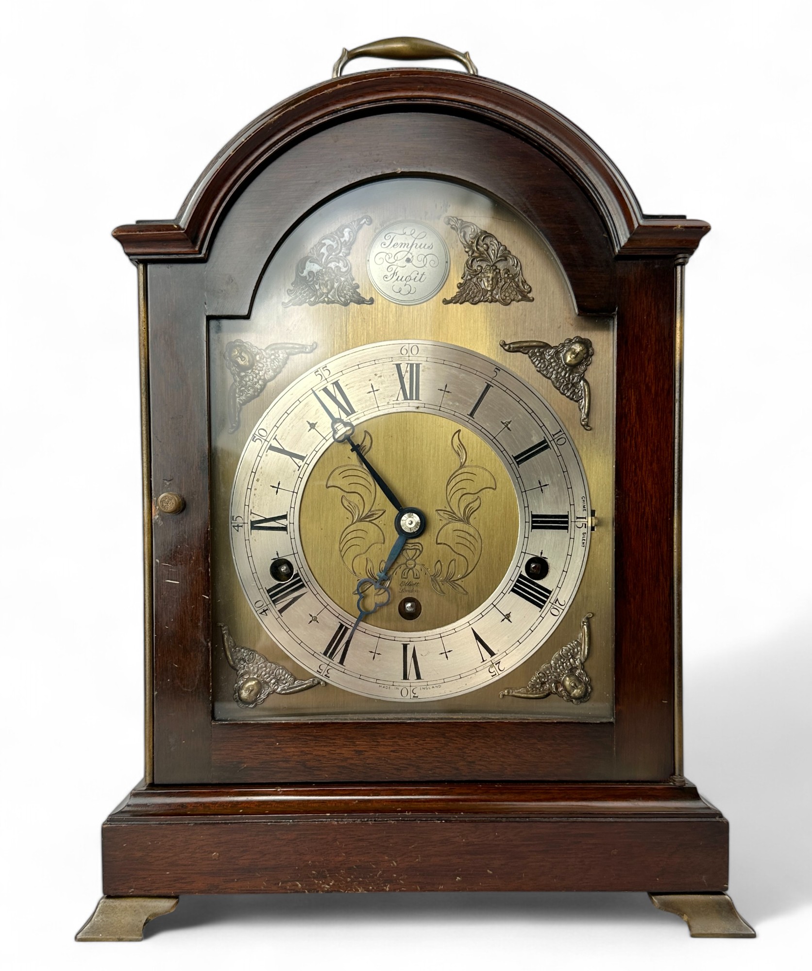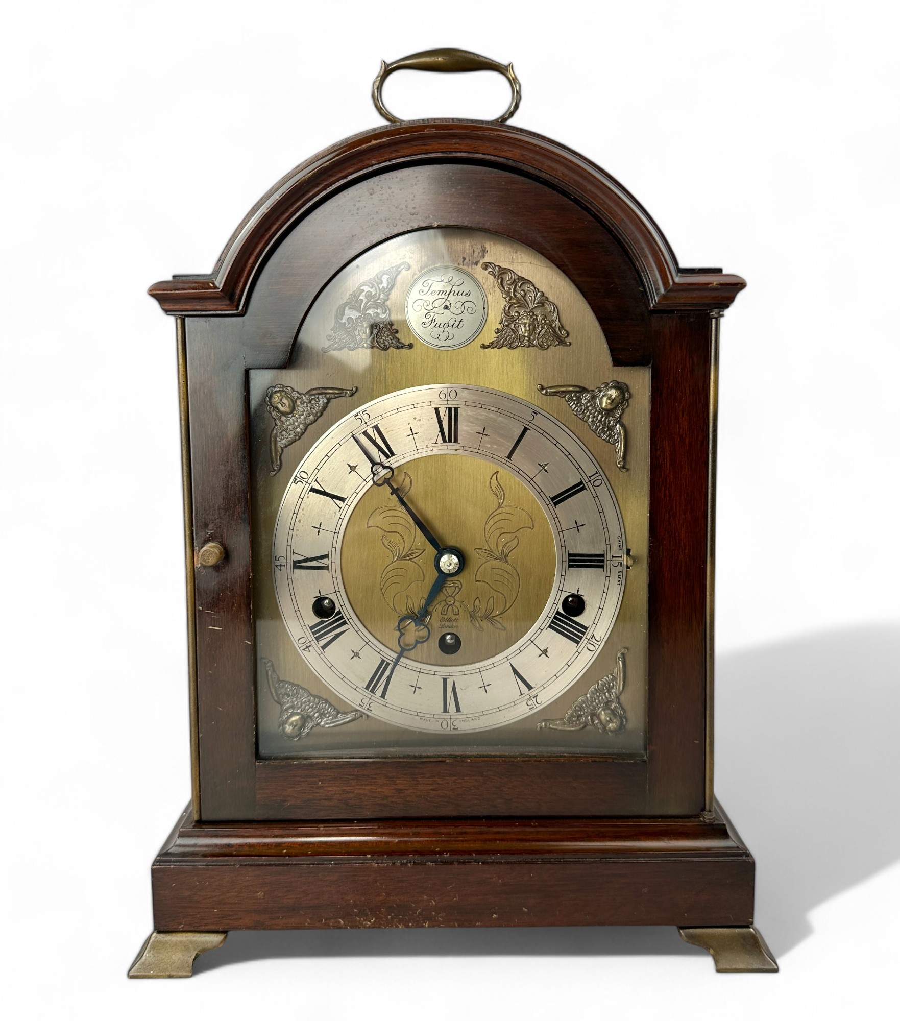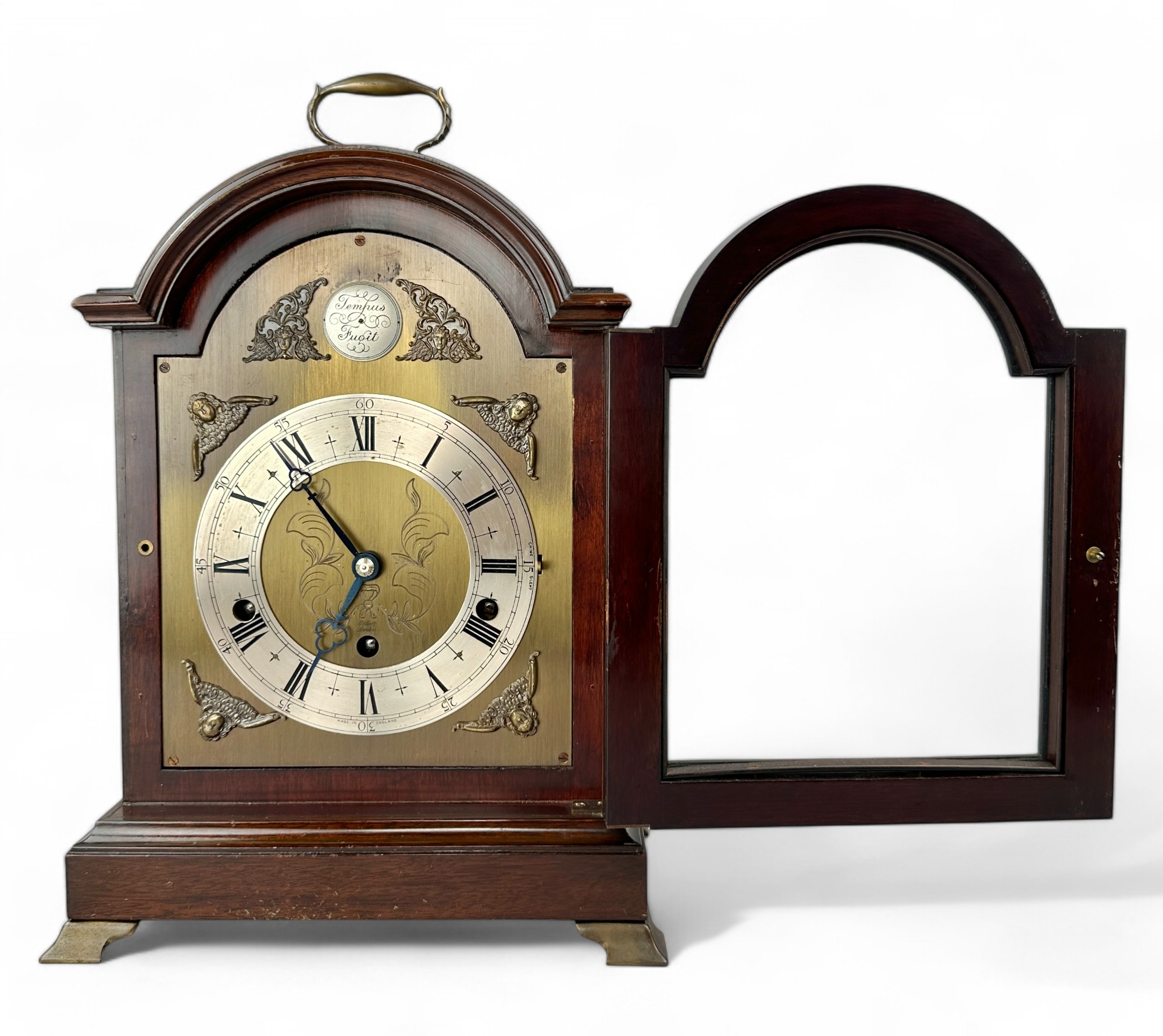 Elliot London mahogany "Tempus Fugit" bracket clock, 18th C. style with brass face, 4-rod brass works stamped F.W. Elliot Ltd., Croydon, England, Jewels Adjusted", case with domed top with fixed brass handle.
