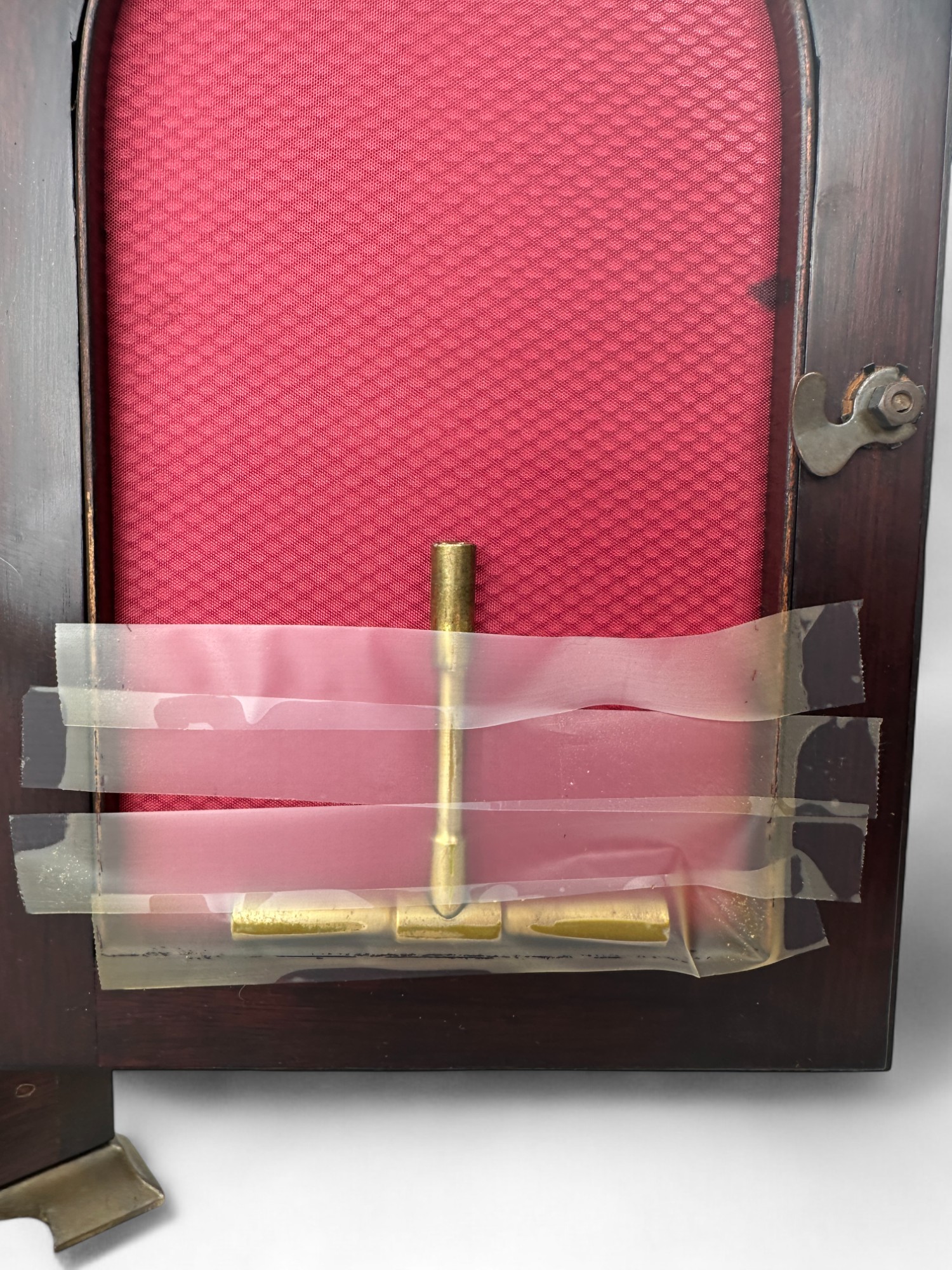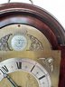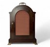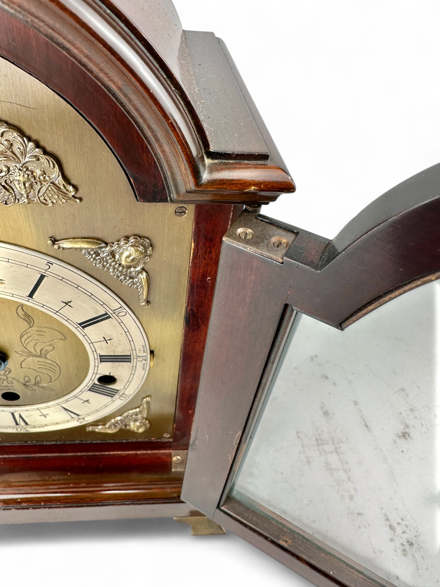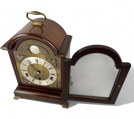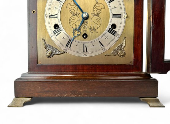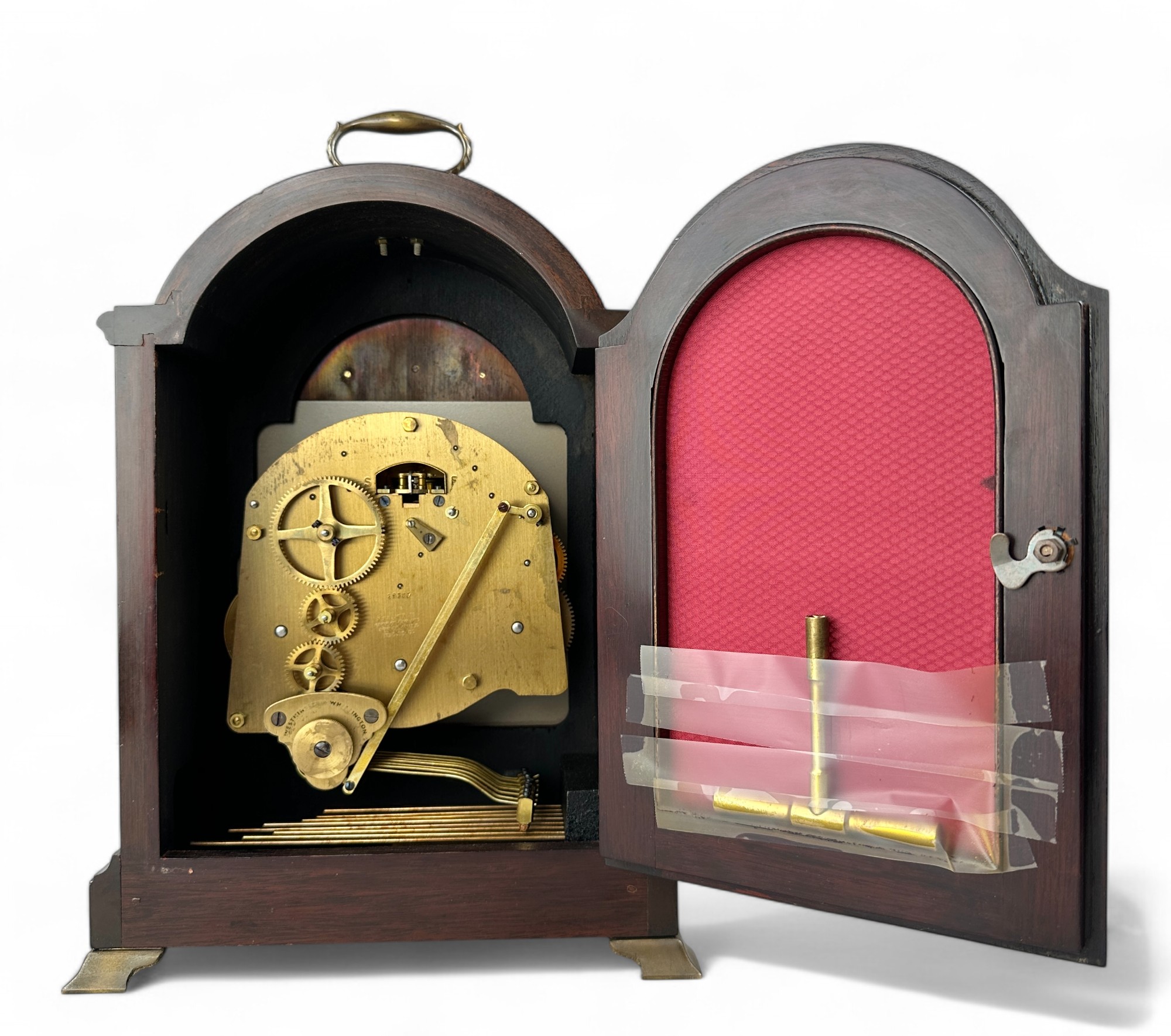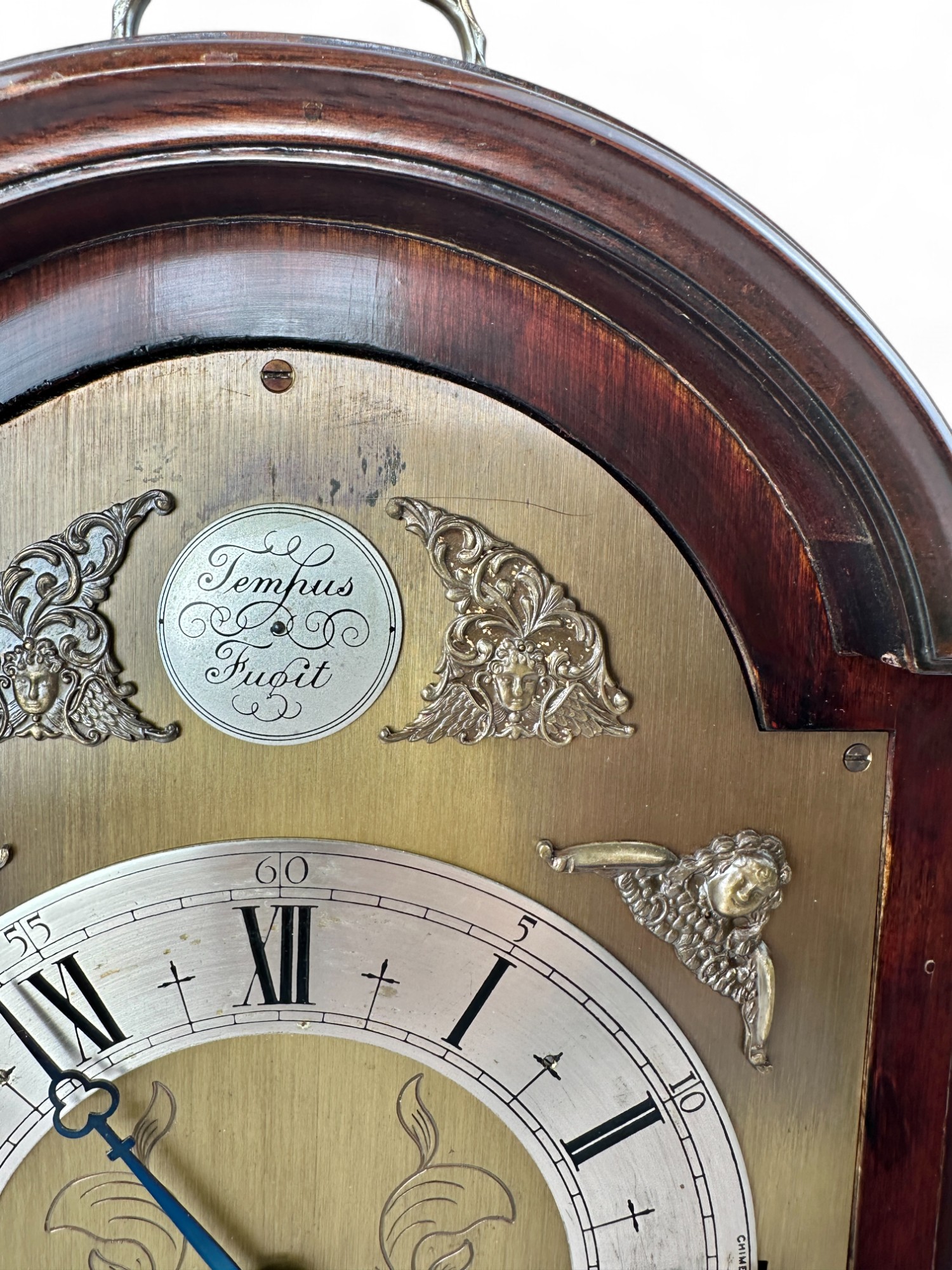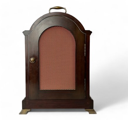 Elliot London mahogany "Tempus Fugit" bracket clock, 18th C. style with brass face, 4-rod brass works stamped F.W. Elliot Ltd., Croydon, England, Jewels Adjusted", case with domed top with fixed brass handle.