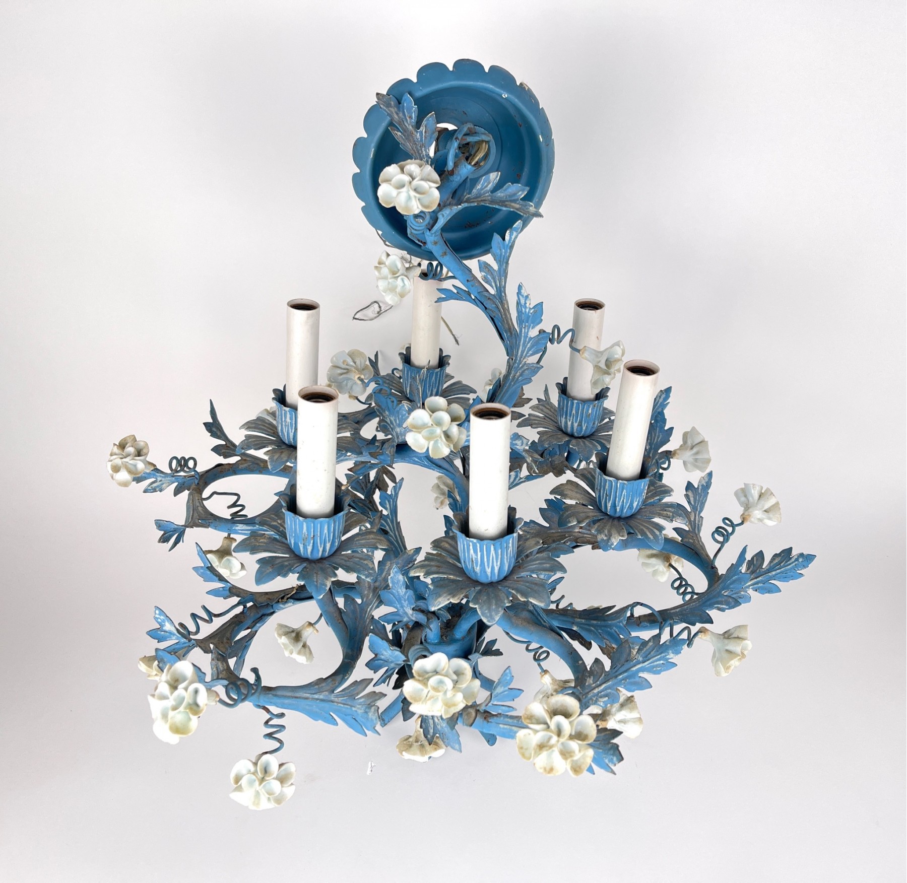 Belle Époque painted tole chandelier from 19th century with six candle lights and petite flowers. Created in France features blue foliage and delicate white flowers.