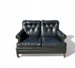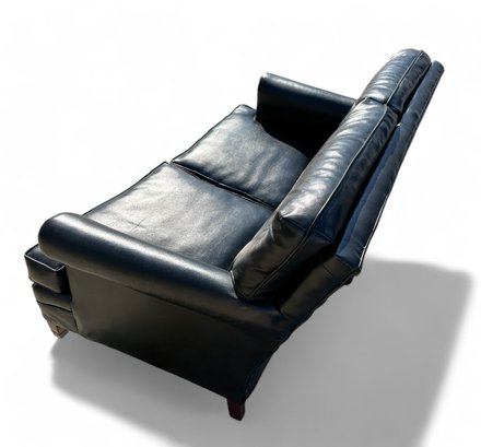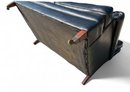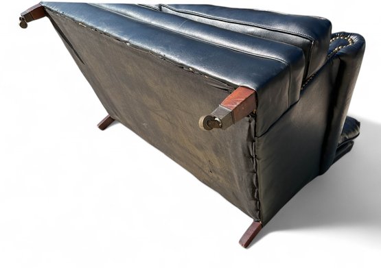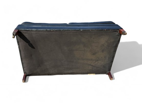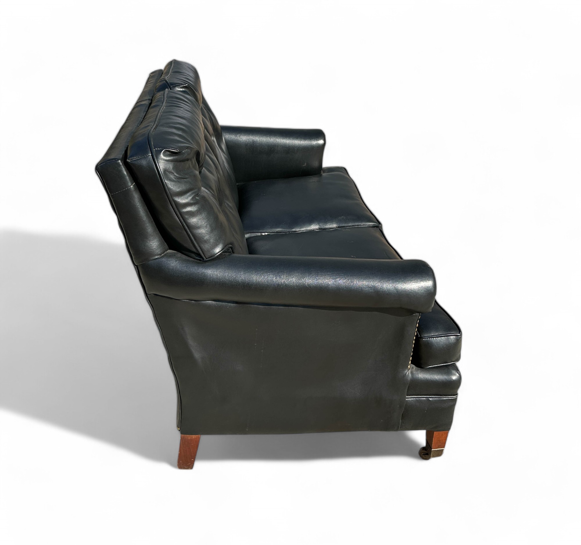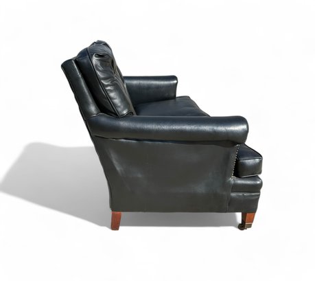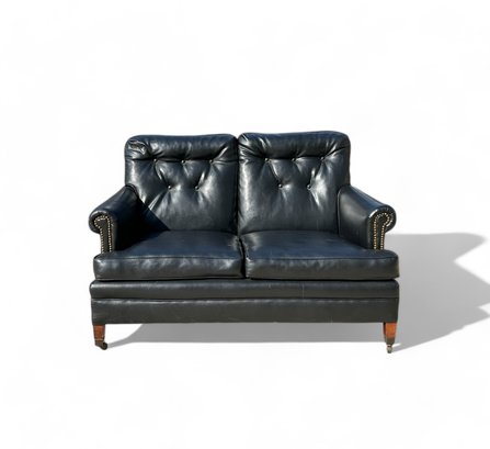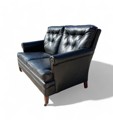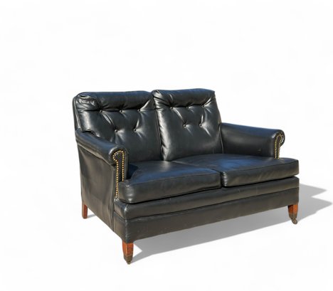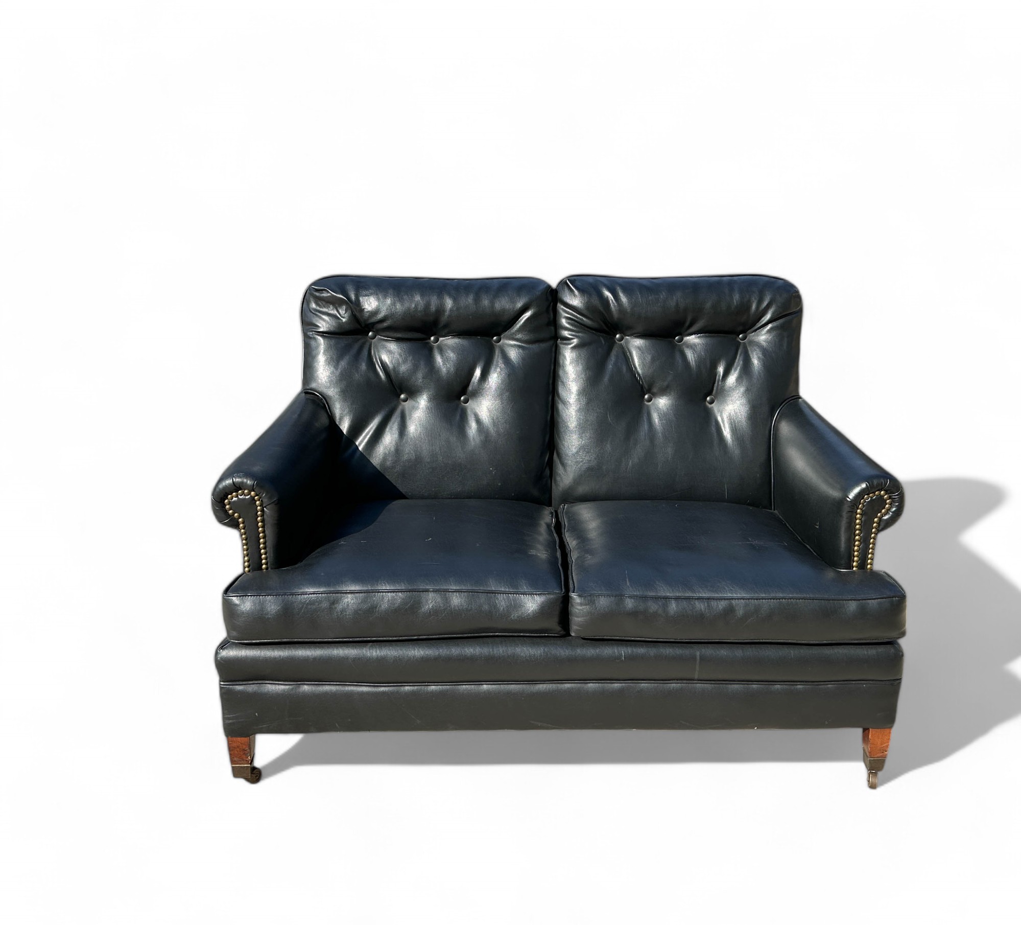 In very good condition, black leather two seater sofa or loveseat with brass nailhead detail and solid wood legs with castors on front.