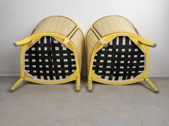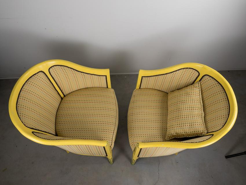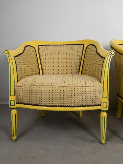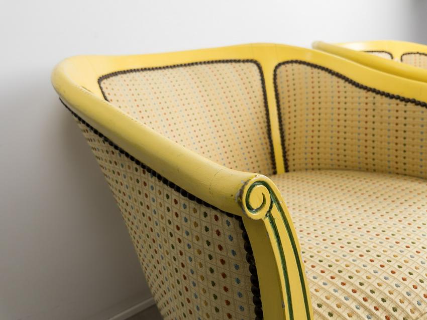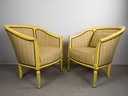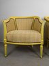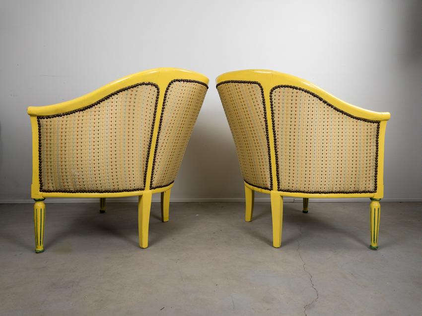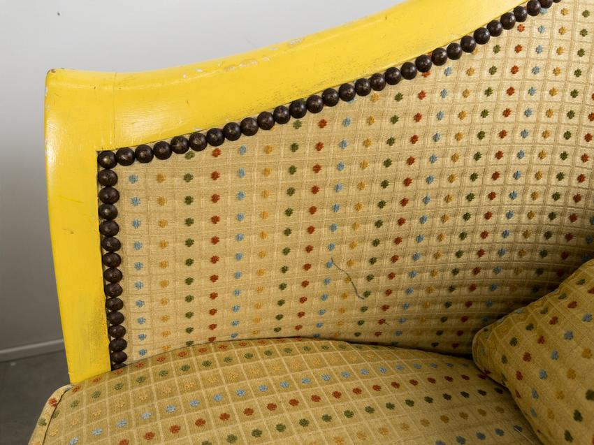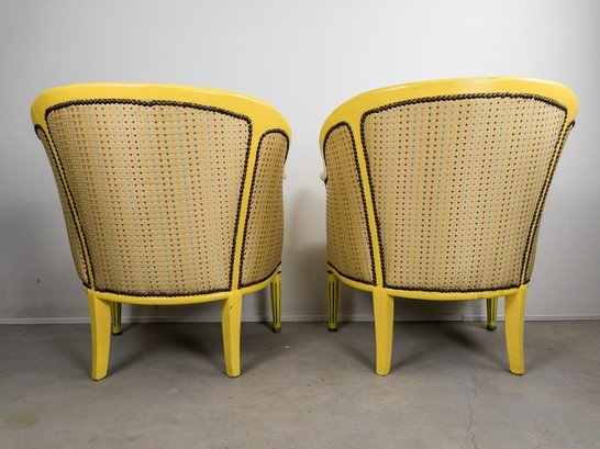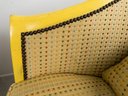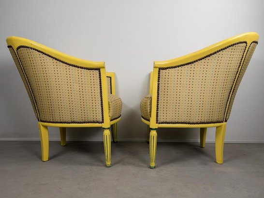 Pair of Antique refinished and reupholstered Bergere Arm Chairs. Set in soft yellow woven silk, patterned with 5 colors of dots. Nail heads meet the painted in yellow and green frame. Cushions are attached. Frames are in excellent sturdy condition. some paint chaipping throughout. Nailhead patina is aged brass. Eeach chair measures 27 W x 23 1/2" D. Overall Height 30 1/2", Seat Height 16".