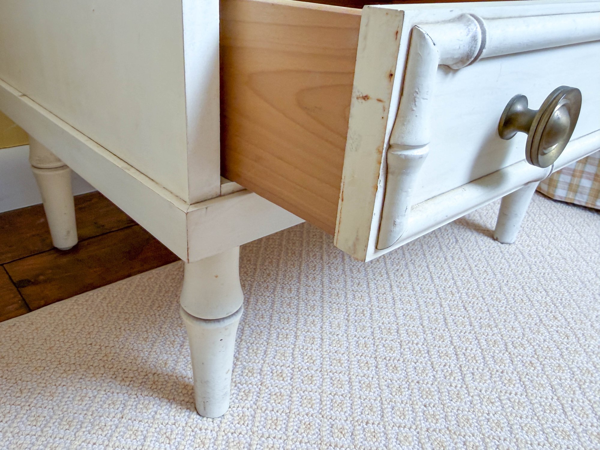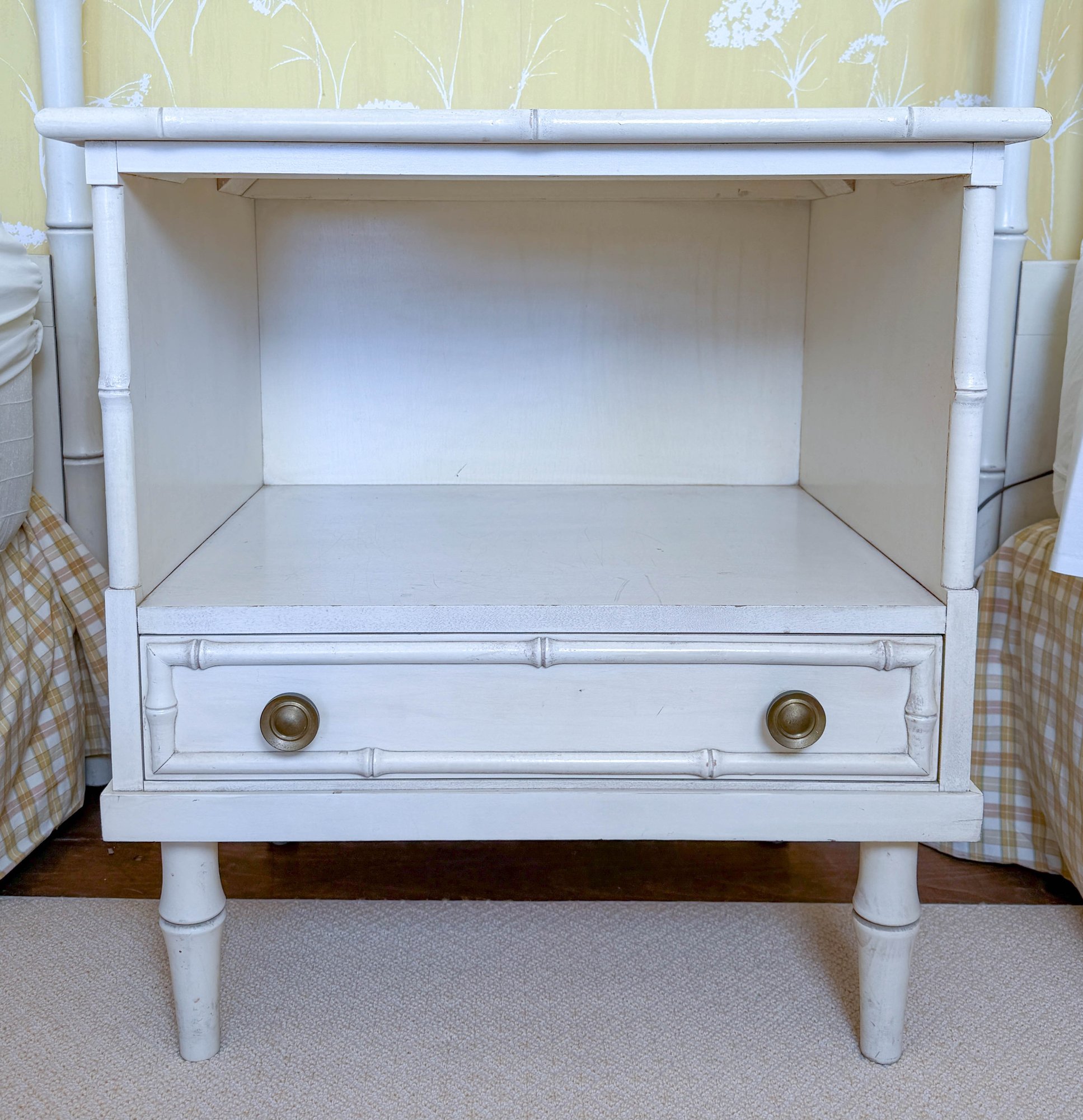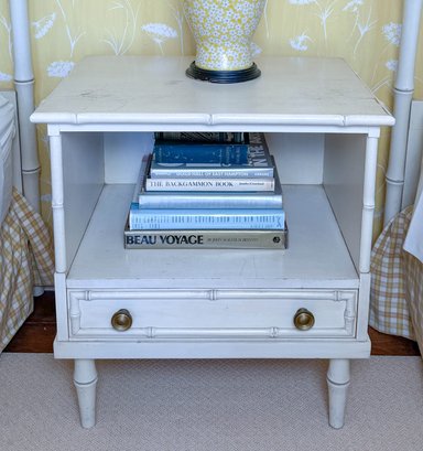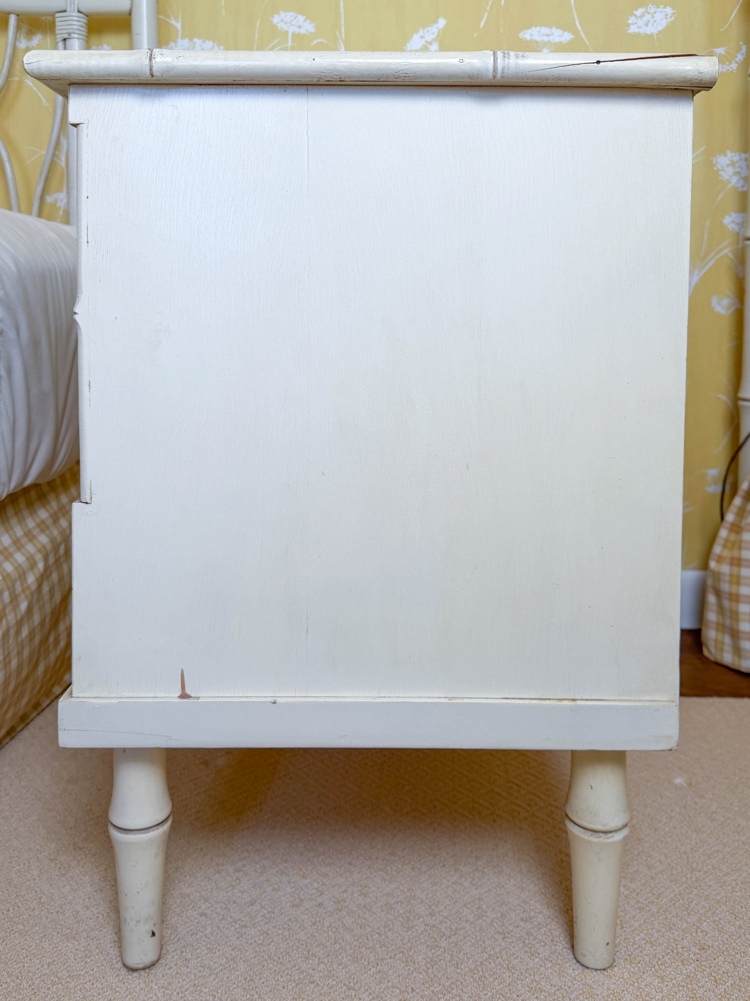 Mid century Thomasville Allegra colleciton single drawer nightstand. Made of wood with a matte dry brush finish in slightly off white