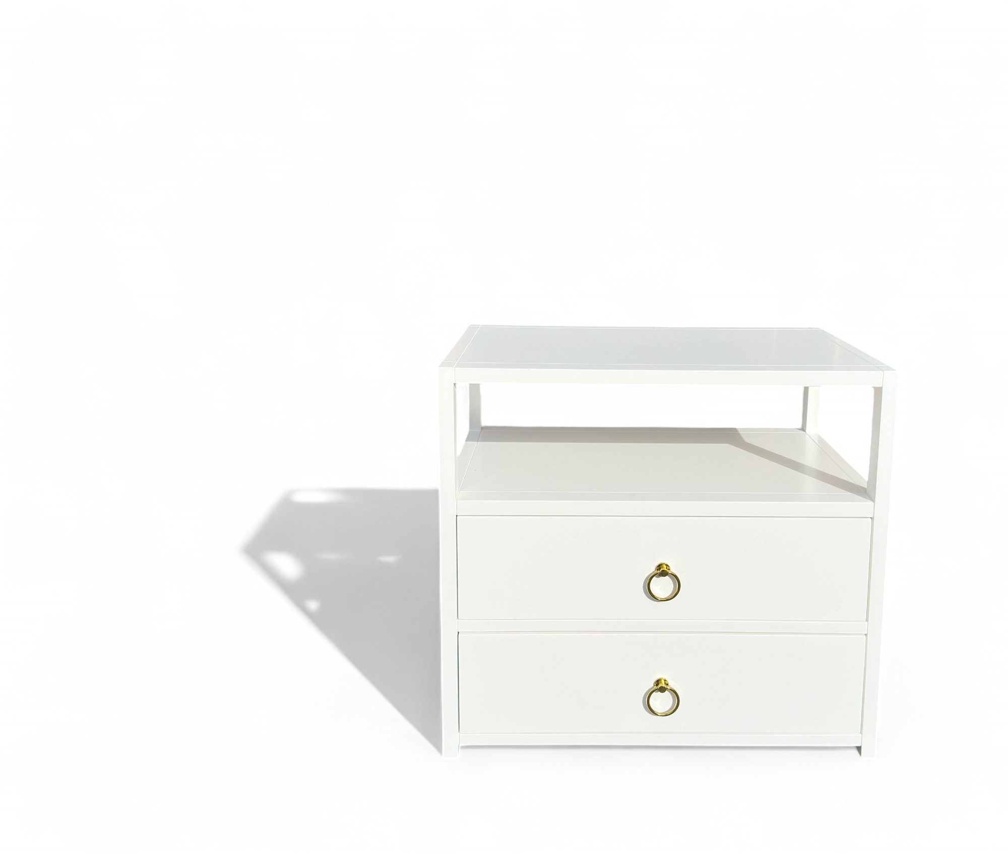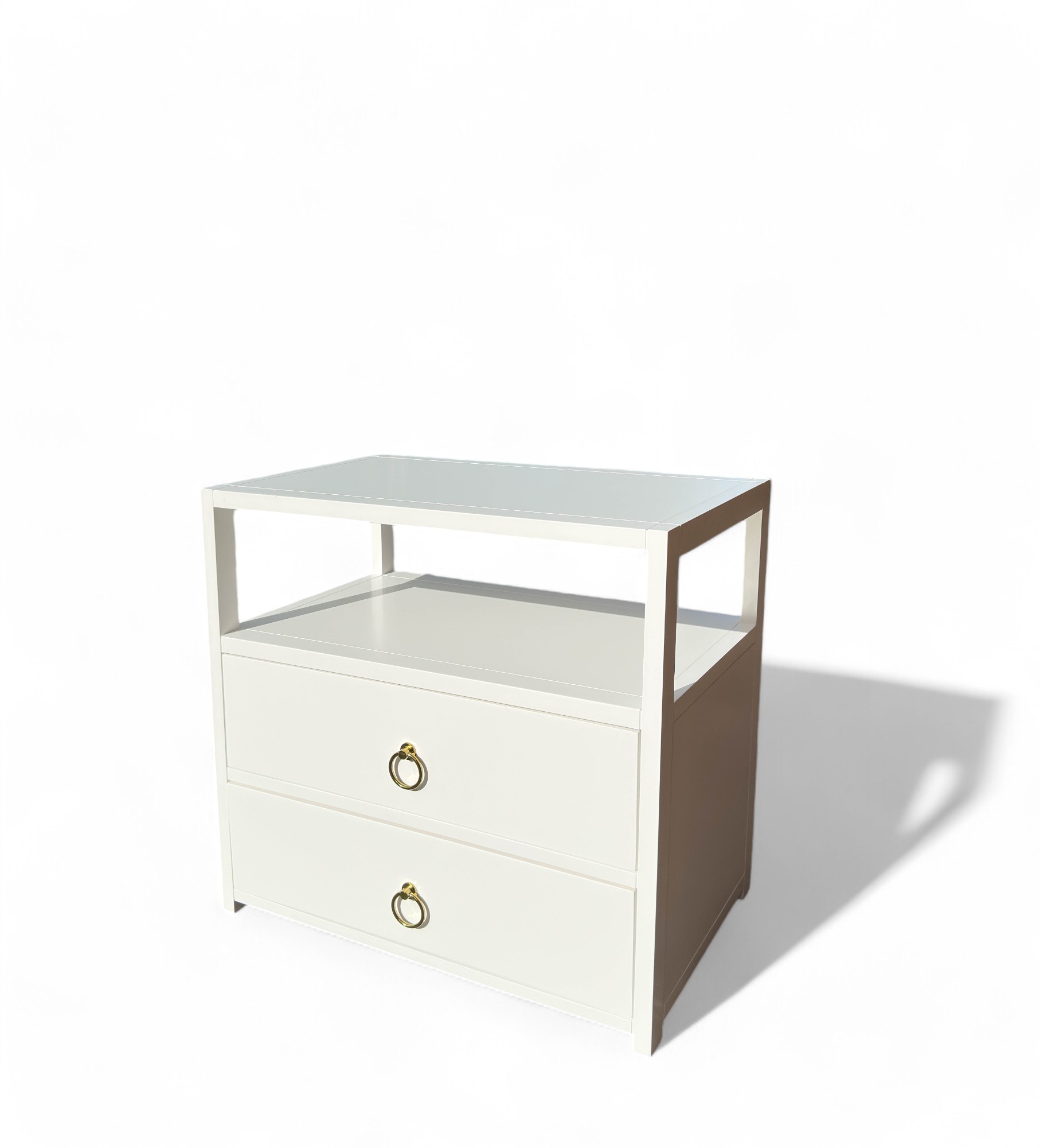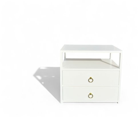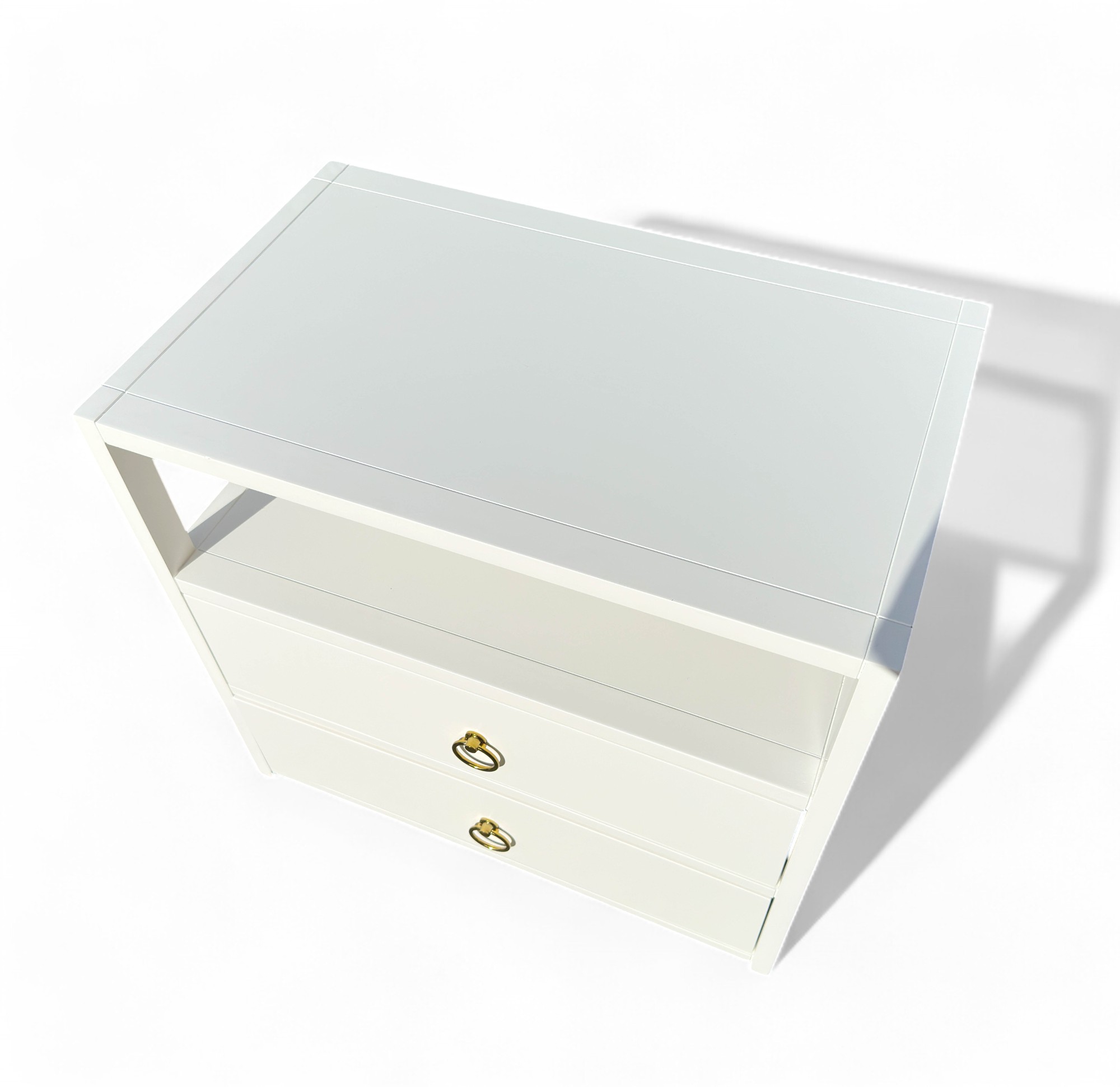 Butler Specialty furniture company hollywood regency style white lacquer side table or night stand with brass plated drawer pulls.