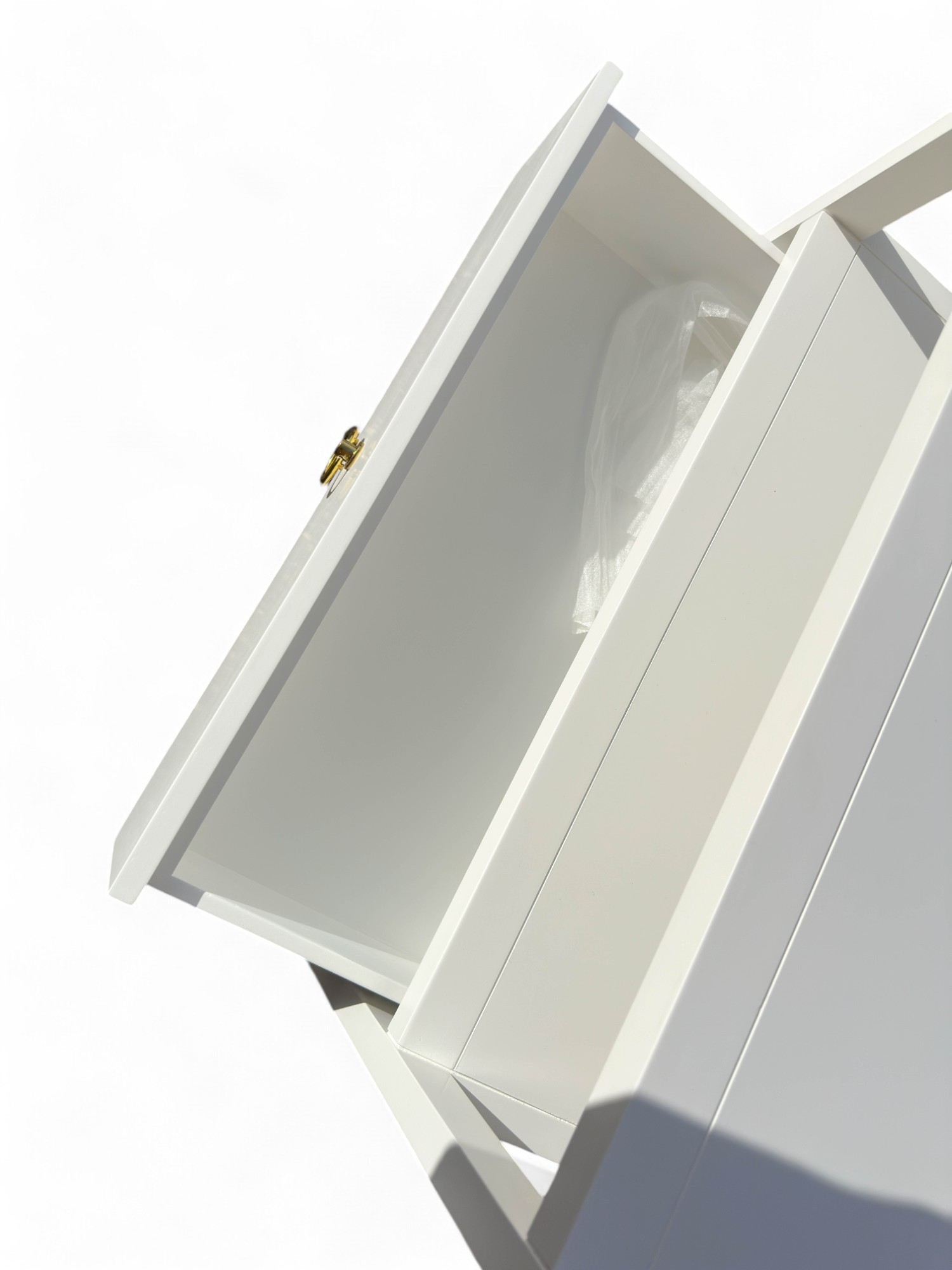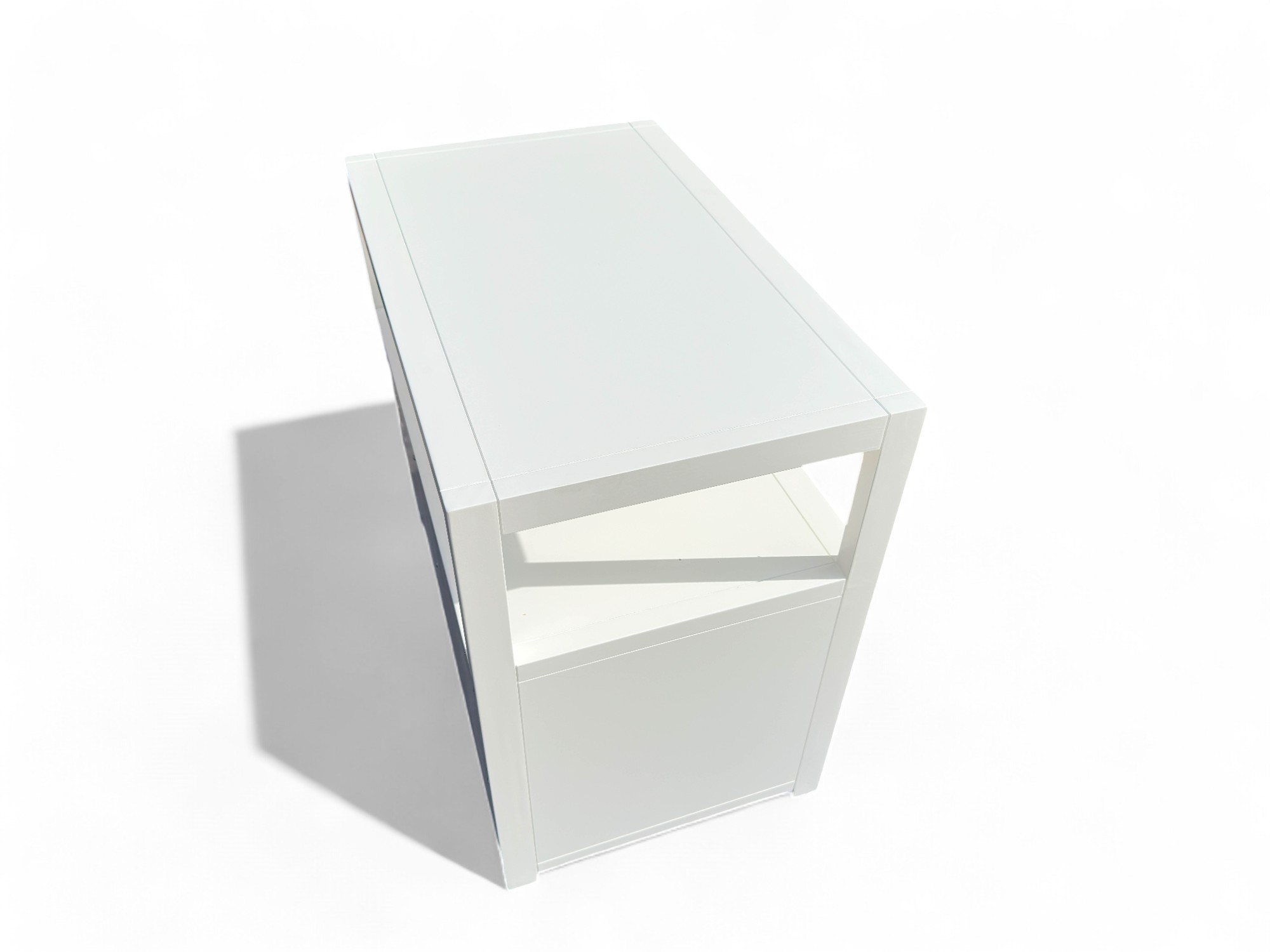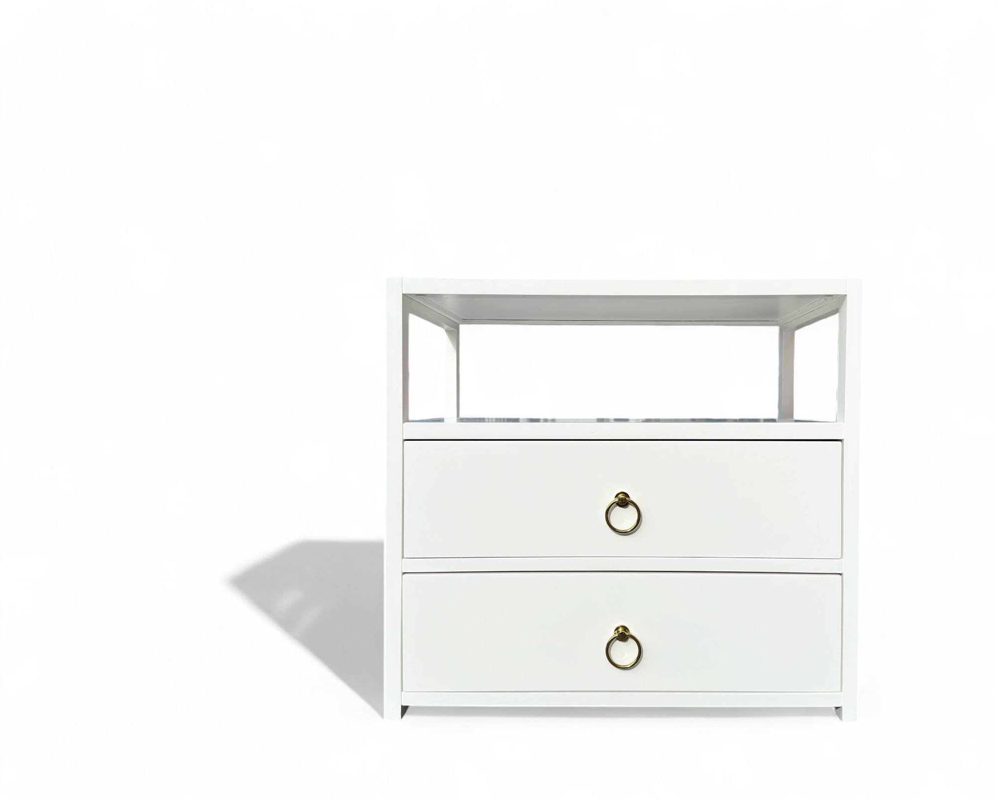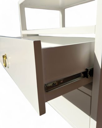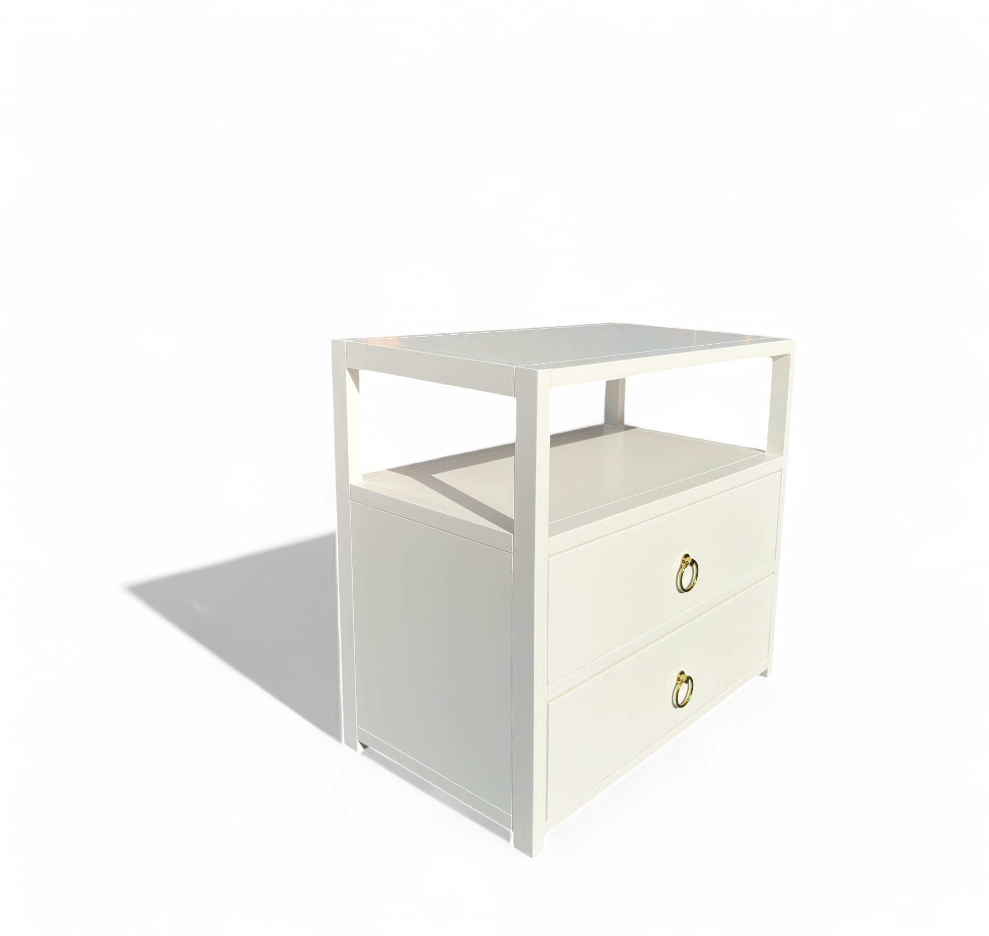 Butler Specialty furniture company hollywood regency style white lacquer side table or night stand with brass plated drawer pulls.