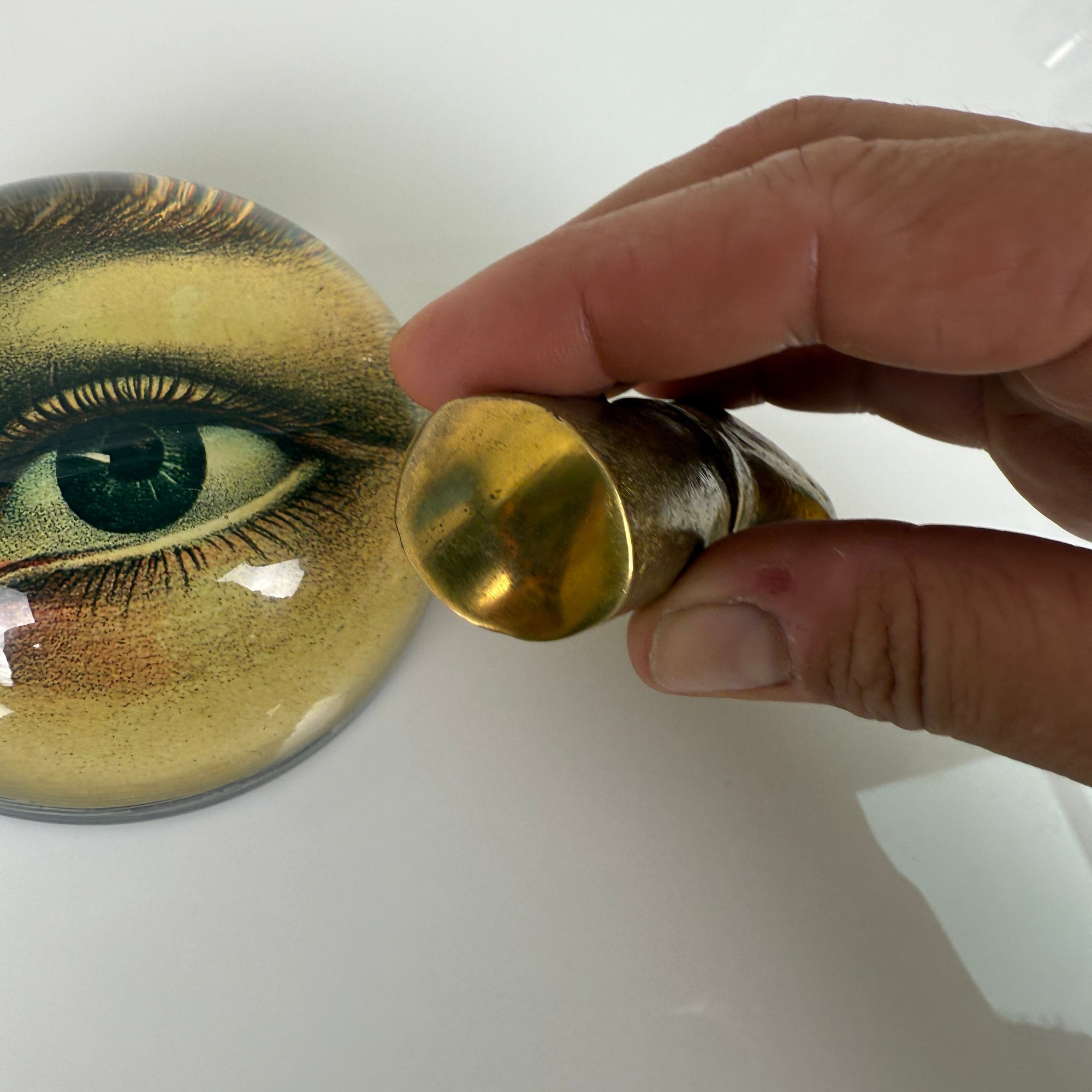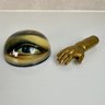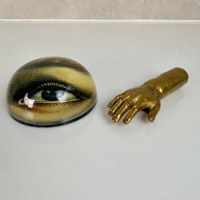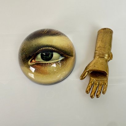John Derian 'Eye Left' Decopage Paperweight, Bronze Hand And Brass Inkwell