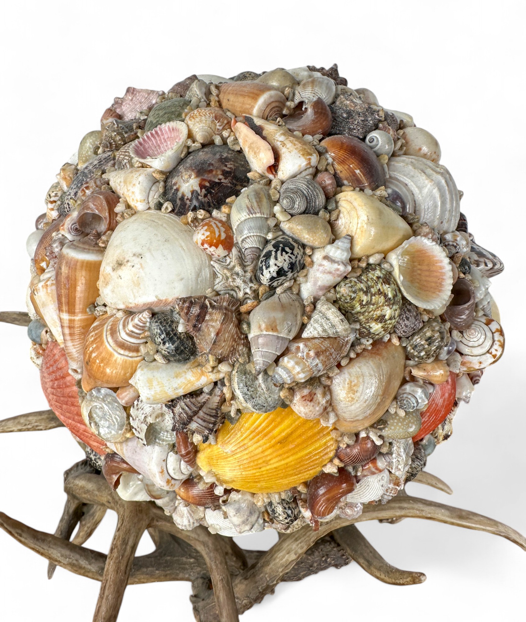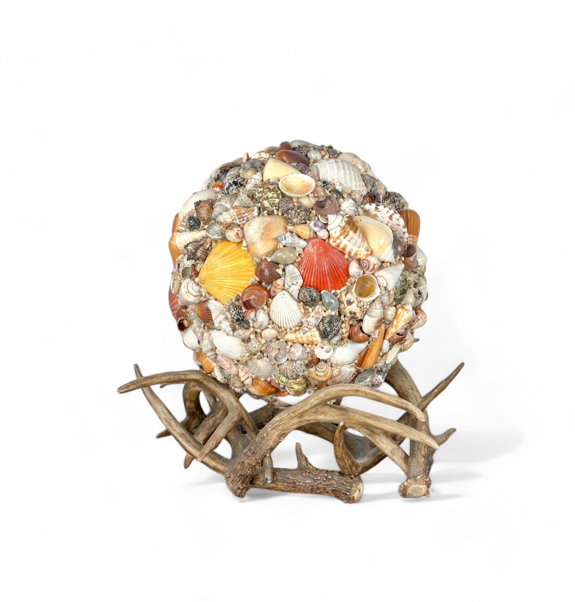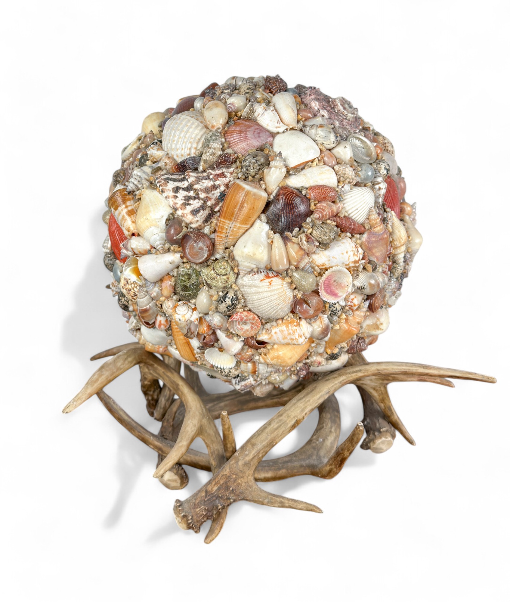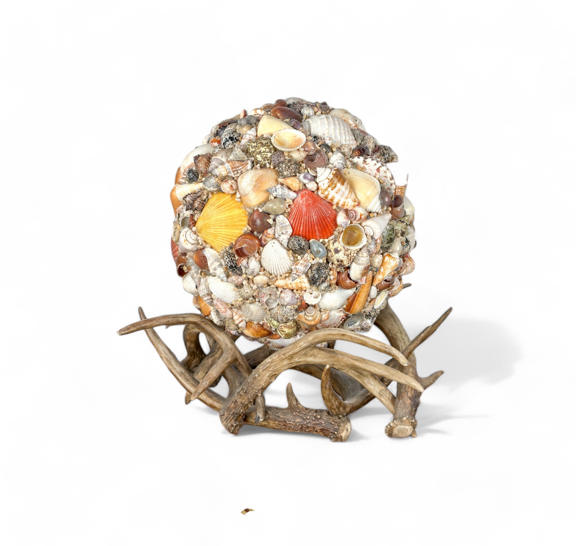Natural Sea shells on spherical orb resting on a crown of antlers.