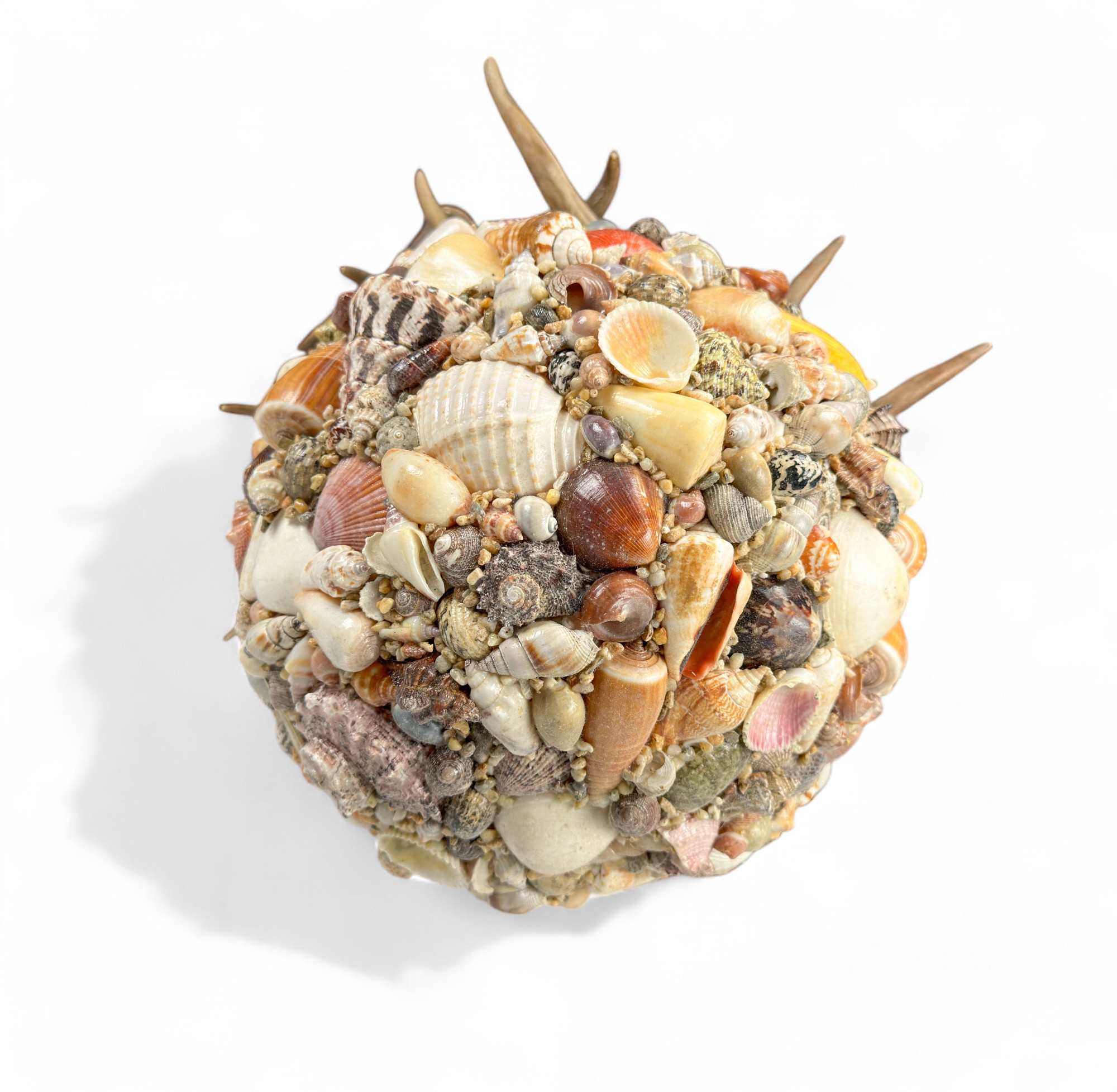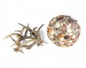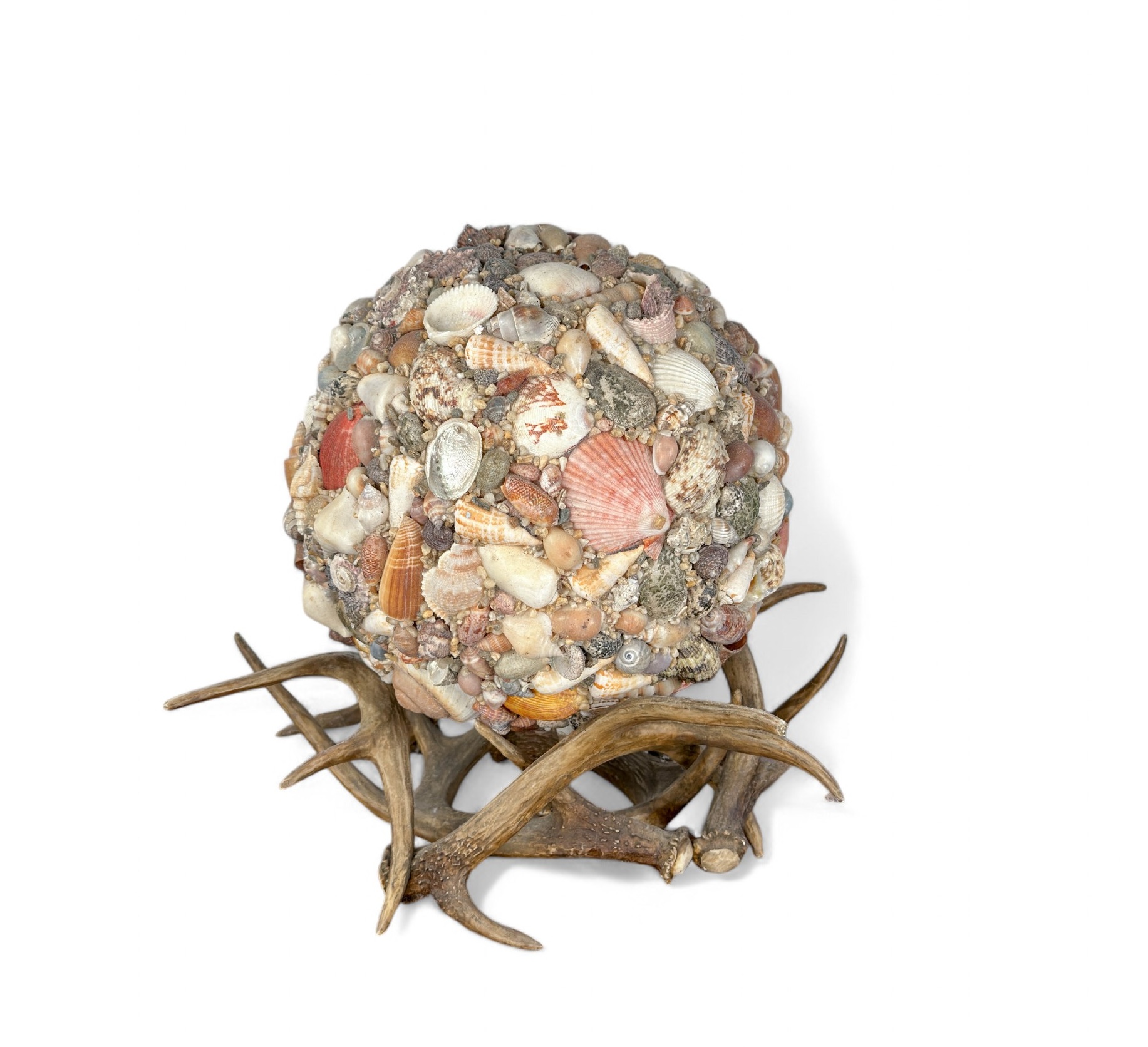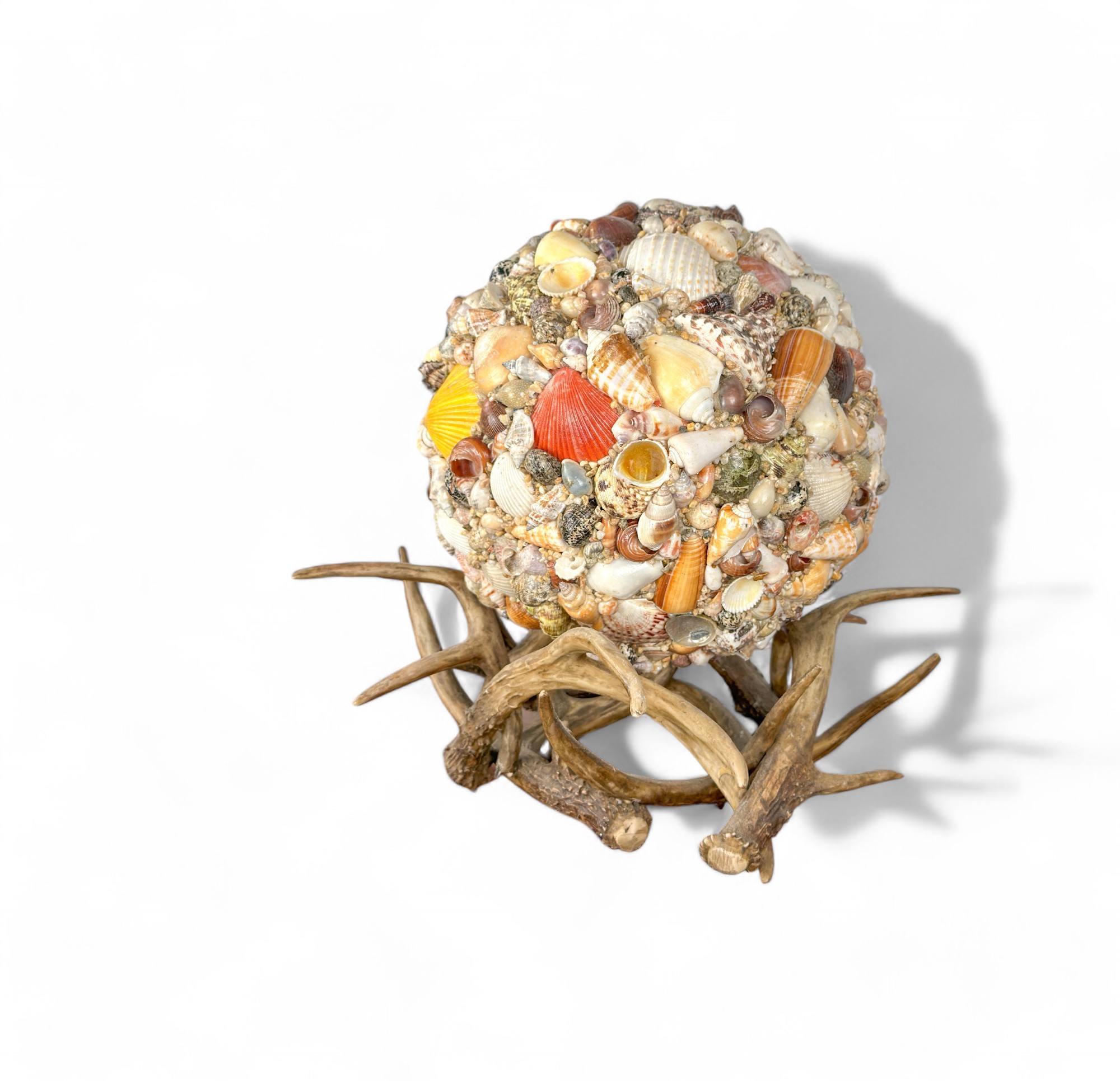 Natural Sea shells on spherical orb resting on a crown of antlers.