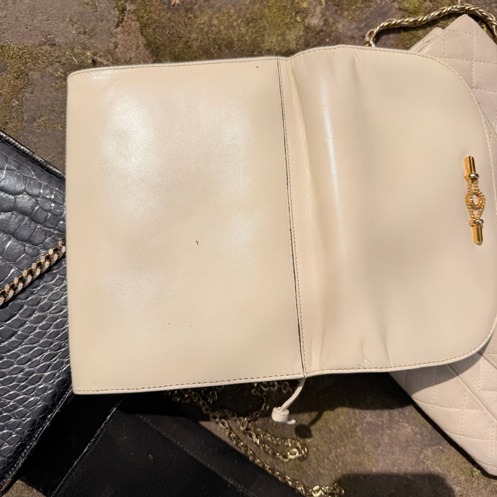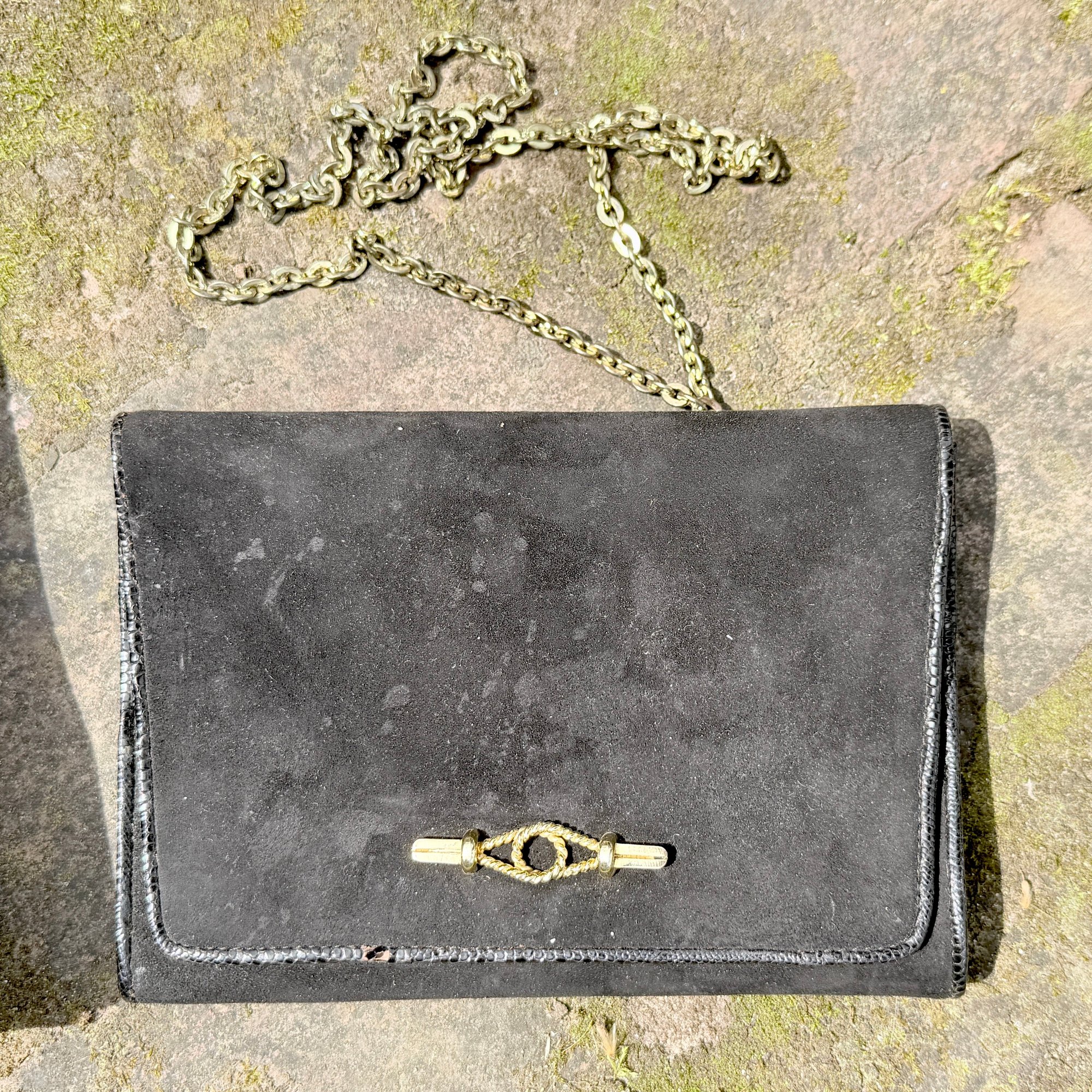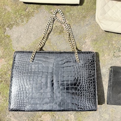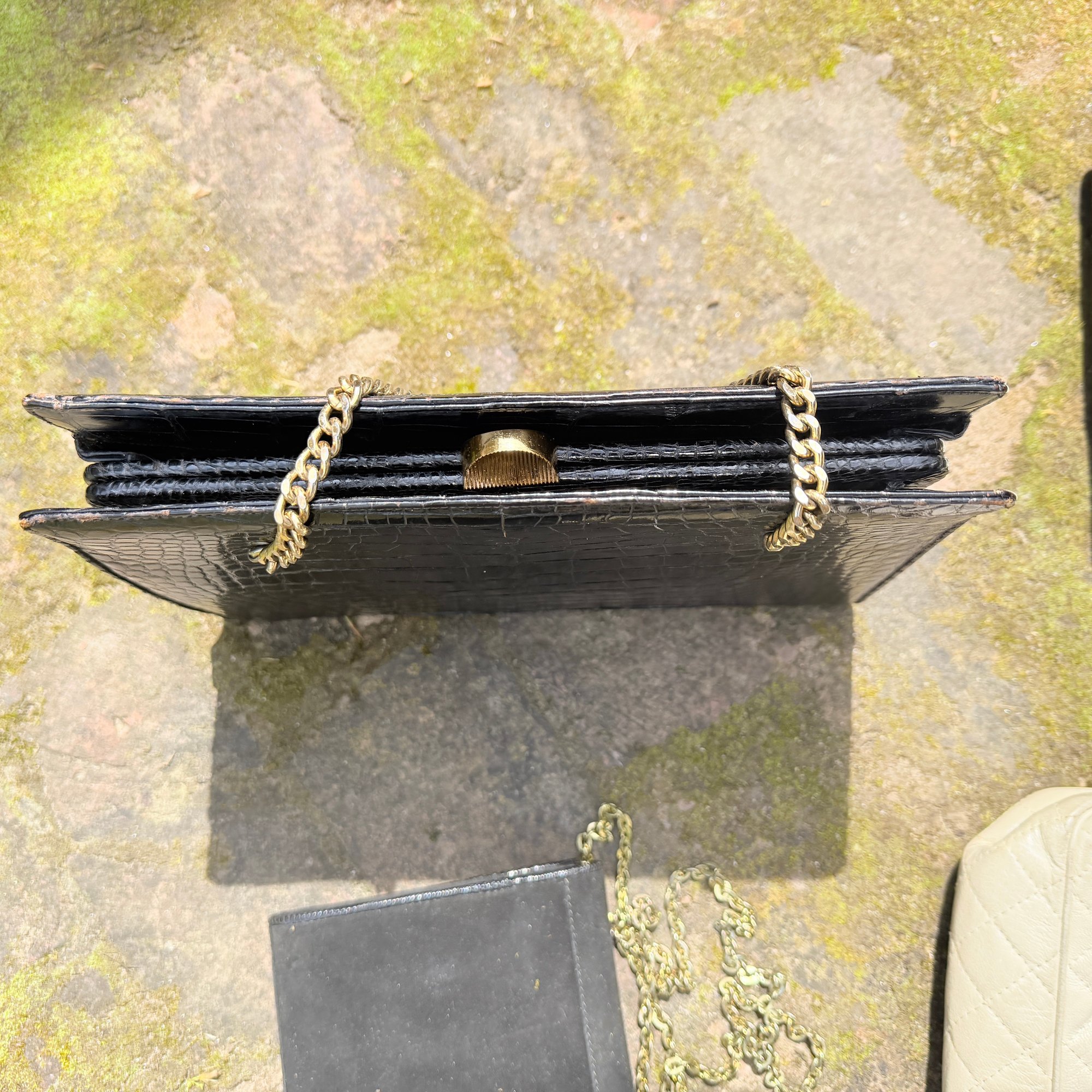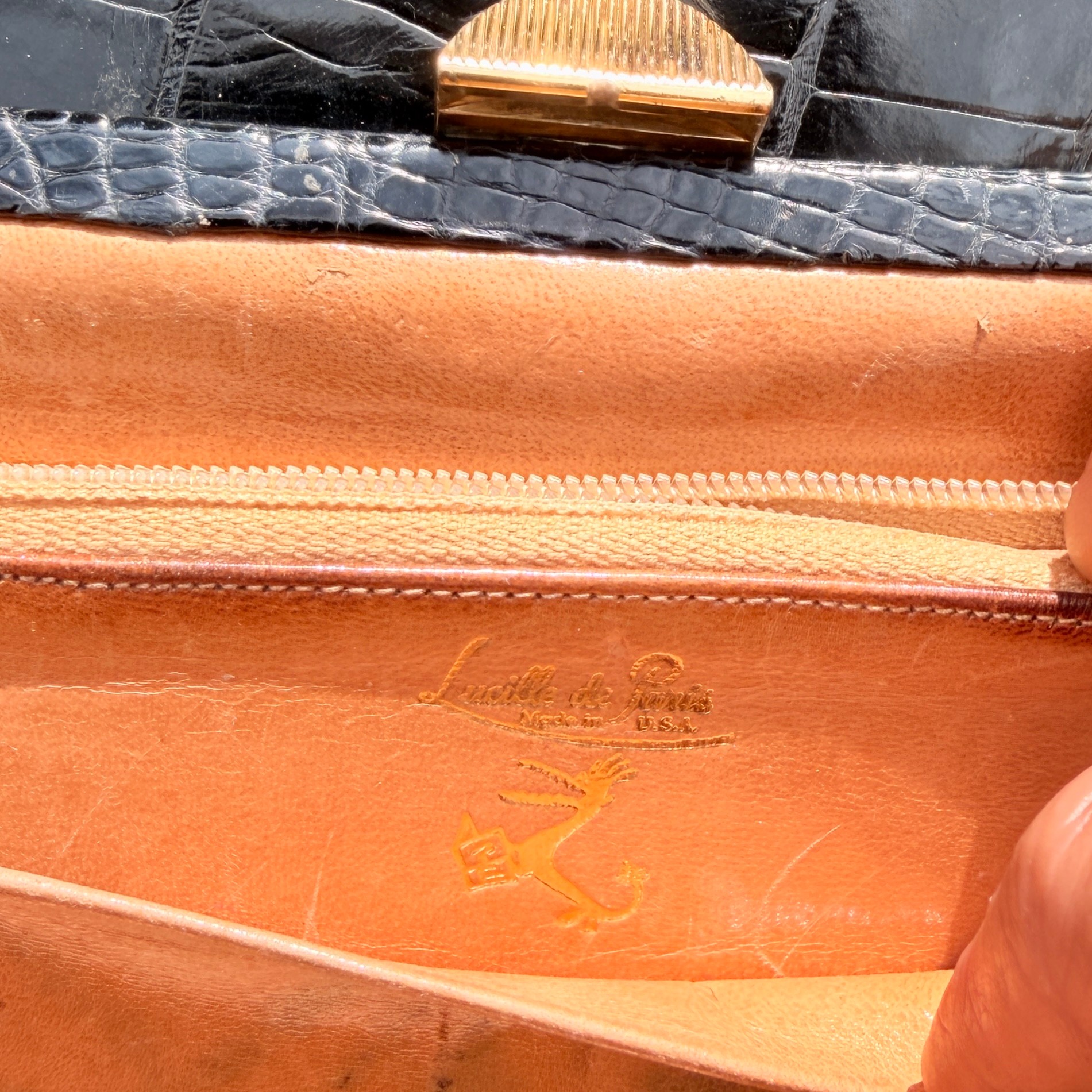 Black alligator hand bag with gold hardware by Lucille of Paris