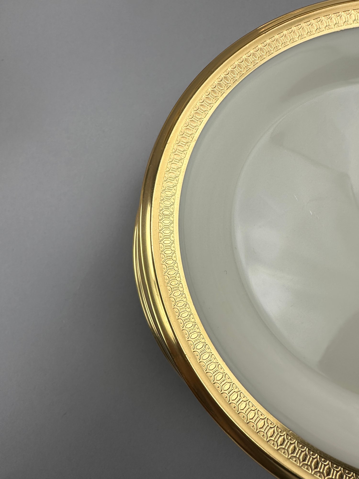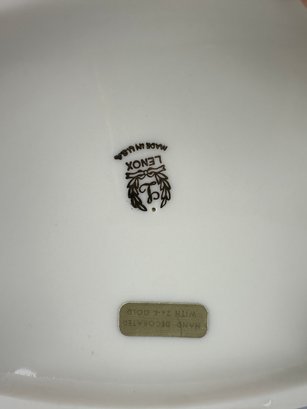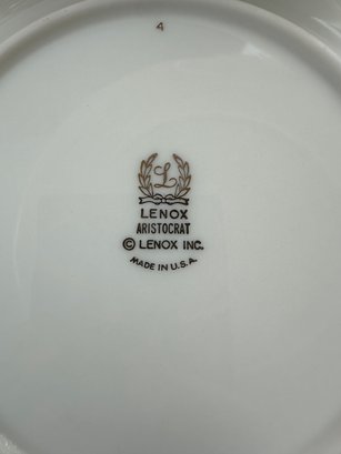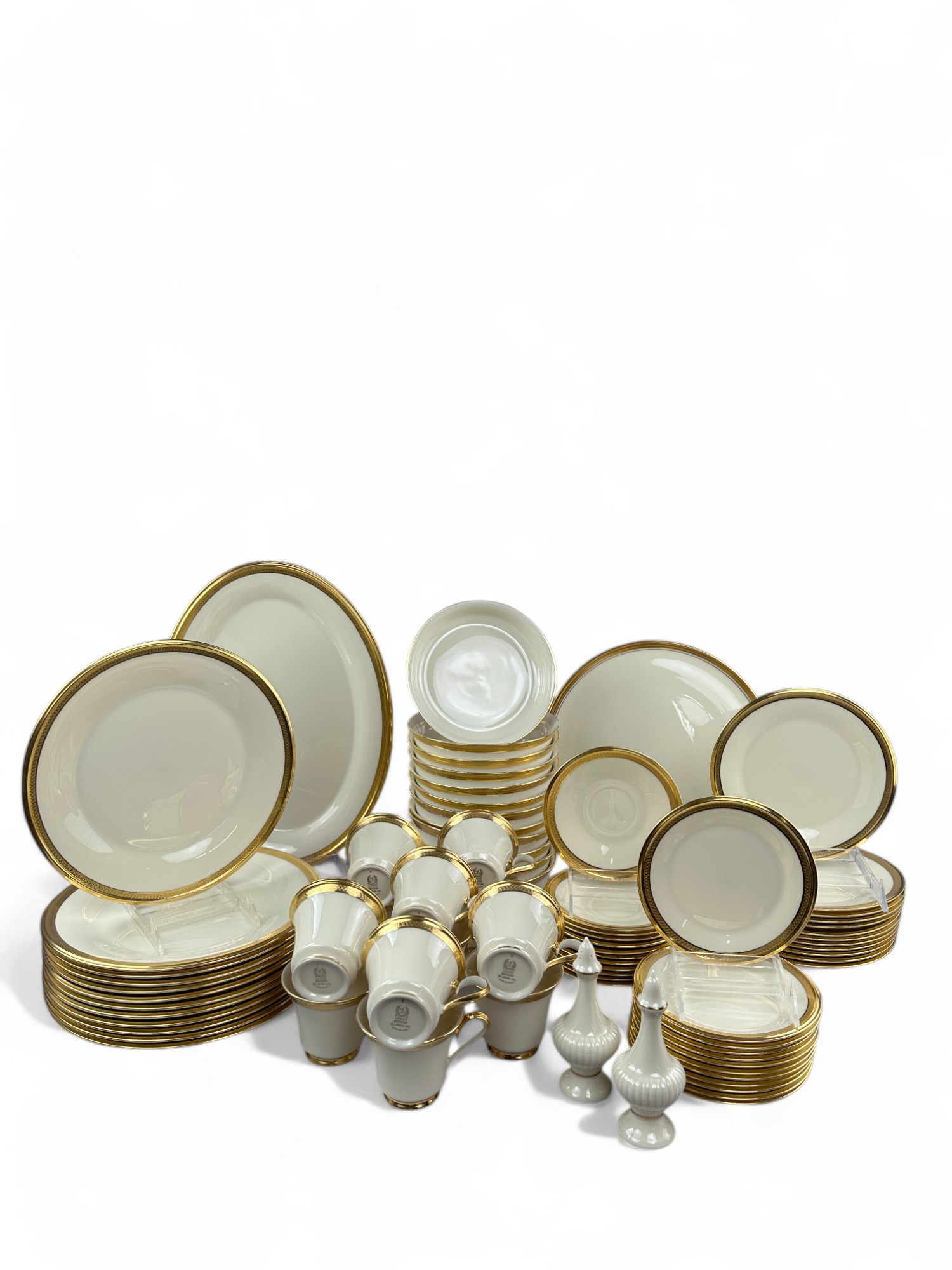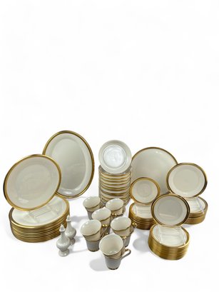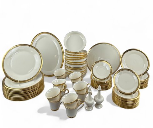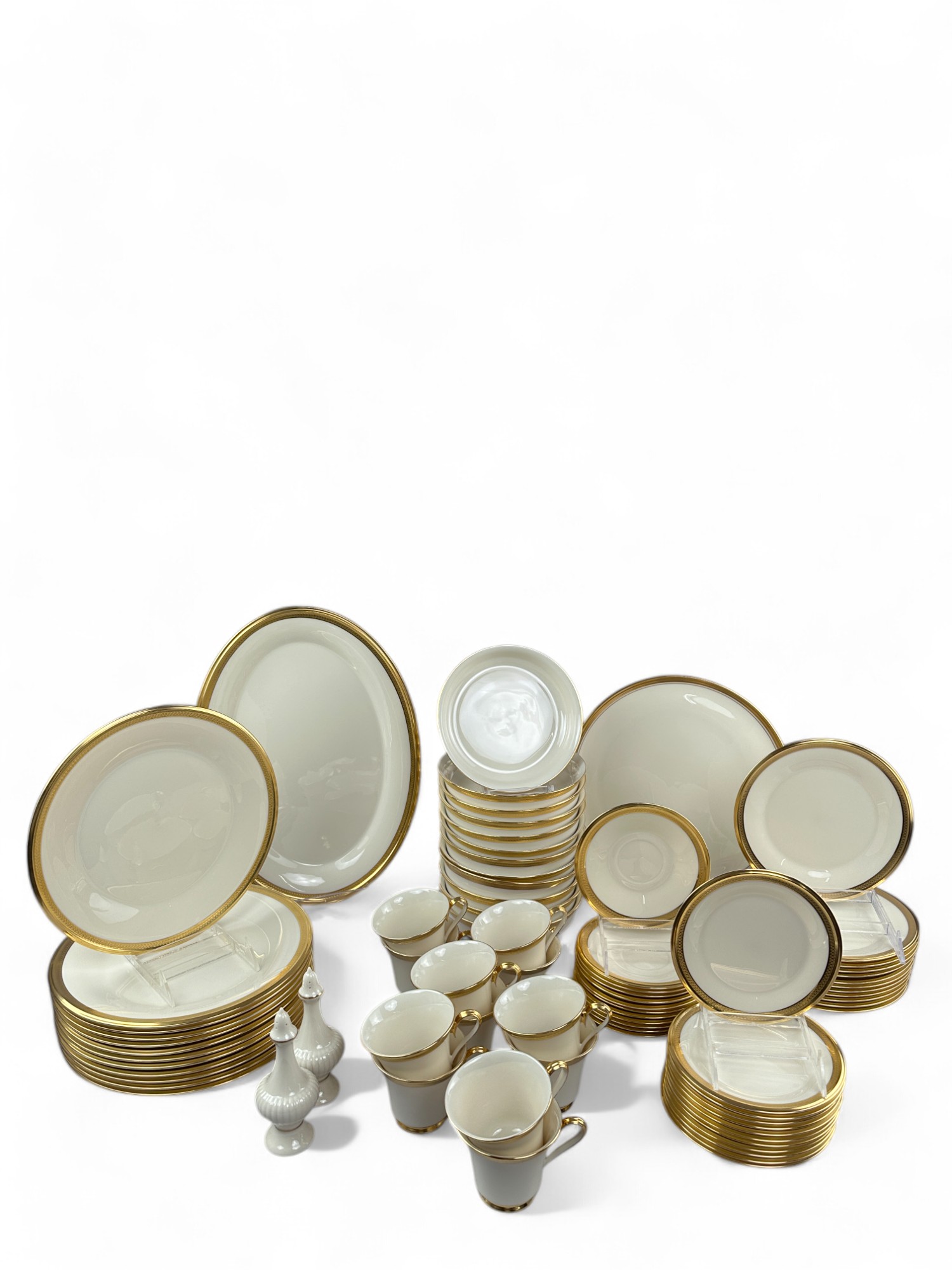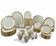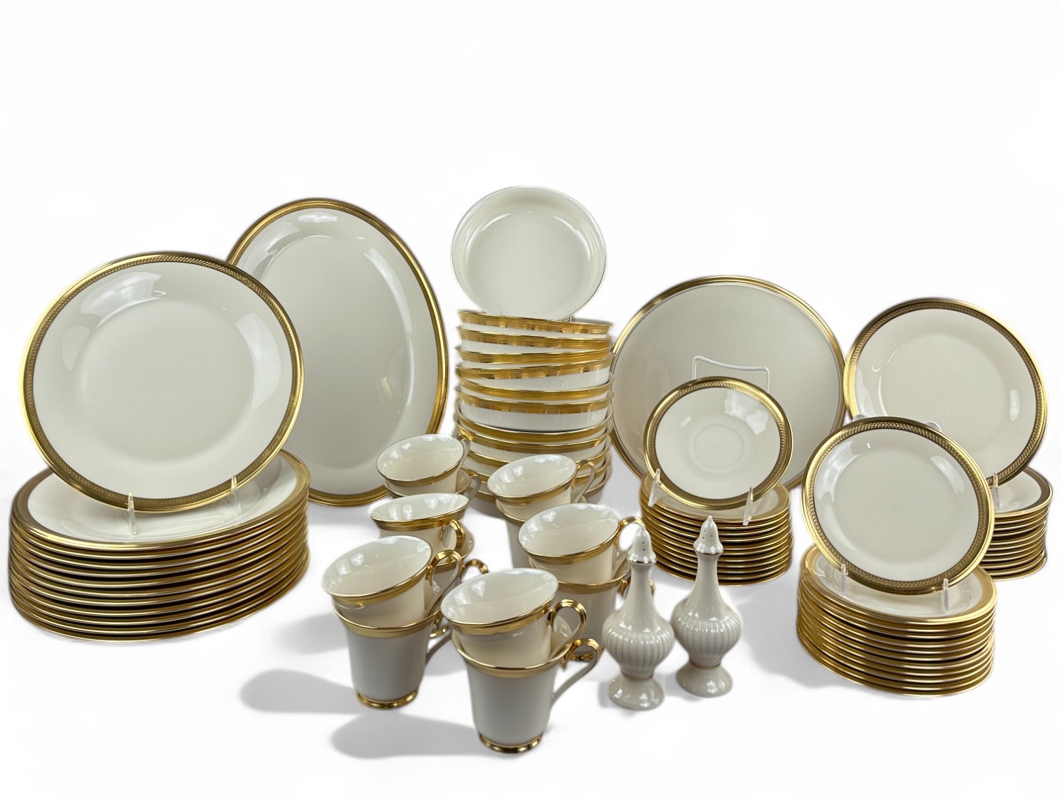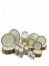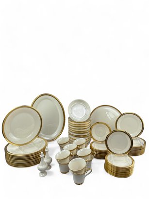 12 table Settings Plus three serving dishes, one with pedestal, and salt and pepper shakers.