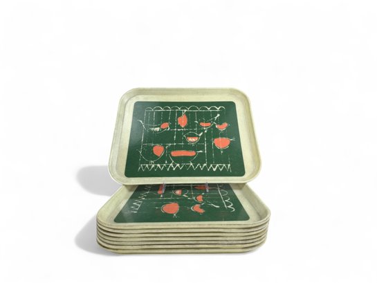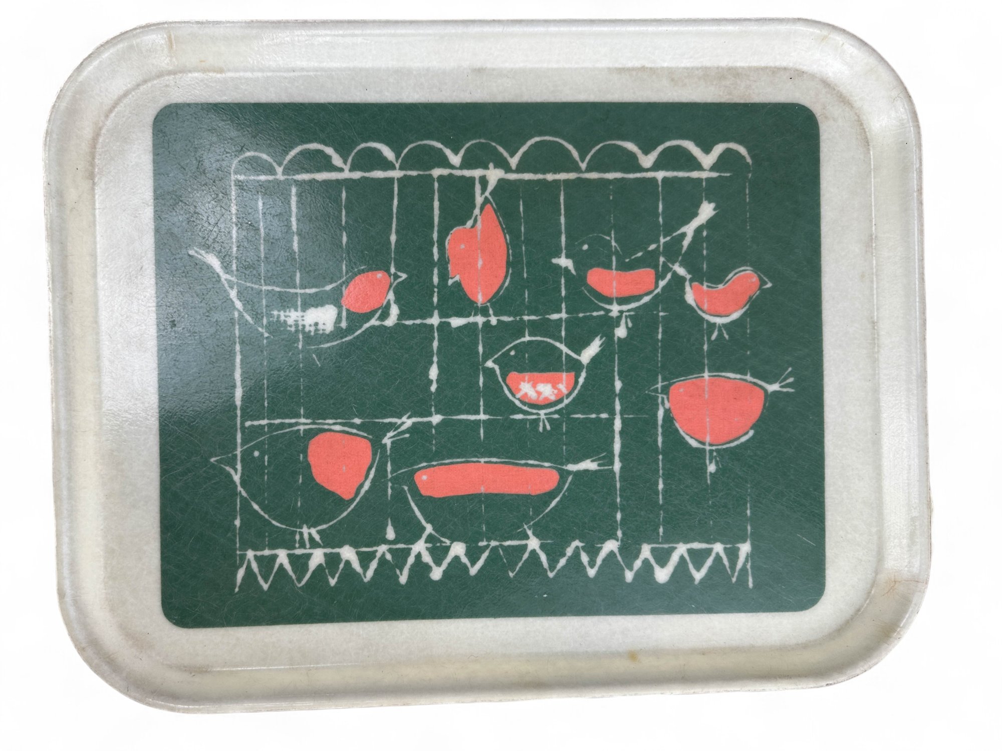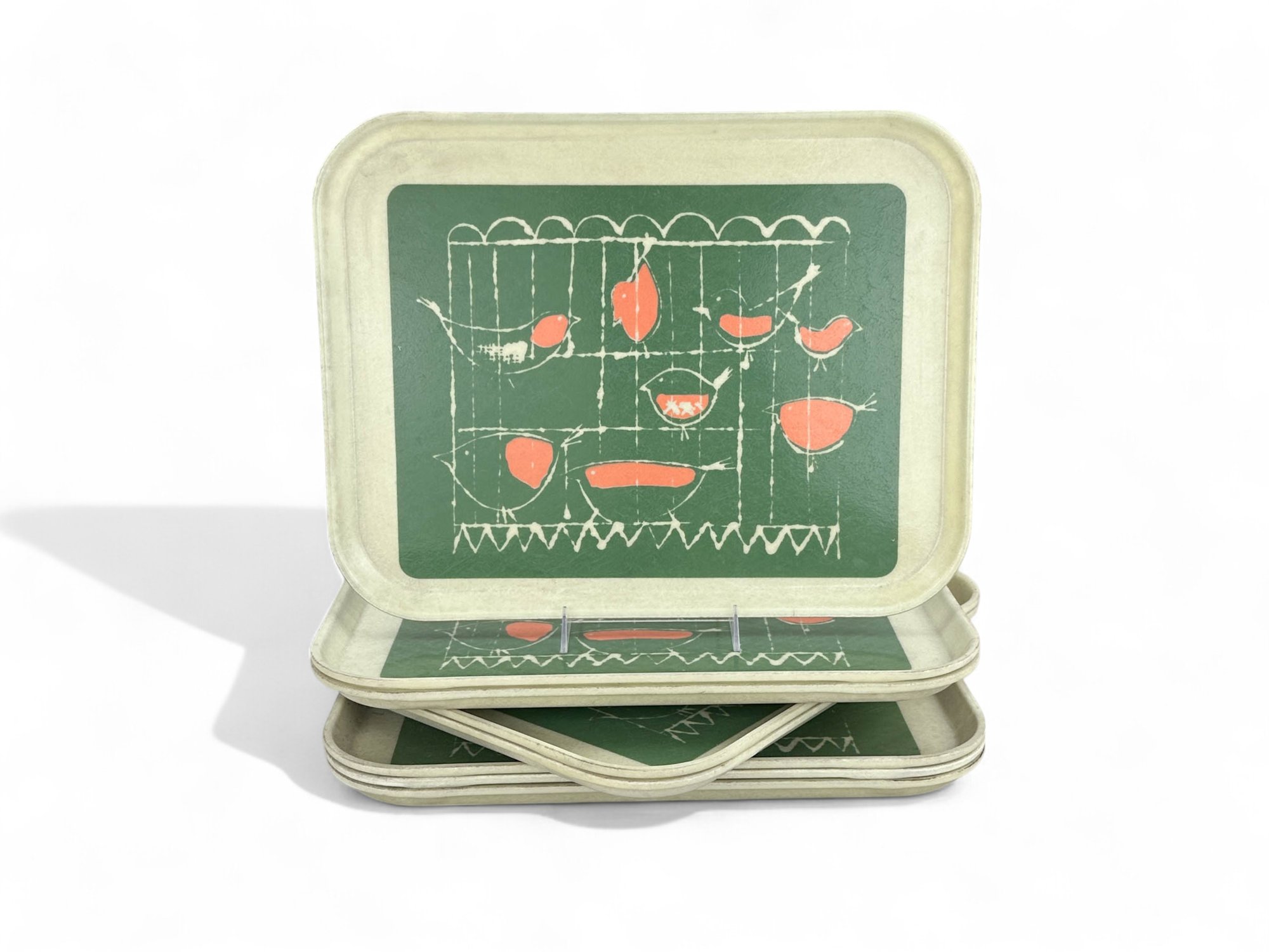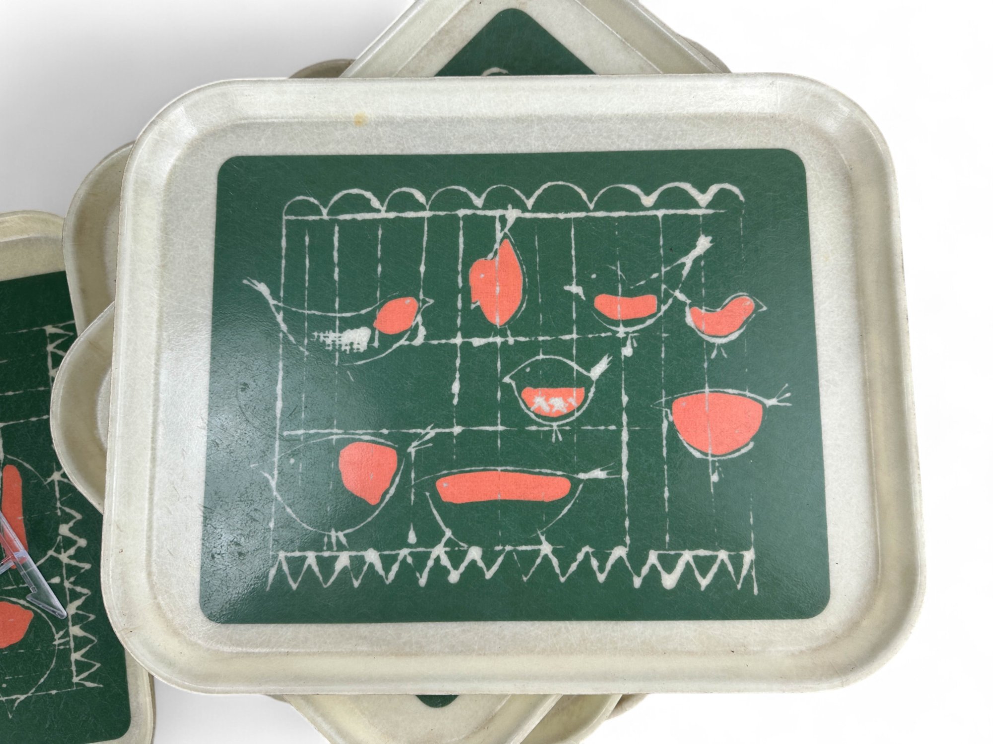 Phenomenal Mid Century Green and Coral pattern on off white fiberglass cambro trays.