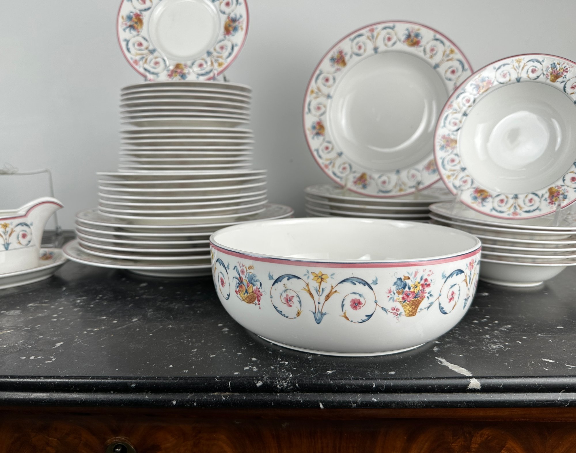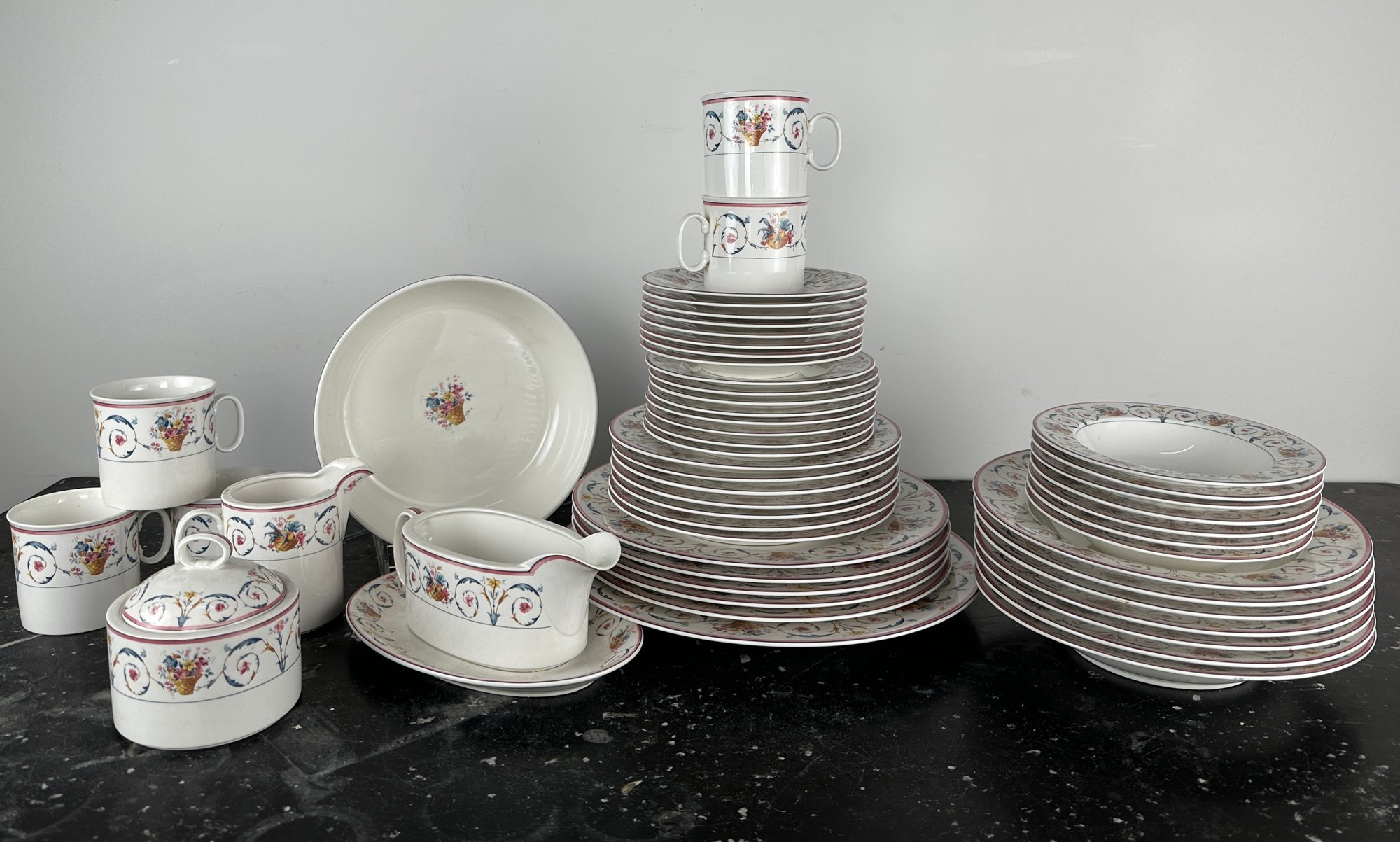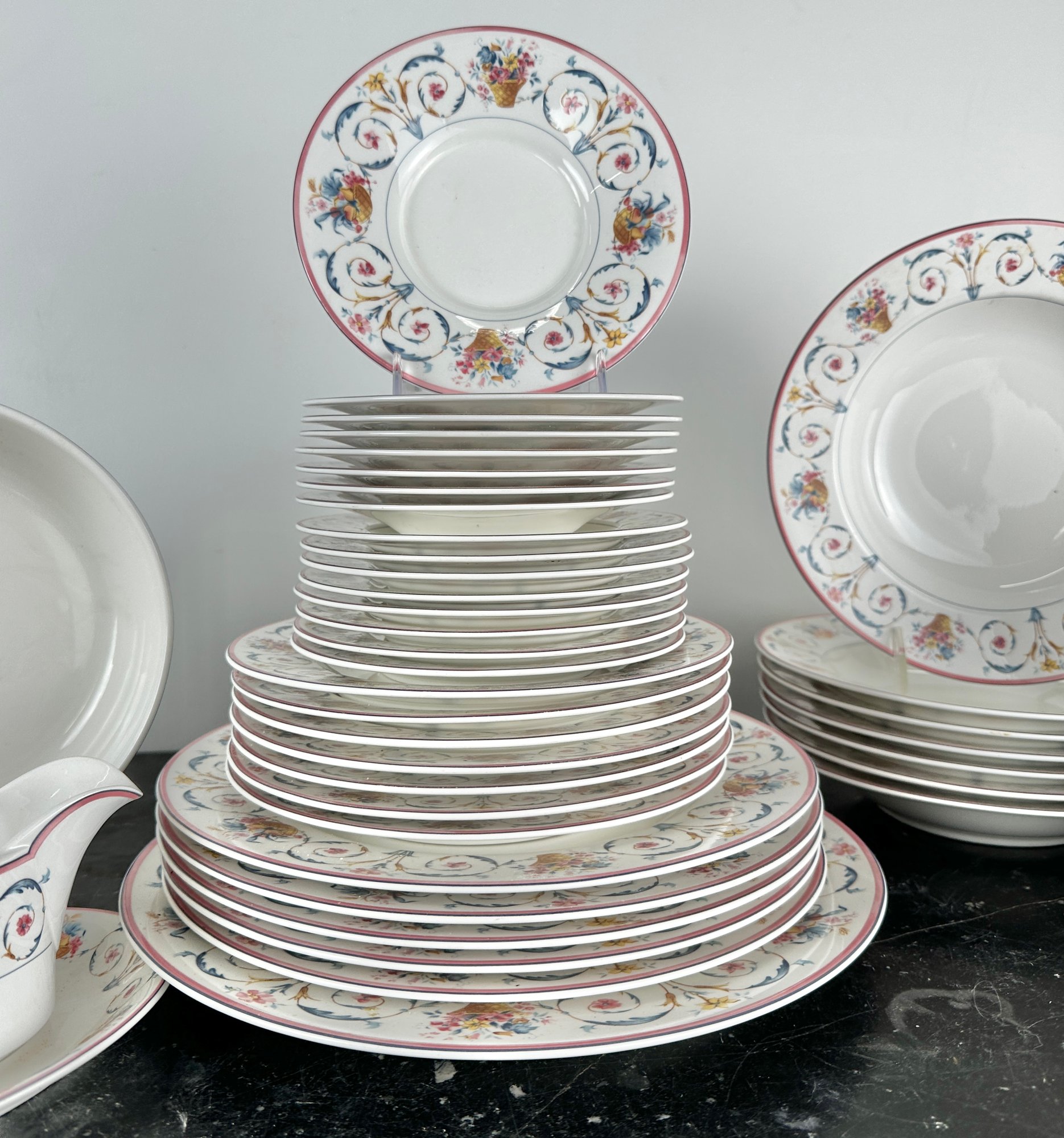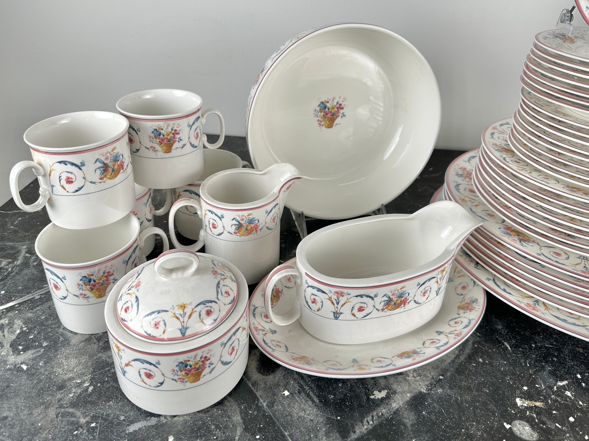 salad and dinner Plates, bowls - 2 sizes, creamer, sugar, ugs, gravy boat and dish, saucers