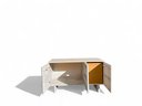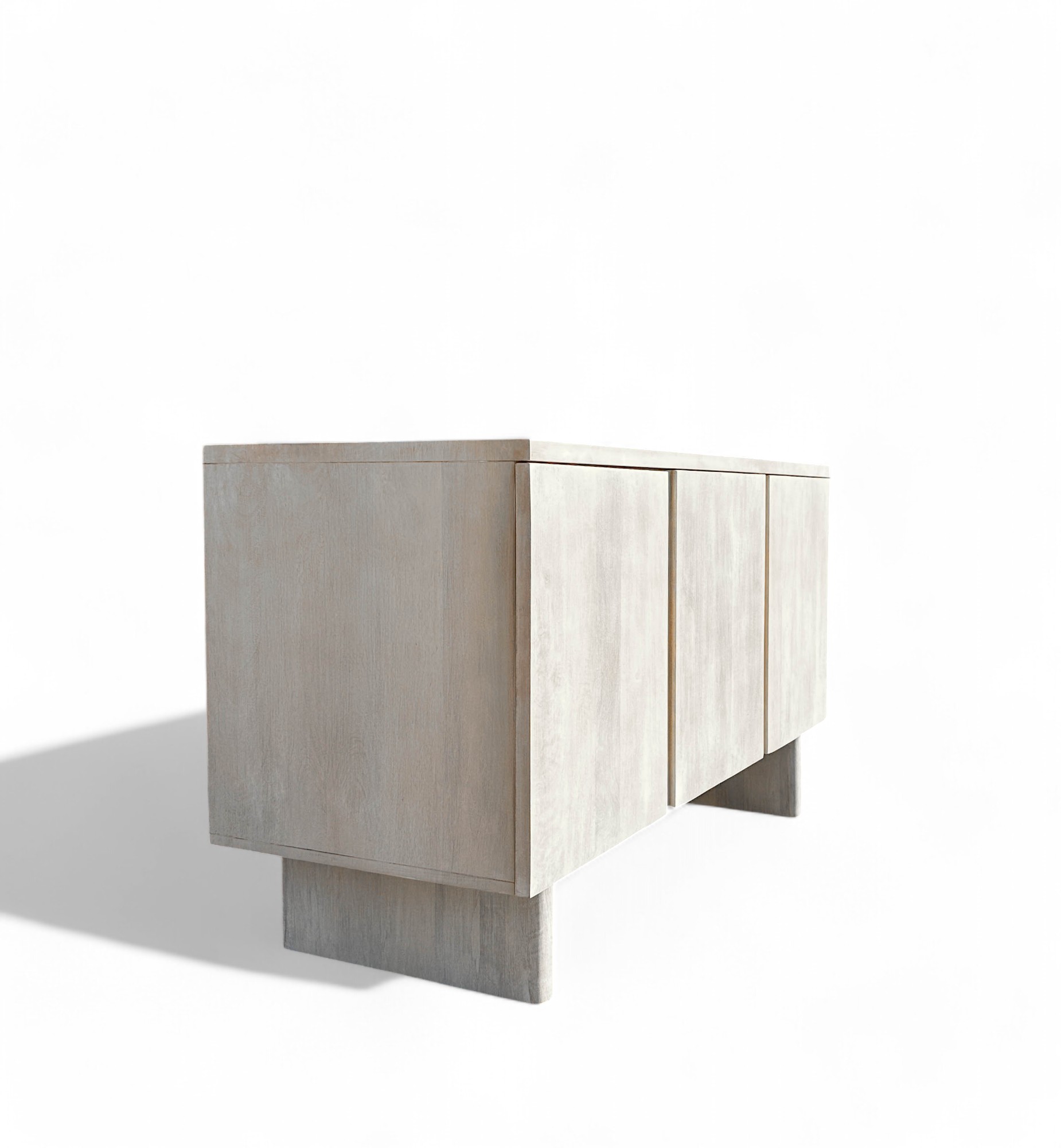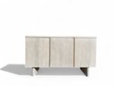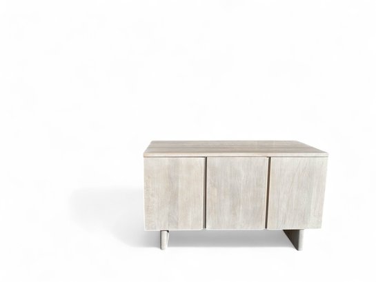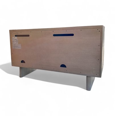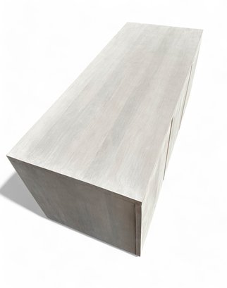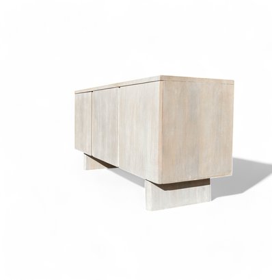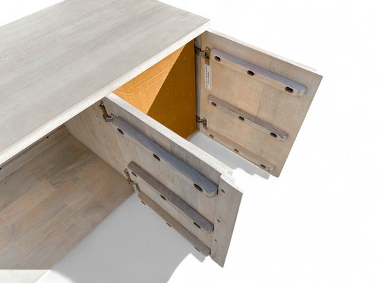 Contemporary buffet or console cabinet made of solid oak in a cerused pale wash by Pottery Barn, from the Cayman product line. Cabinet has two interior shelves and three doors, equipped with a media or cord entry in lower back.