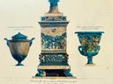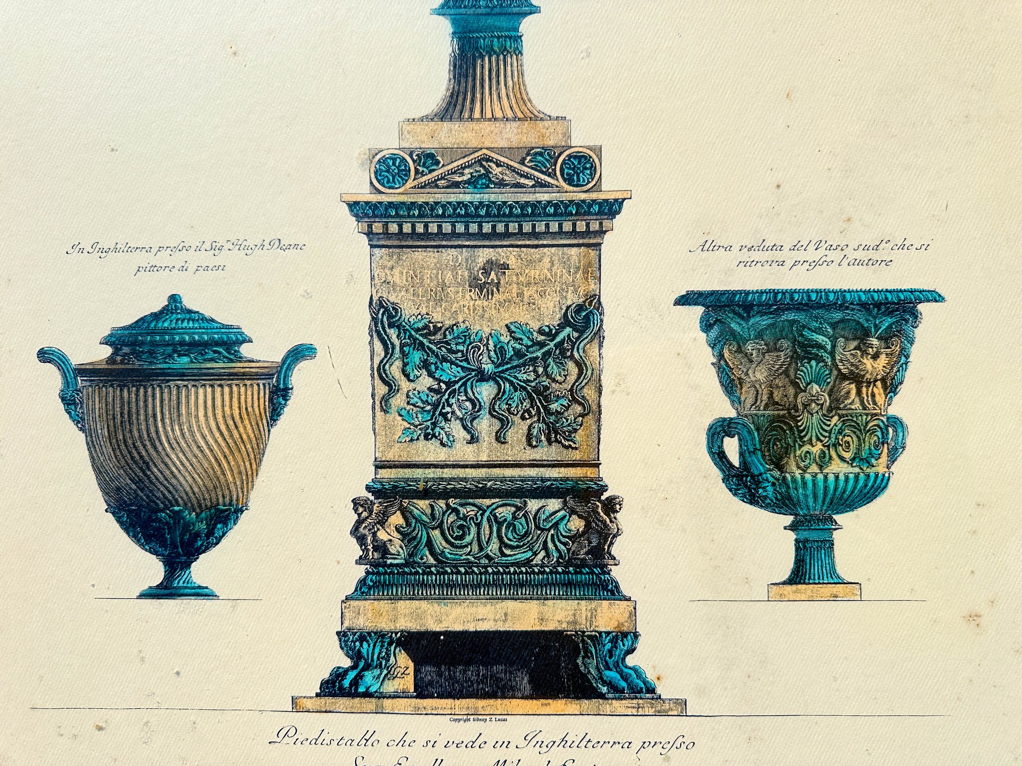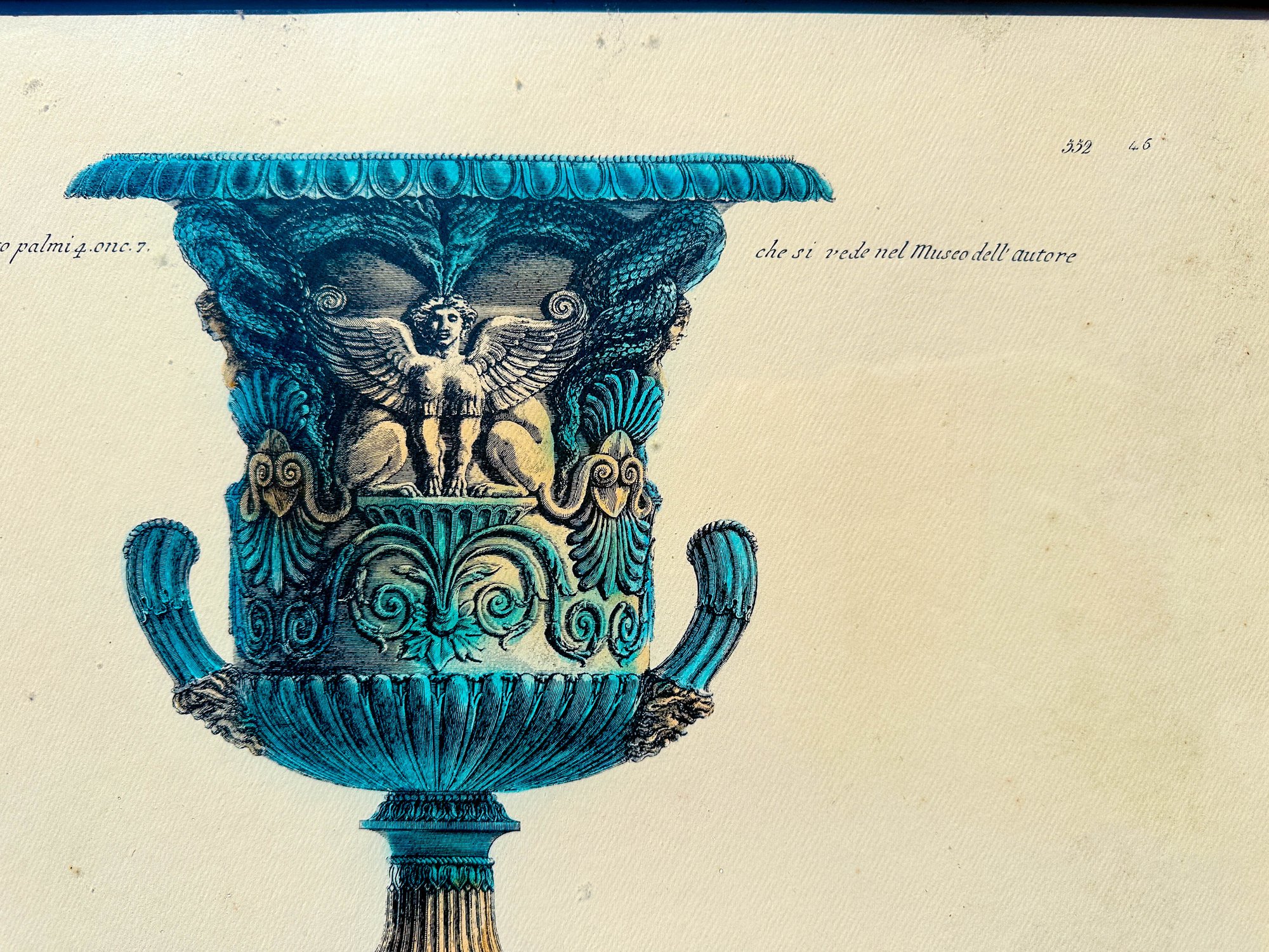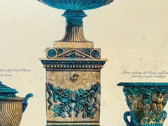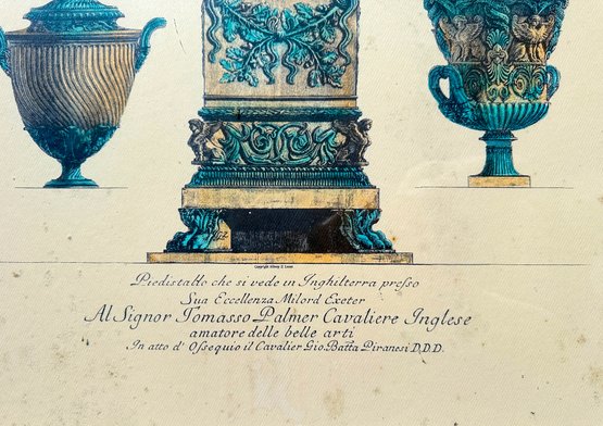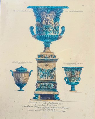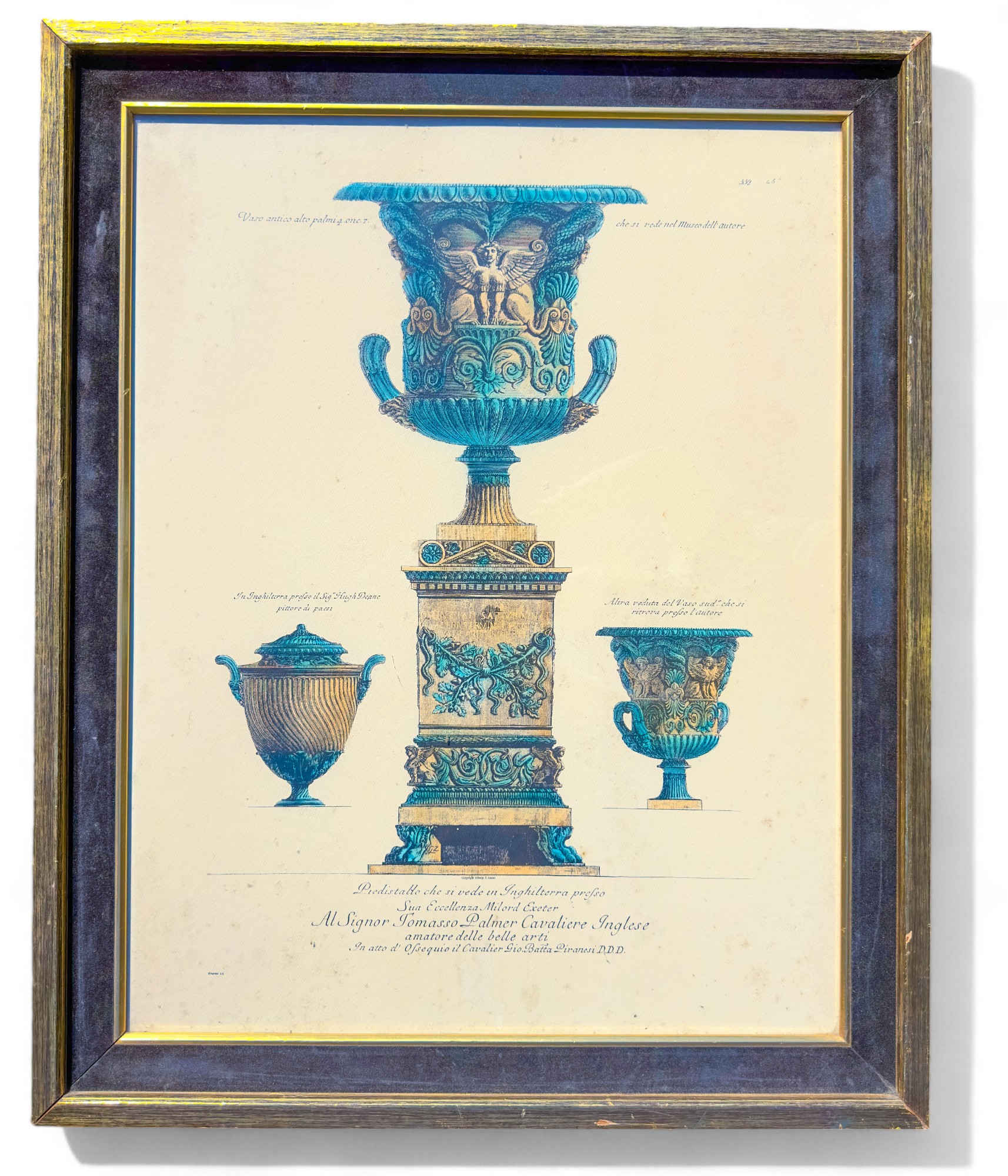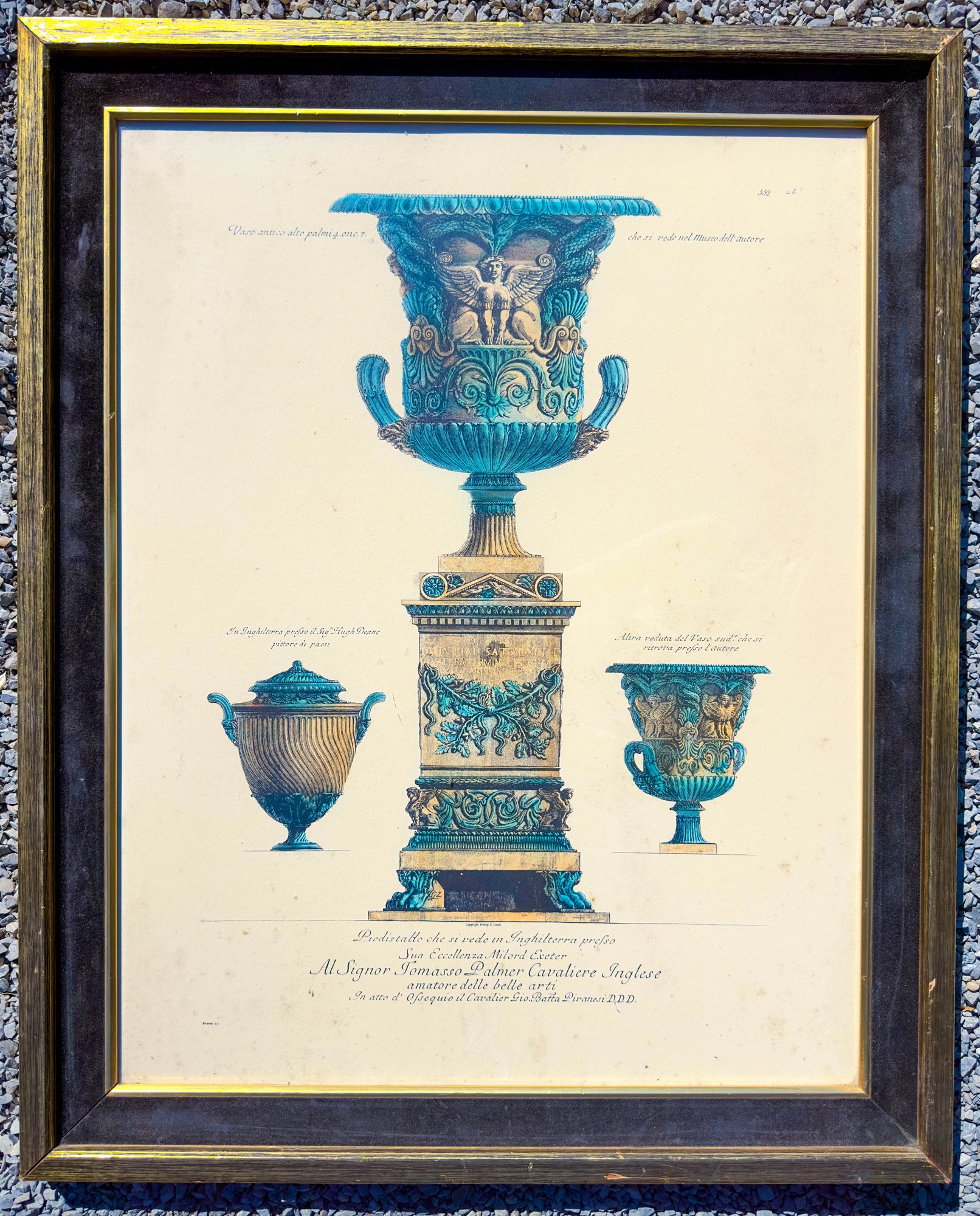 Phenomenally gilt painted wood with a second tier of black velvet trim, for frame around a lush, colored engraving of three Itallian urns.