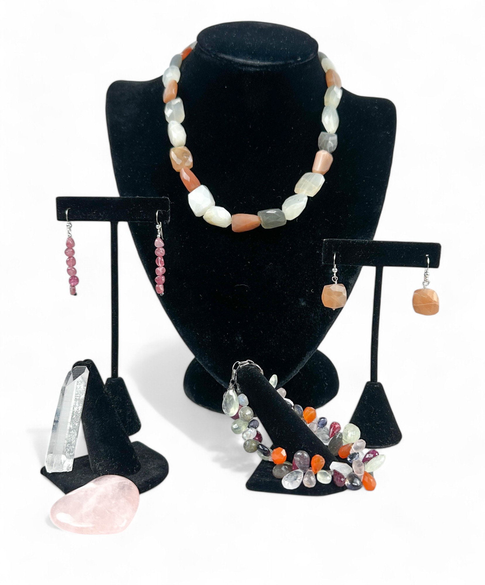 Bracelet, Two Pair of Earrings, Necklace and Two Stone Table Top Accessories (Quartz Heart and Crystal Quartz Rod)