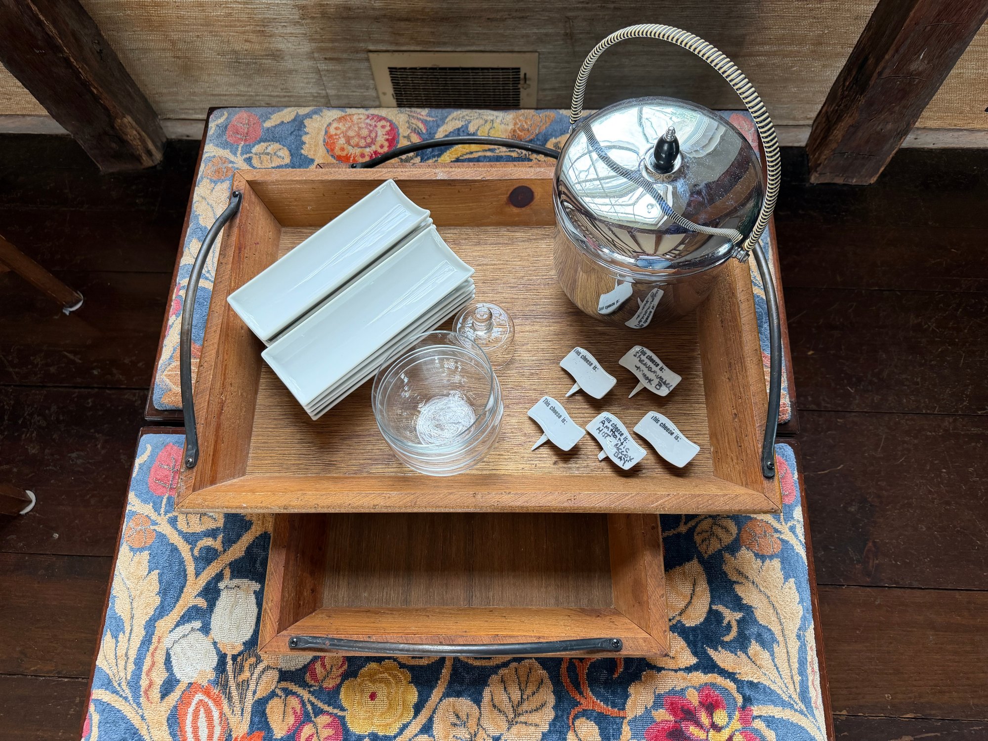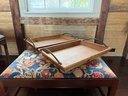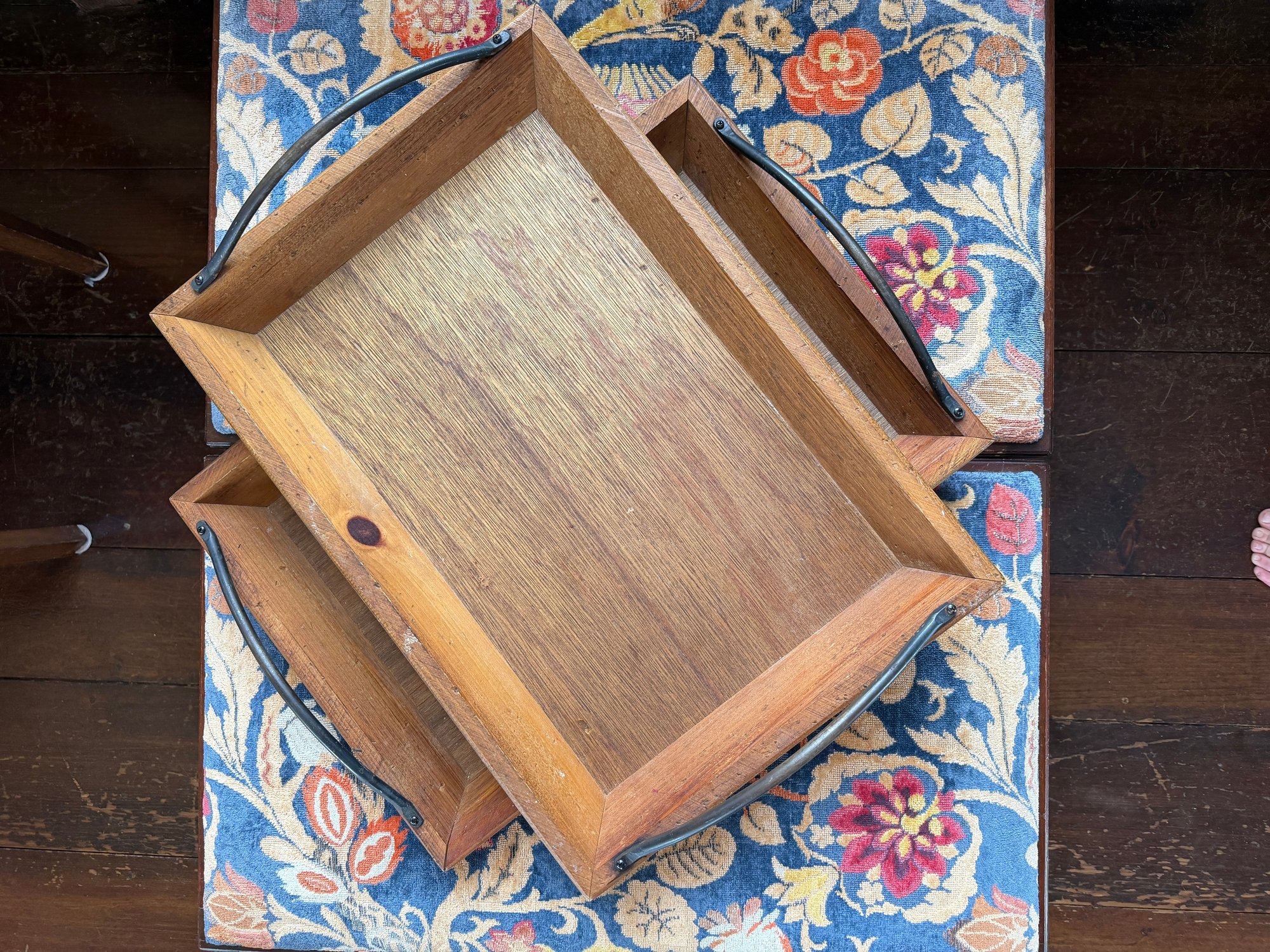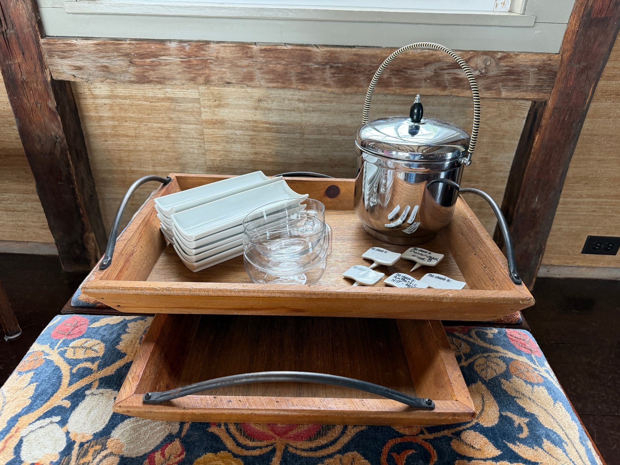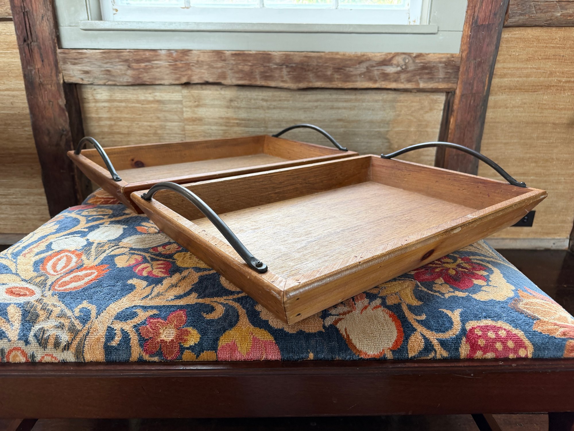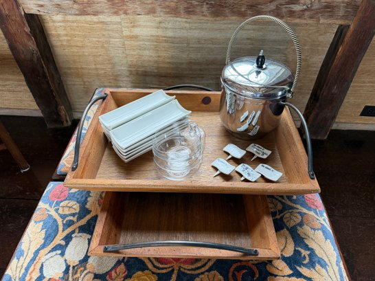 Including: Pine trays with wrought iron strap handles, corn trays, cheese tags, glass bowls, ice bucket and 5 x 21.5 x 15 inches