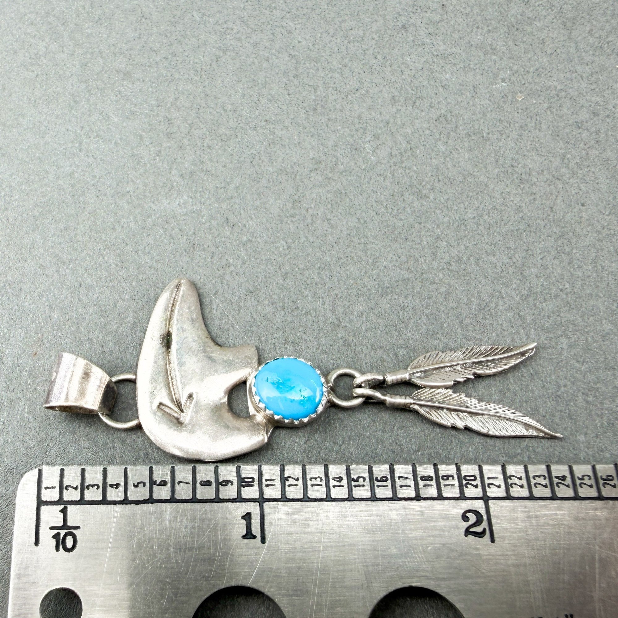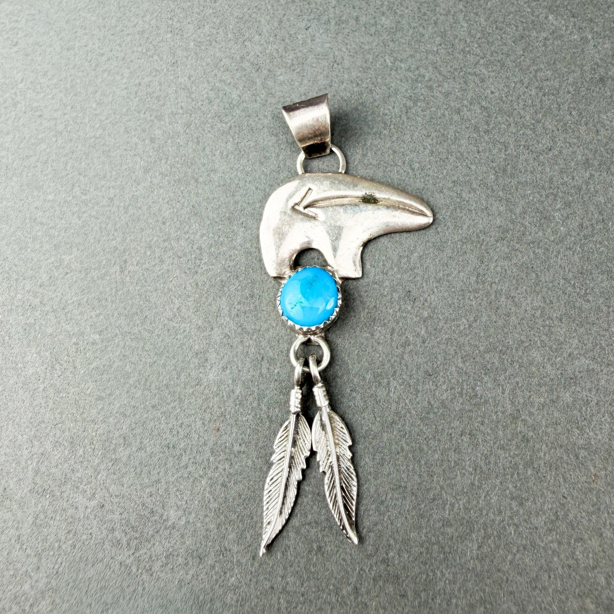 Sam Knee Style Navajo Sterling Silver Bear With Feathers And Turquoise Pendant