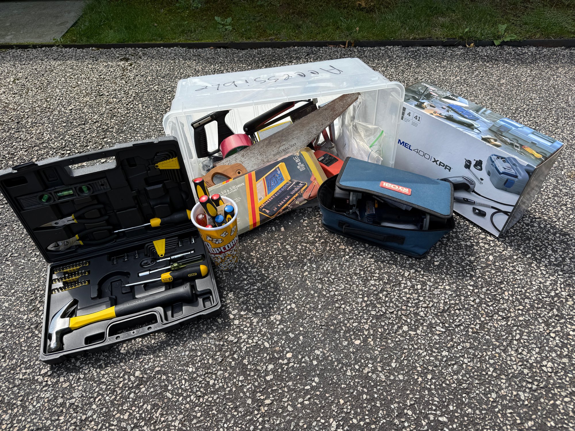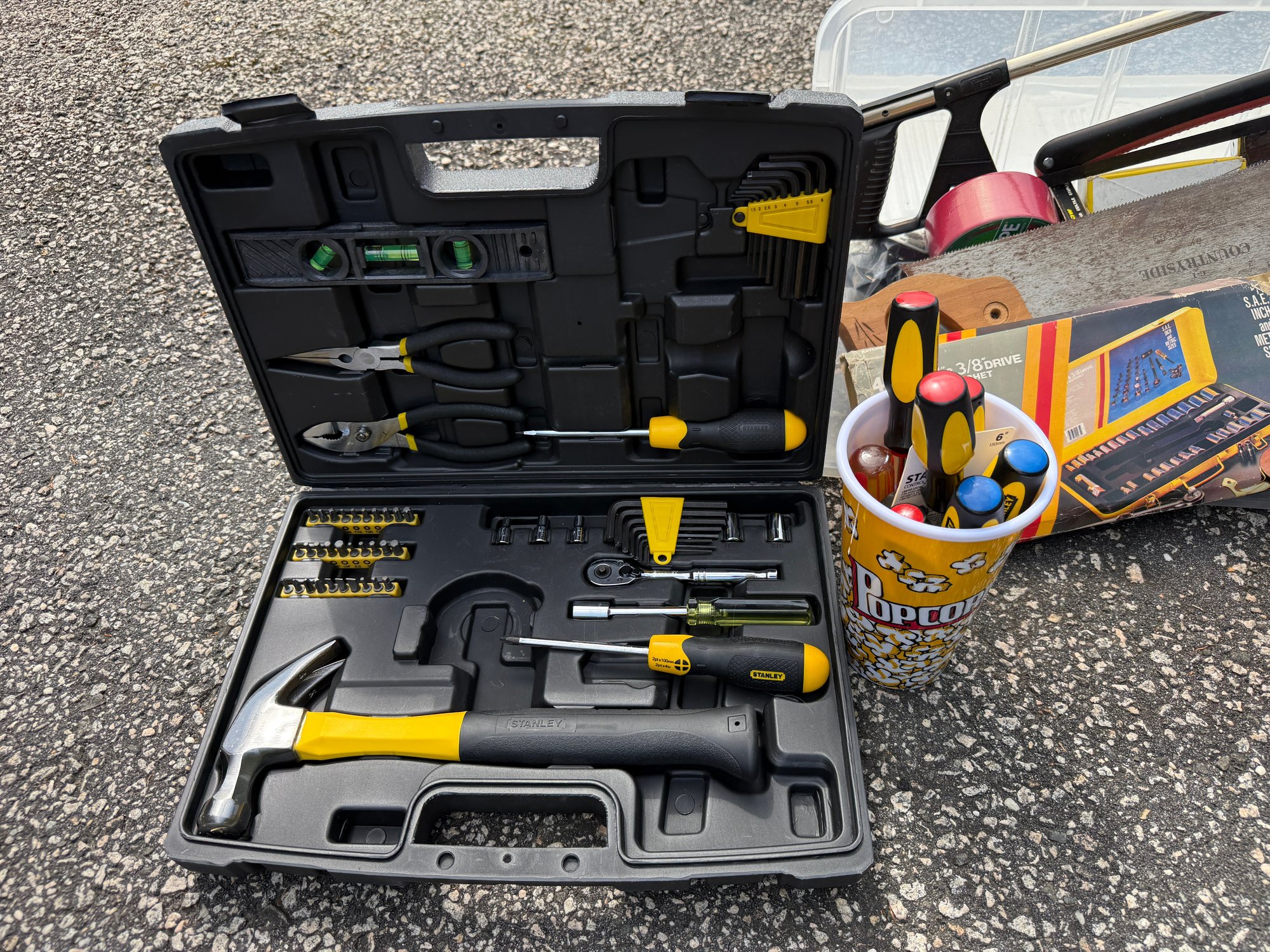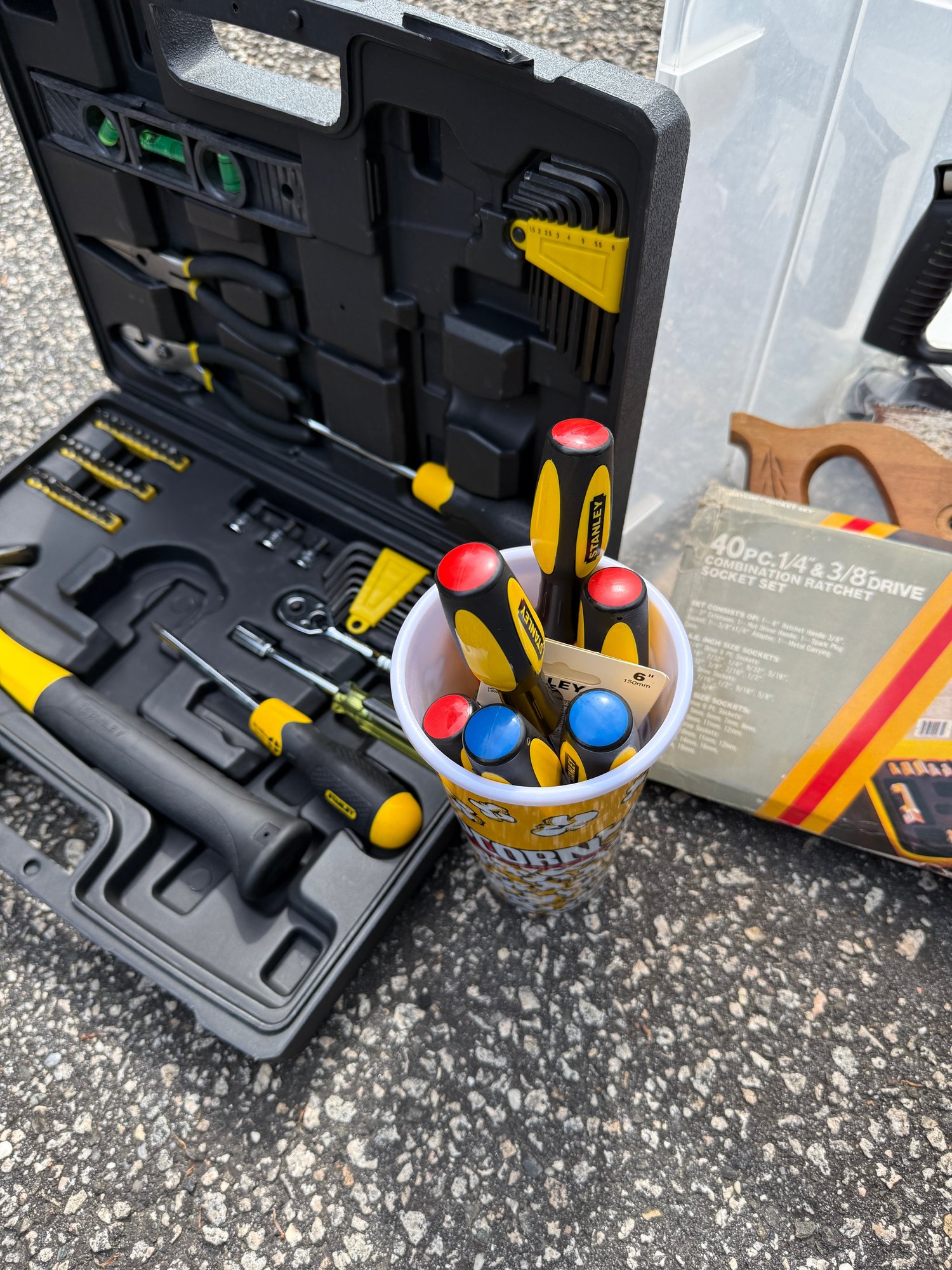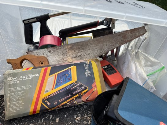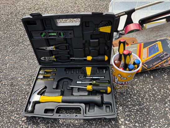 Stanley, Ryobi, hand saw, screw drivers, tape, etc.